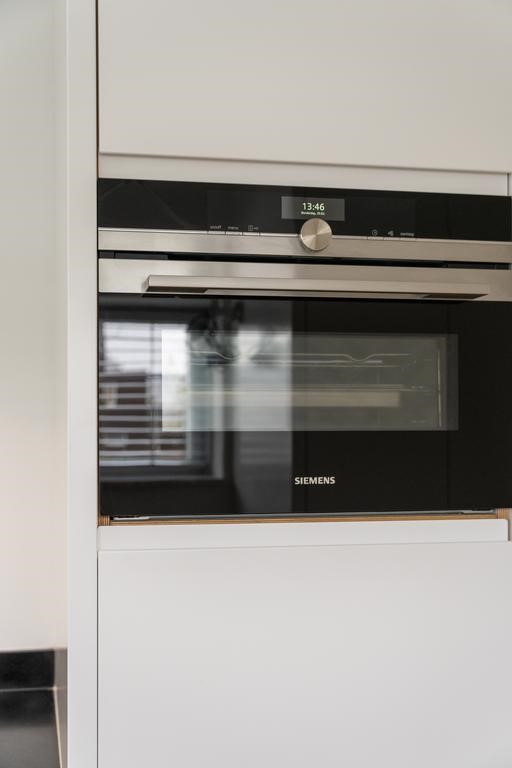 Entrance to the house on the ground floor, leading into a hallway with a guest toilet. The kitchen at the front of the house is equipped with all necessary Siemens built-in appliances. The living room is located at the rear and provides direct access to the garden with shed and rear entrance.
