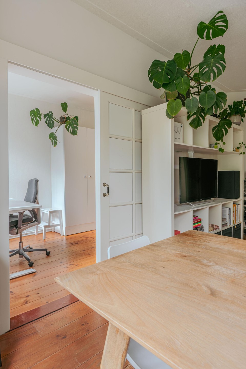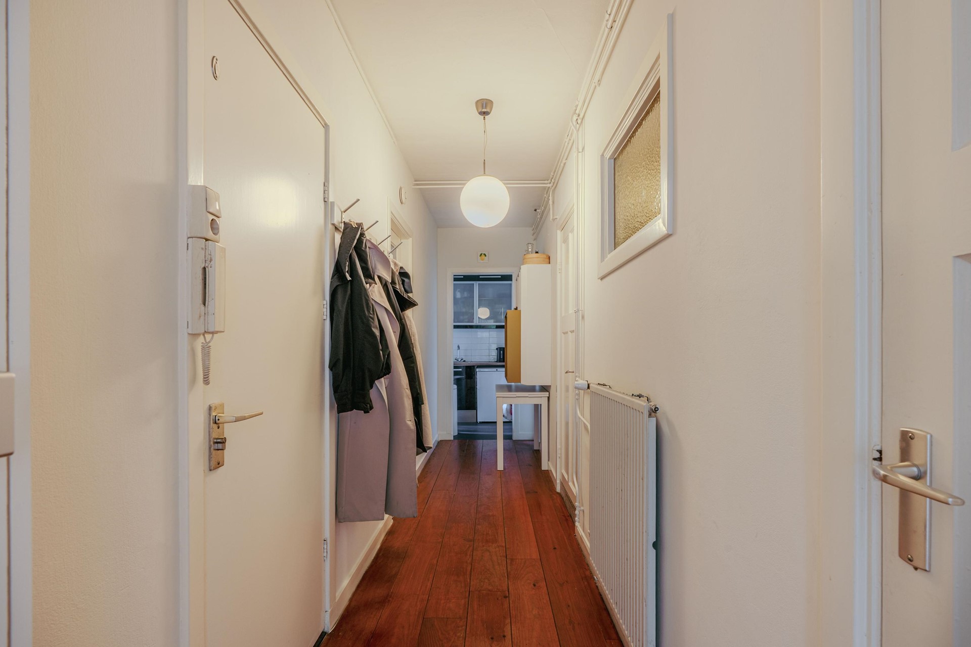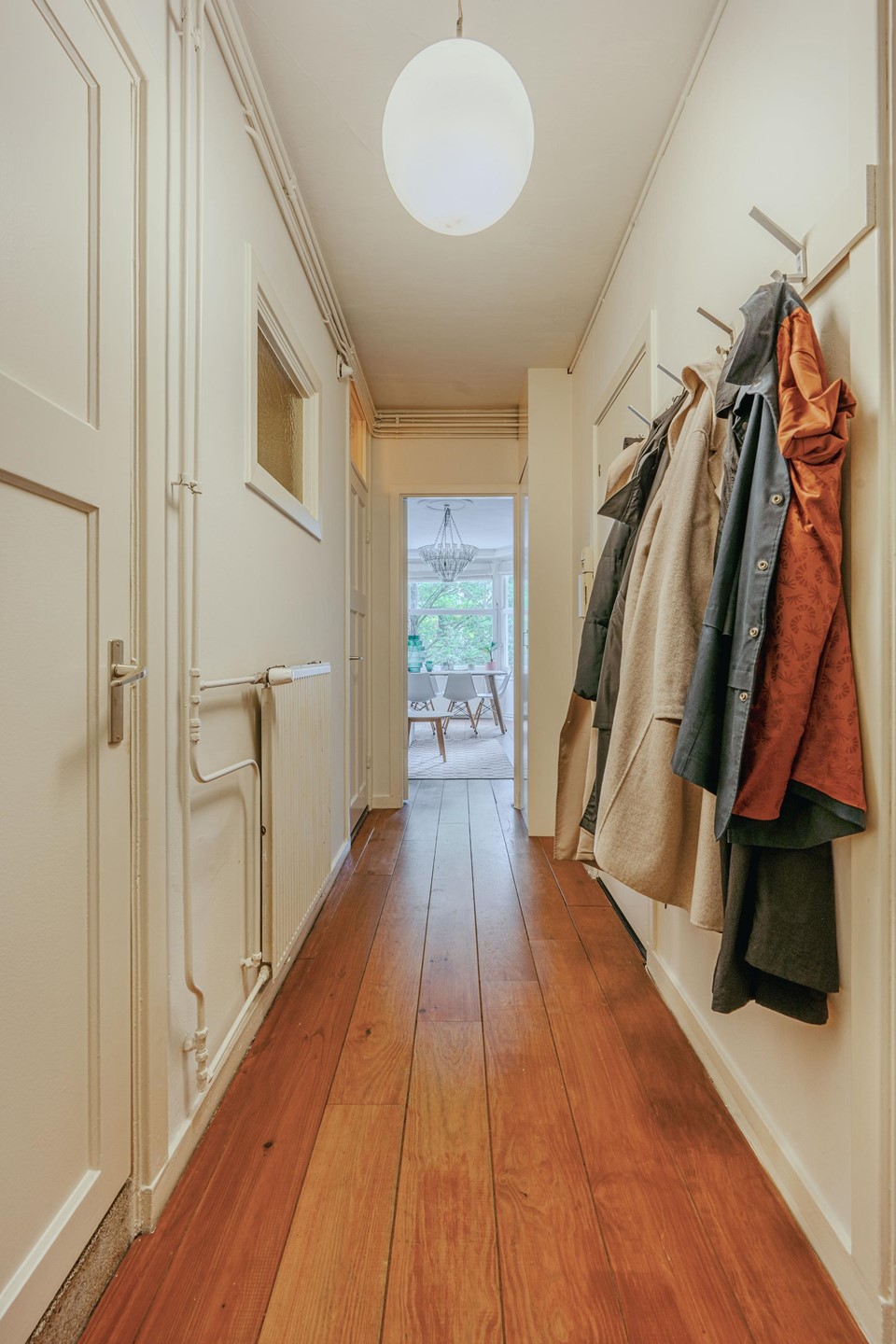 Through the entrance, you enter the spacious hallway with access to all rooms. At the front is the cozy living room with bay window, providing plenty of natural light and a pleasant view of the street. Adjoining is a spacious bedroom.