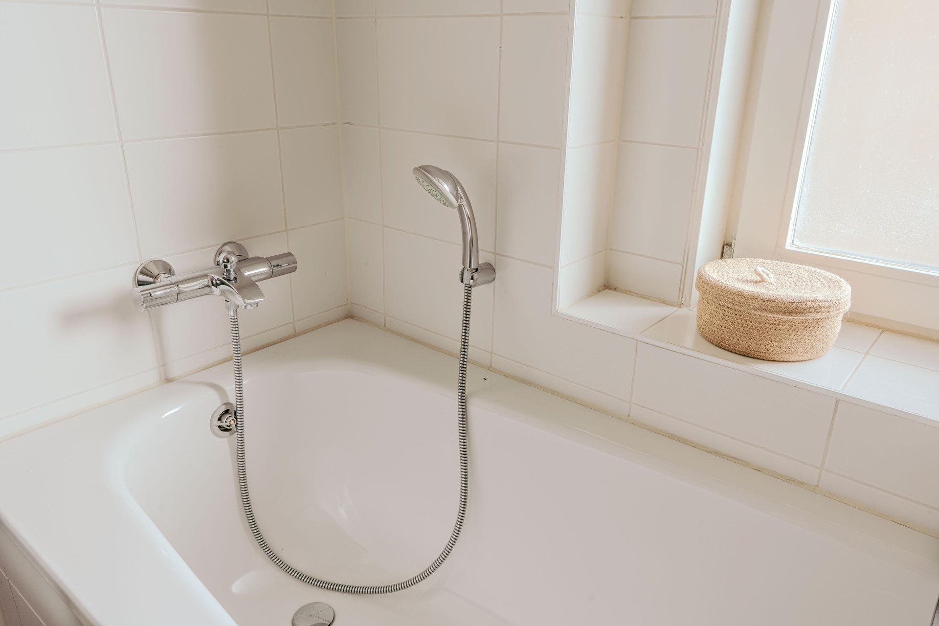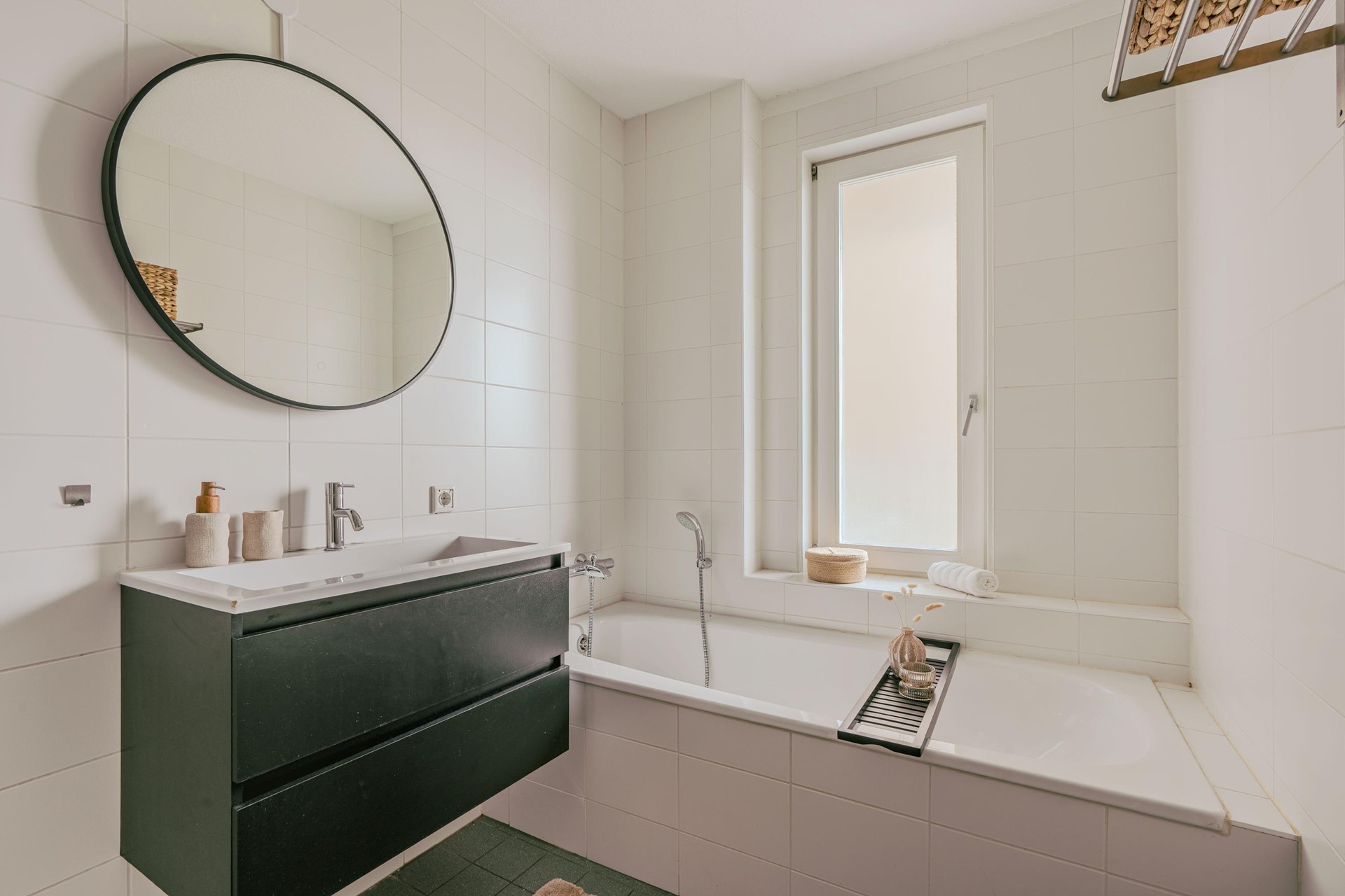 De stijlvolle badkamer is uitgerust met een comfortabel ligbad, een aparte douche en een wastafel. Het toilet bevindt zich separaat, wat extra gemak biedt.