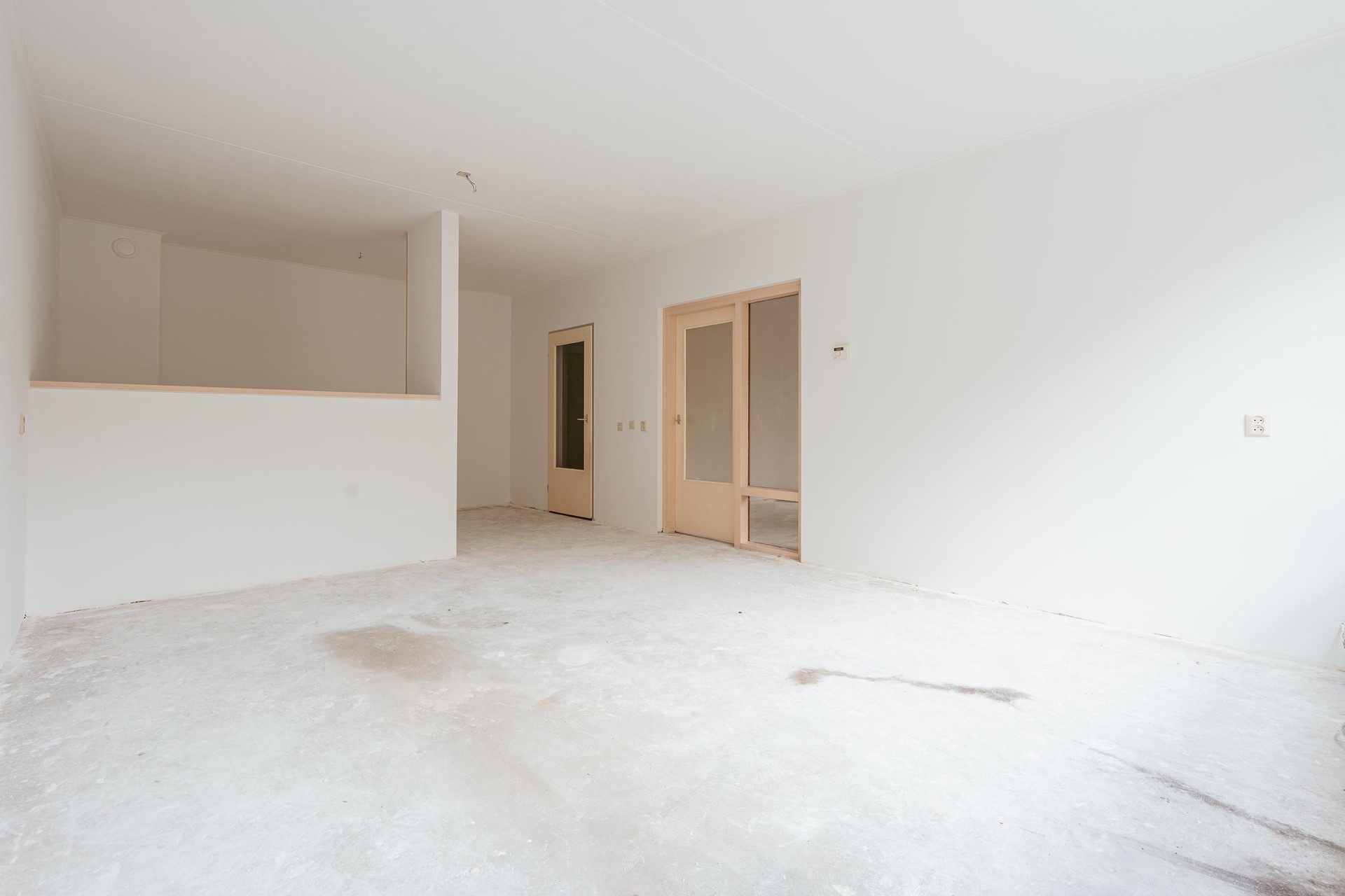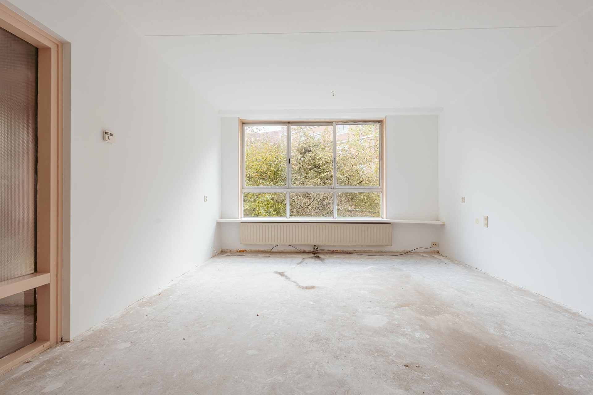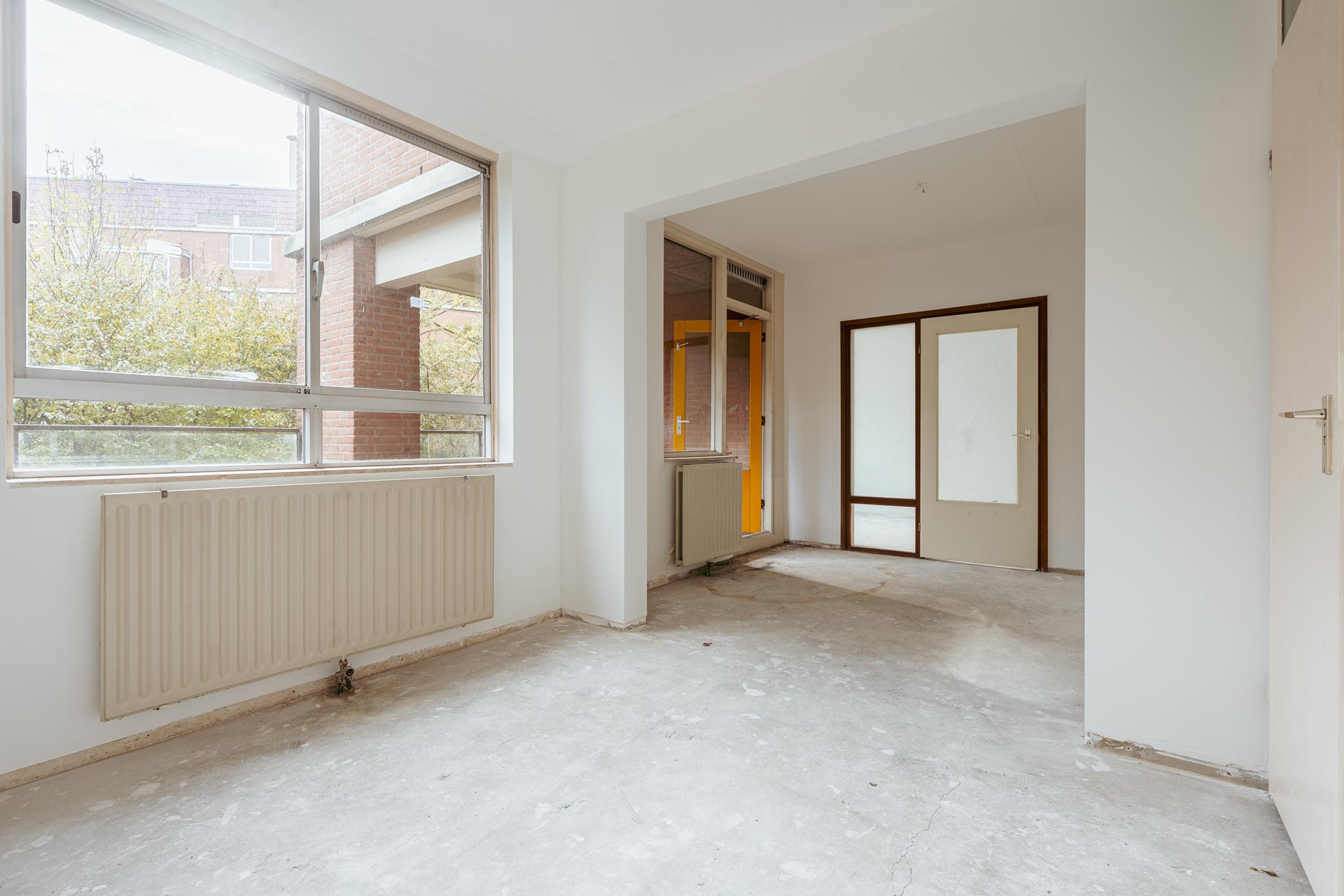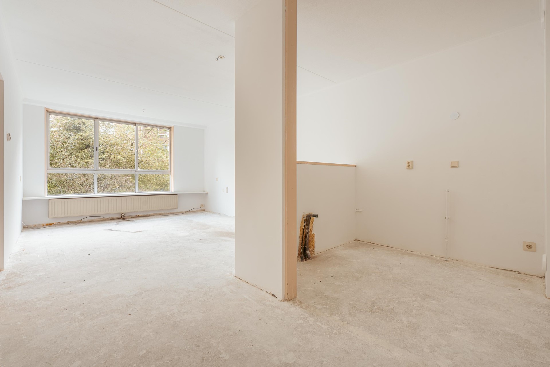 Gelegen op de eerste verdieping. Bij binnenkomst valt direct de prettige indeling van de woning op. Vanuit de hal is er toegang tot alle vertrekken. De woonkamer is ruim en licht dankzij de grote raampartijen, die zorgen voor een aangename, open sfeer. Er is voldoende plek voor een gezellige zit- en eethoek, en de ruimte leent zich uitstekend om geheel naar eigen smaak in te richten.