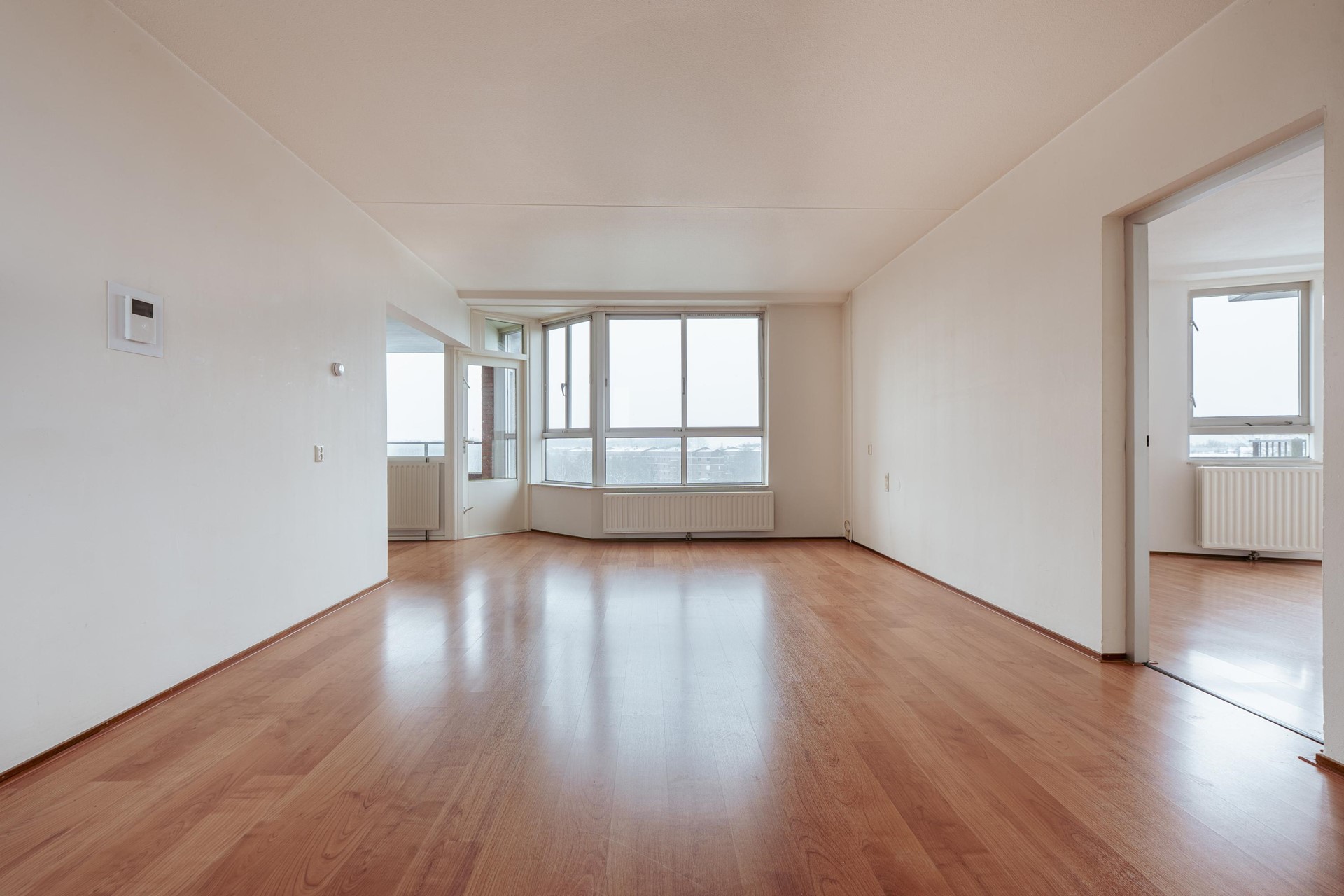 De keuken is praktisch ingericht en grenst eveneens aan een balkon, wat zorgt voor extra licht en ventilatie. De woning beschikt over meerdere slaapkamers, geschikt als hoofd-, kinder-, werk- of logeerkamer. Dankzij de variatie in grootte en vorm zijn de kamers flexibel in te delen.