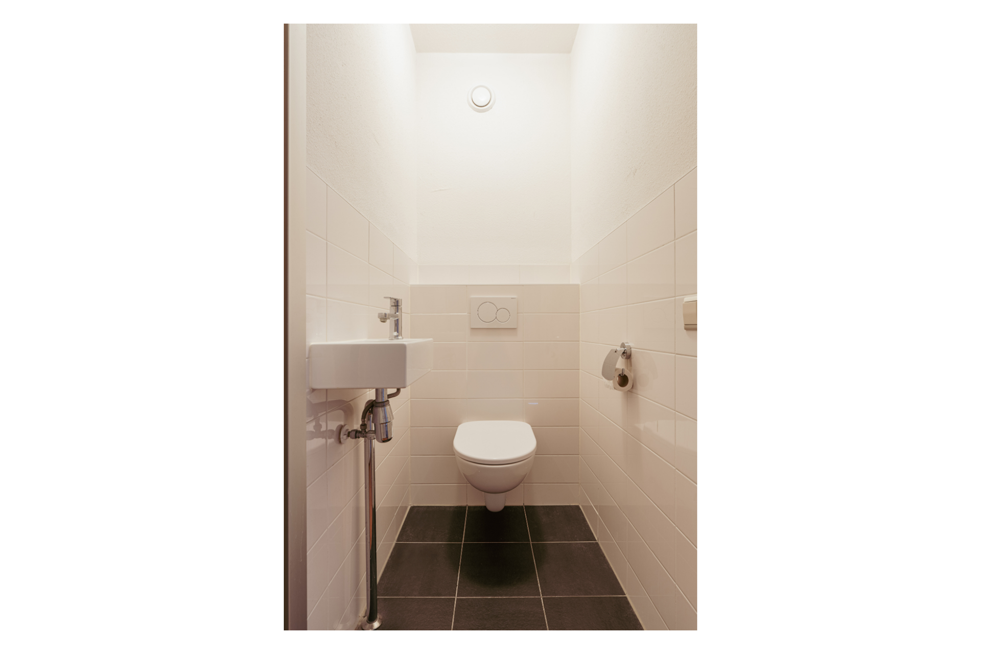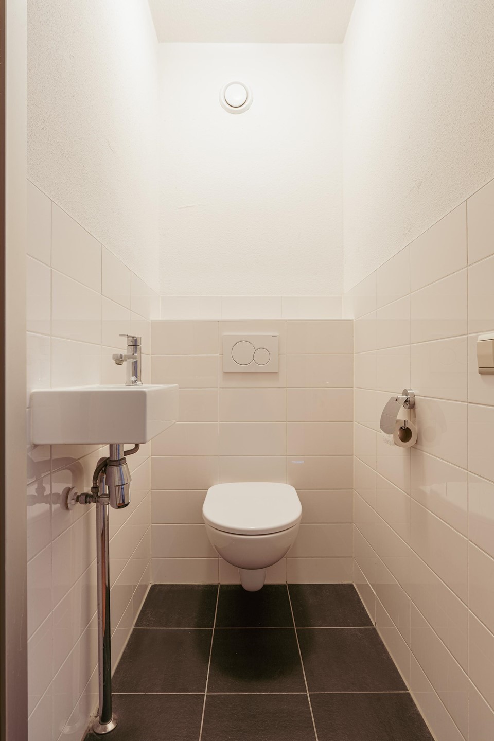 The centrally located bathroom is fitted with a bathtub and washbasin. In addition, there is a separate toilet and a convenient internal storage cupboard.