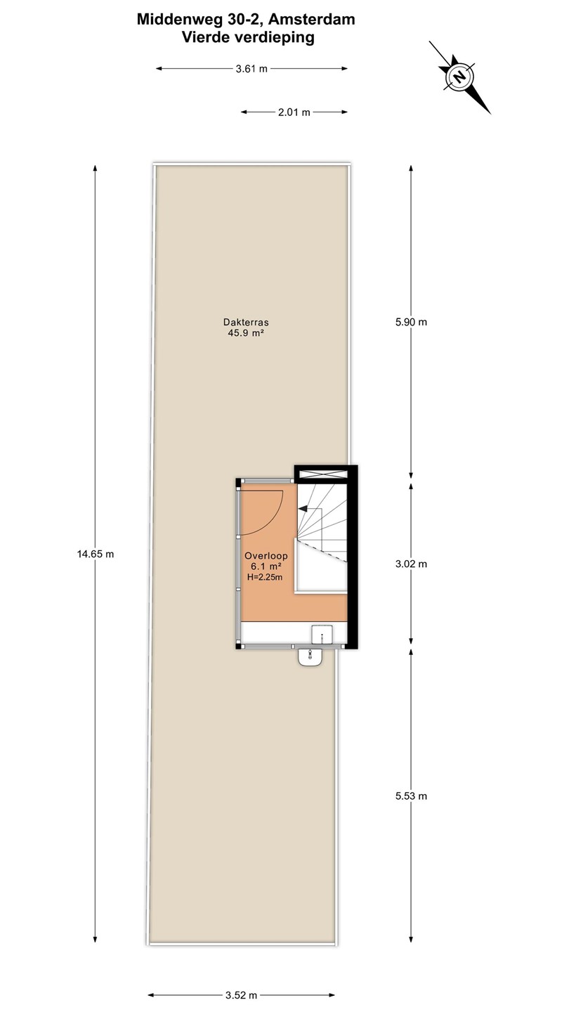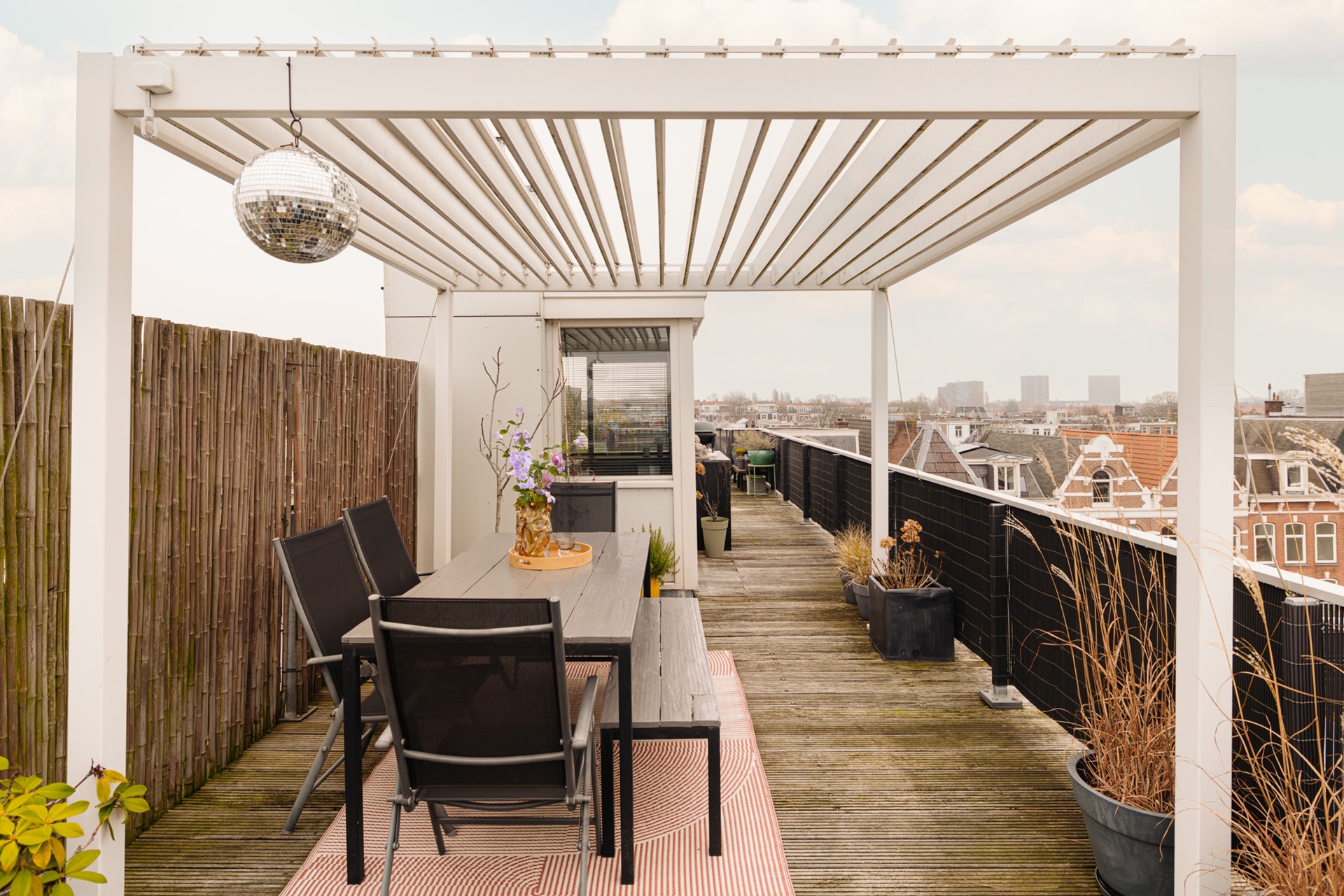Via de dakopbouw bereik je het dakterras van ca. 47 m². Hier geniet je in alle rust van de zon, met weids uitzicht over de stad. Een plek die het huis een extra dimensie geeft en waar lange zomeravonden gegarandeerd zijn.
