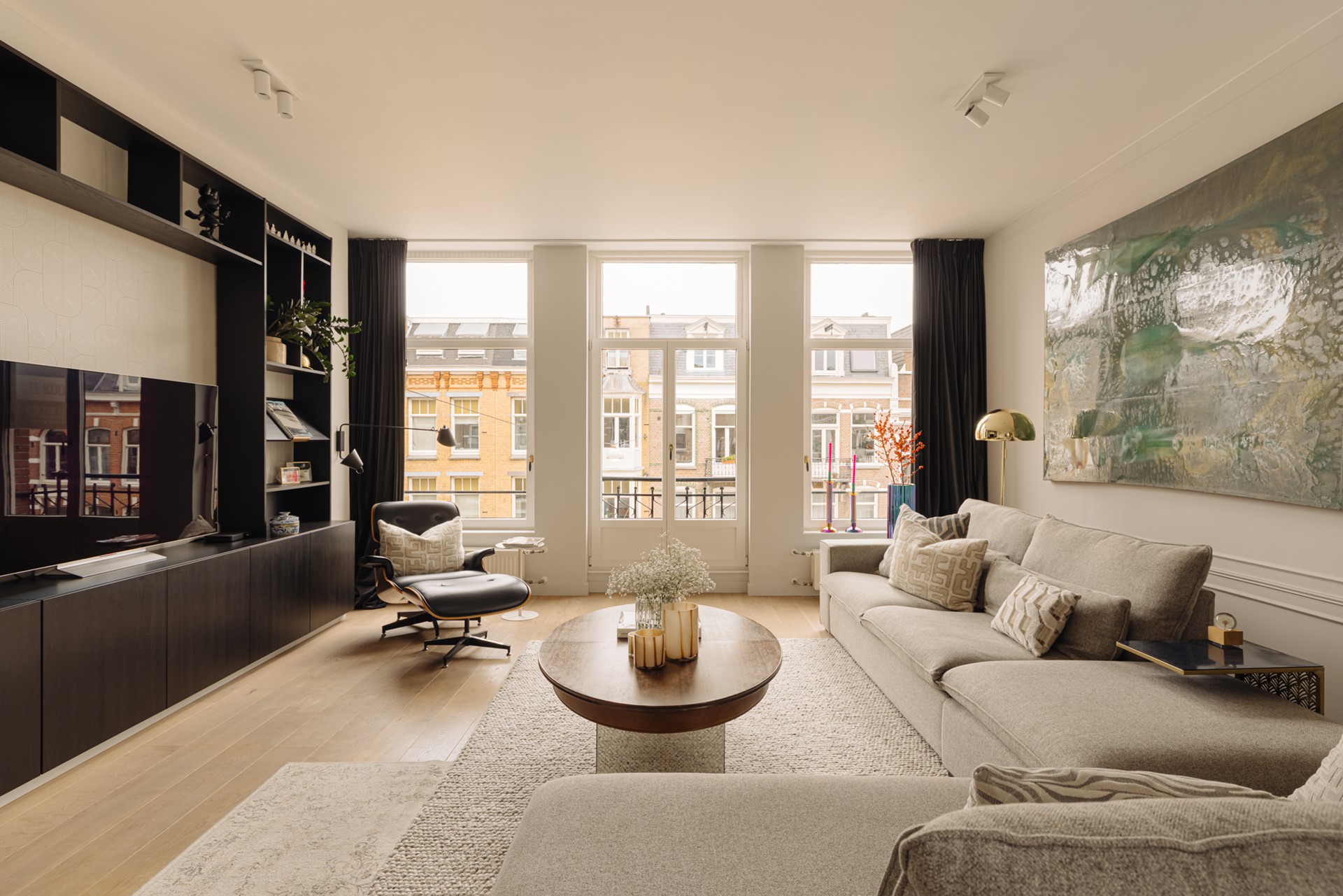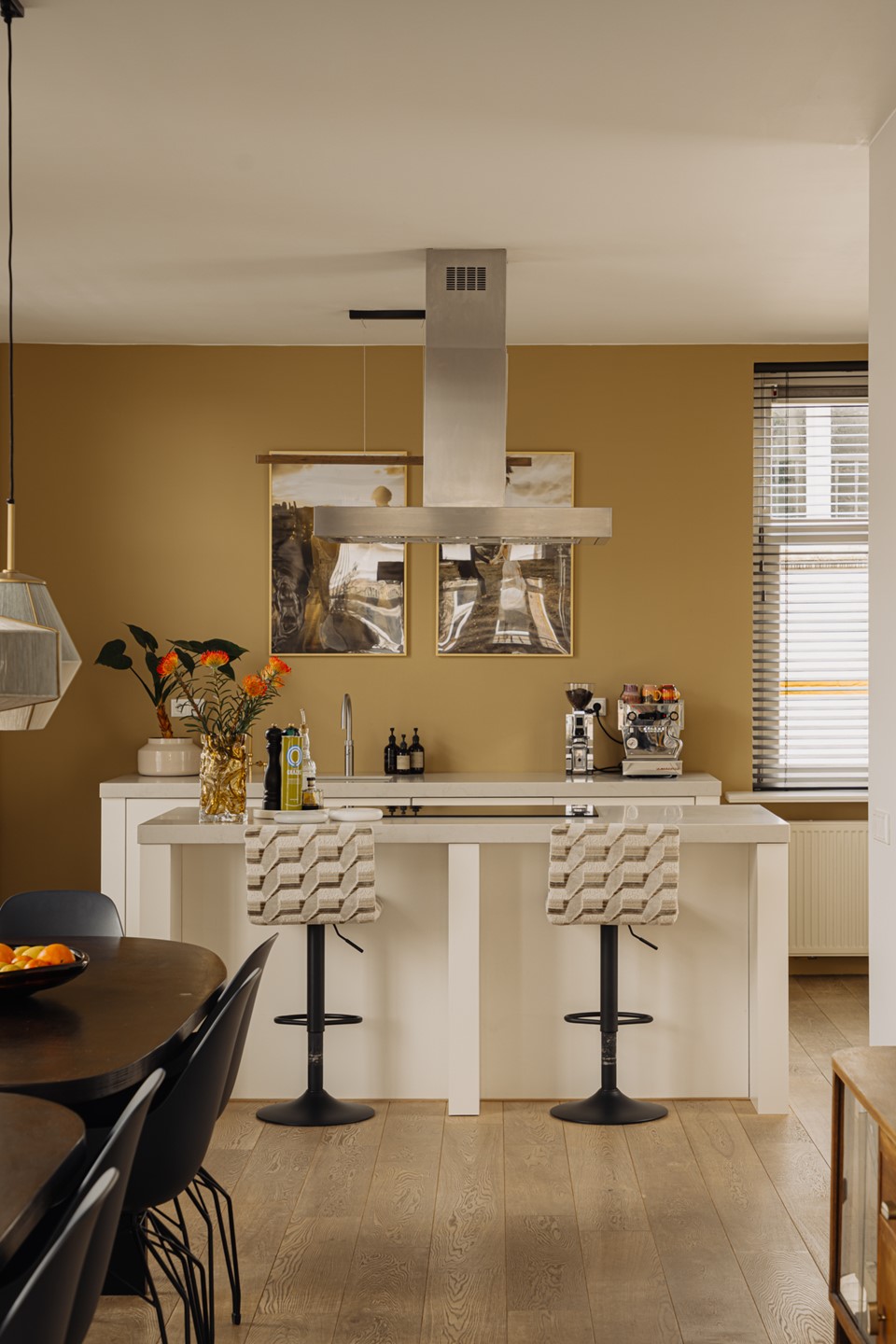 De tweede verdieping is ingericht als riante leefruimte. Grote raampartijen zorgen voor een open en lichte sfeer. De moderne keuken is voorzien van een kookeiland en hoogwaardige inbouwapparatuur – een centrale plek voor wie van koken en gezellig tafelen houdt. De ruimte is ruimtelijk opgezet en biedt volop mogelijkheden voor zowel een royale eethoek als een comfortabele zithoek.