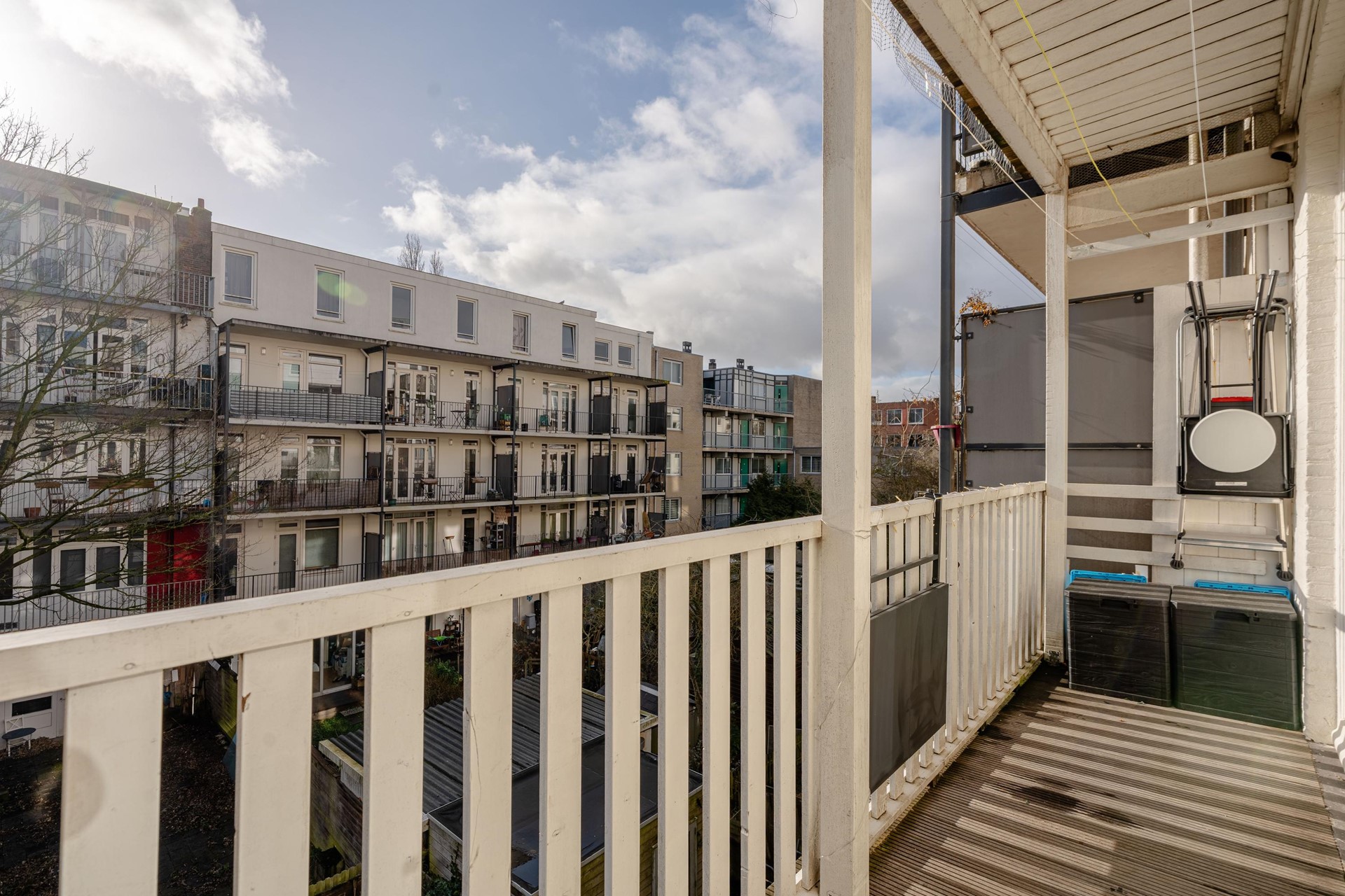 Aan de achterzijde (zuidkant) ligt een prettig balkon waar je volop van de zon kunt genieten. Door de grote raampartijen aan zowel de voor- als achterzijde profiteert het appartement van een mooi doorzon-effect: het blijft de hele dag door opvallend licht.