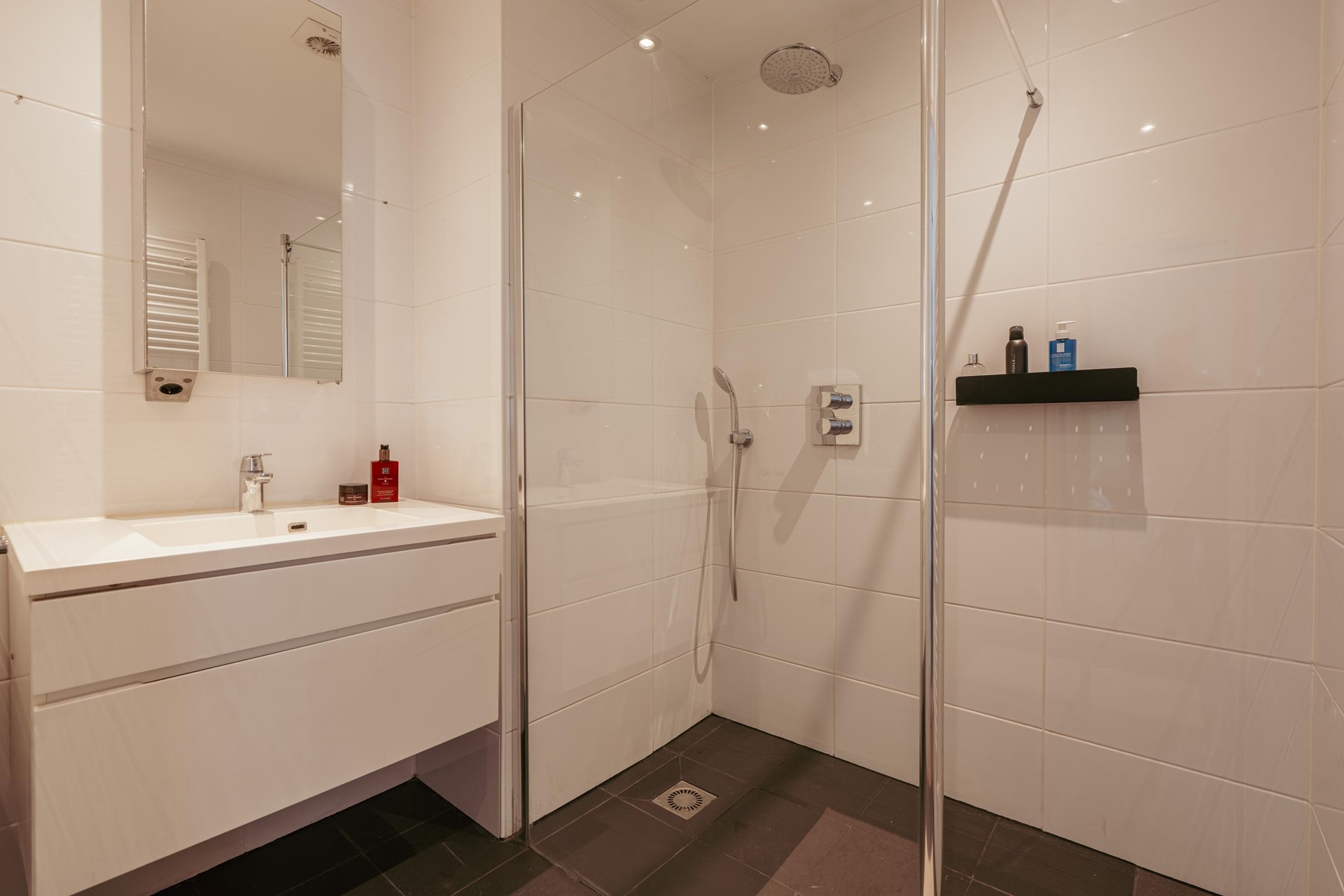 De badkamer is ruim en slim ingericht. Met een inloop-regendouche en strak weggewerkte, ingebouwde kranen heeft deze een moderne “less is more” uitstraling. Het toilet bevindt zich separaat, naast de entree.