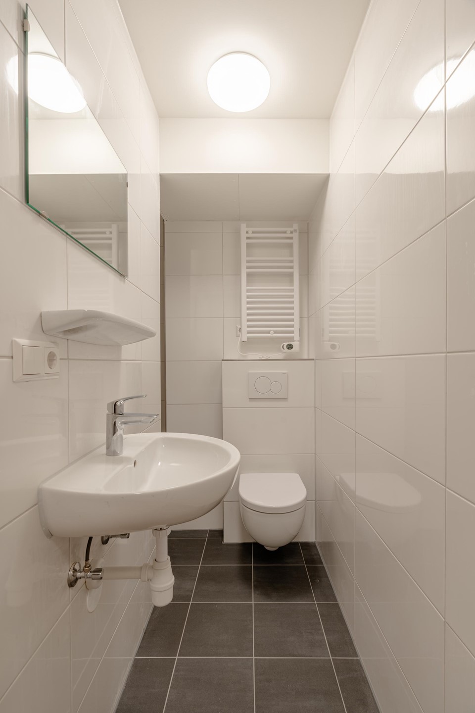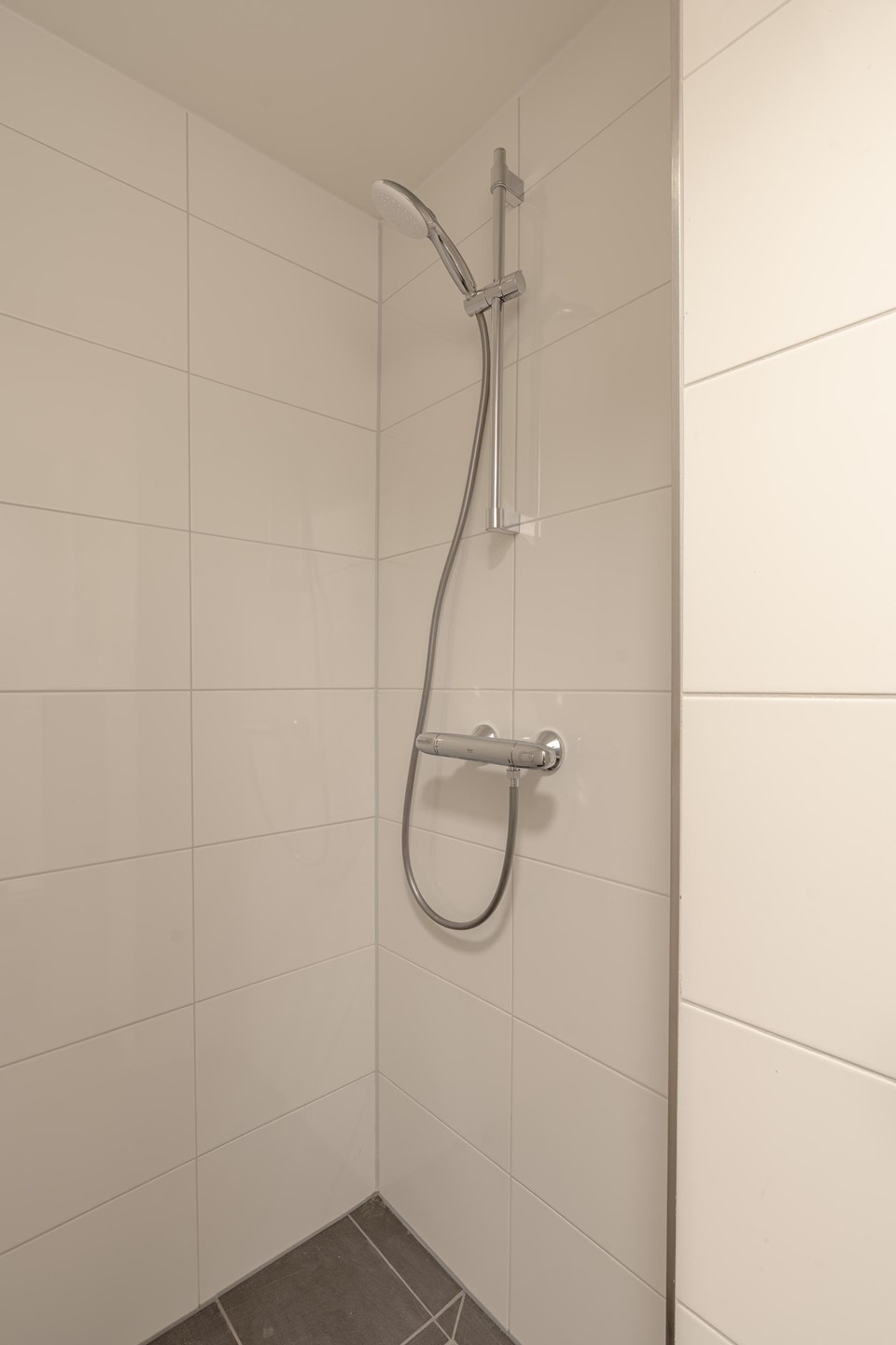 De badkamer is strak afgewerkt en voorzien van douche, wastafel en toilet.