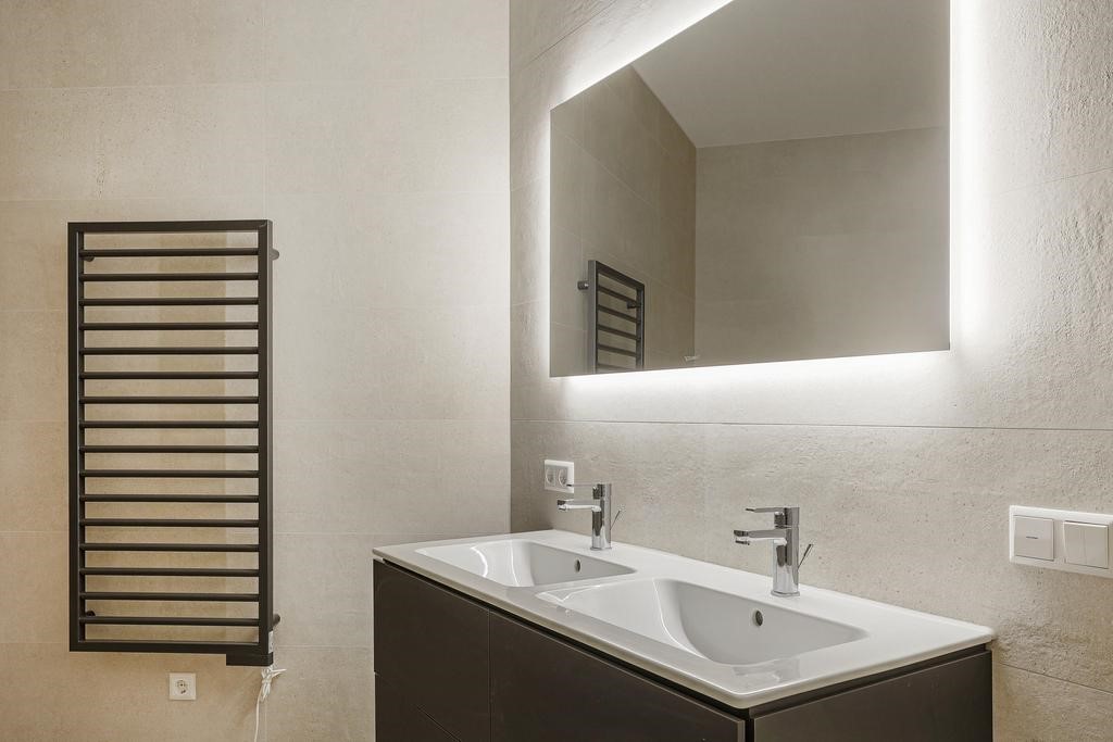 The two bedrooms are also pleasant spaces to relax. The master bedroom includes a walk-in closet and enough space for a double bed and other furniture. In the bathroom, you can refresh yourself with the spacious walk-in shower and double sink. The design radiator and full tiling make it a stylish whole.