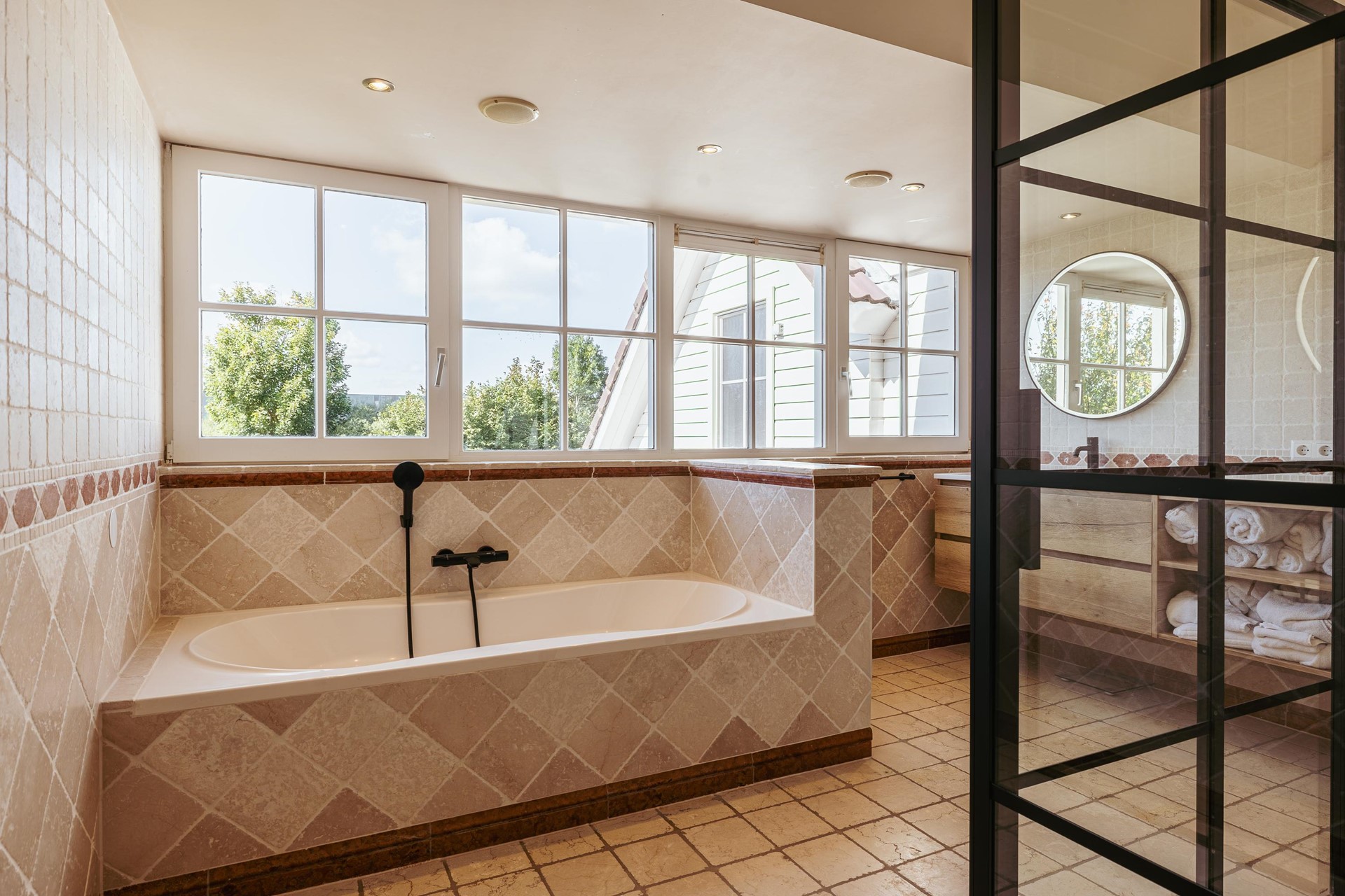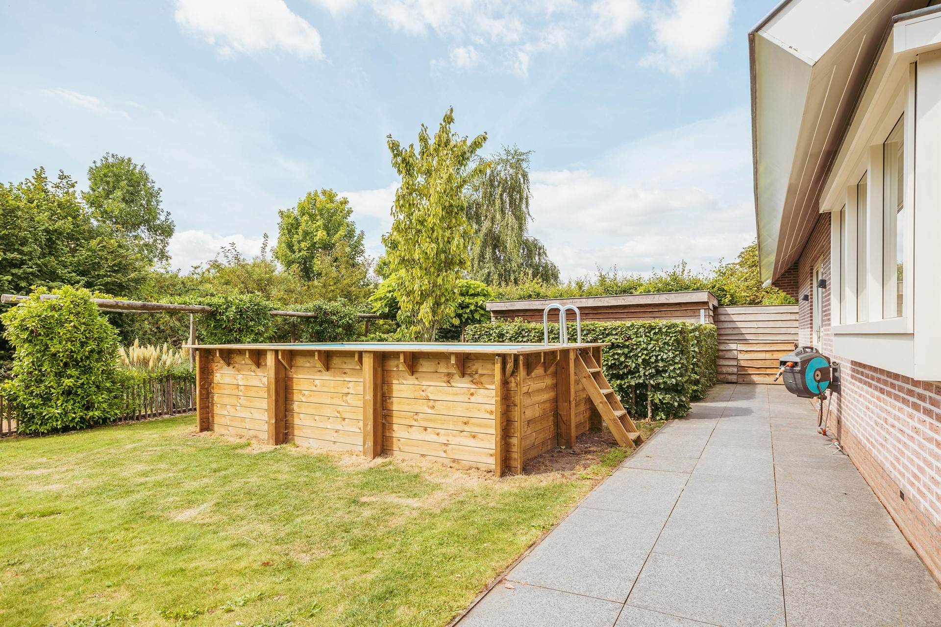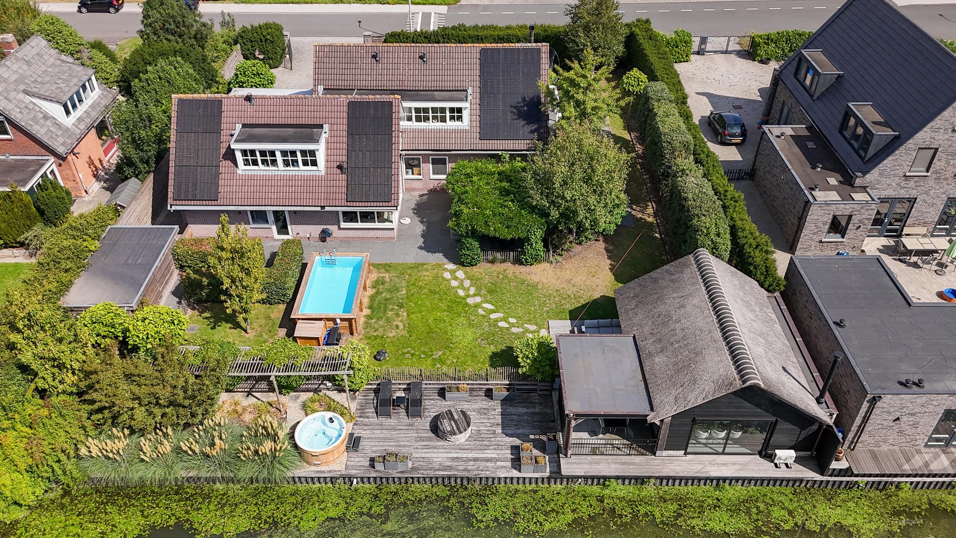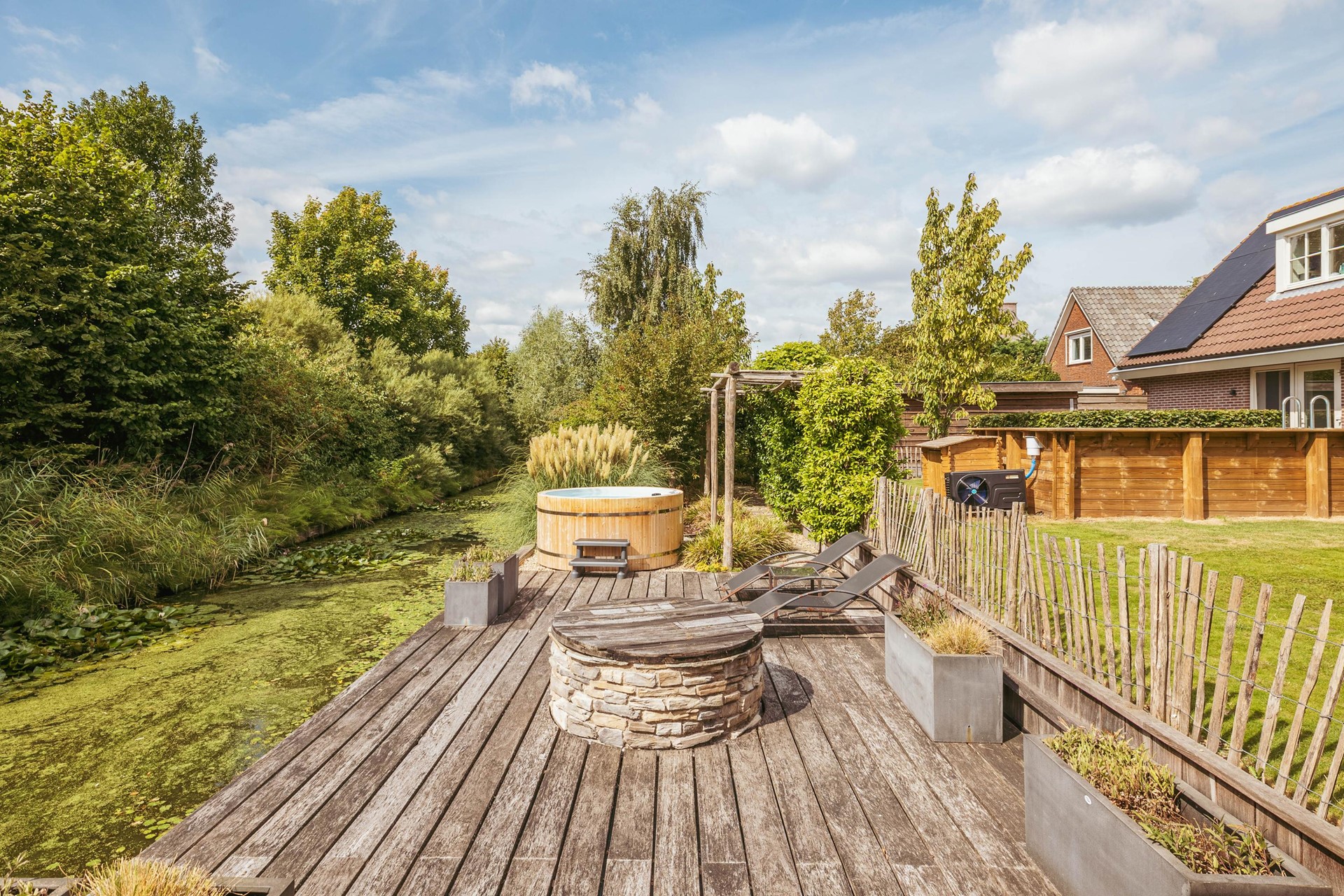 The garden was designed by a landscape architect and offers several terraces and seating areas, always with sun and a view of the ornamental water. The eye-catcher is the heated outdoor pool with adjoining jacuzzi, a place that invites relaxation in every season. The plot is completely private and accessible via a private driveway with electric gate and intercom. Parking is generous on site, with space for about 4-5 cars.