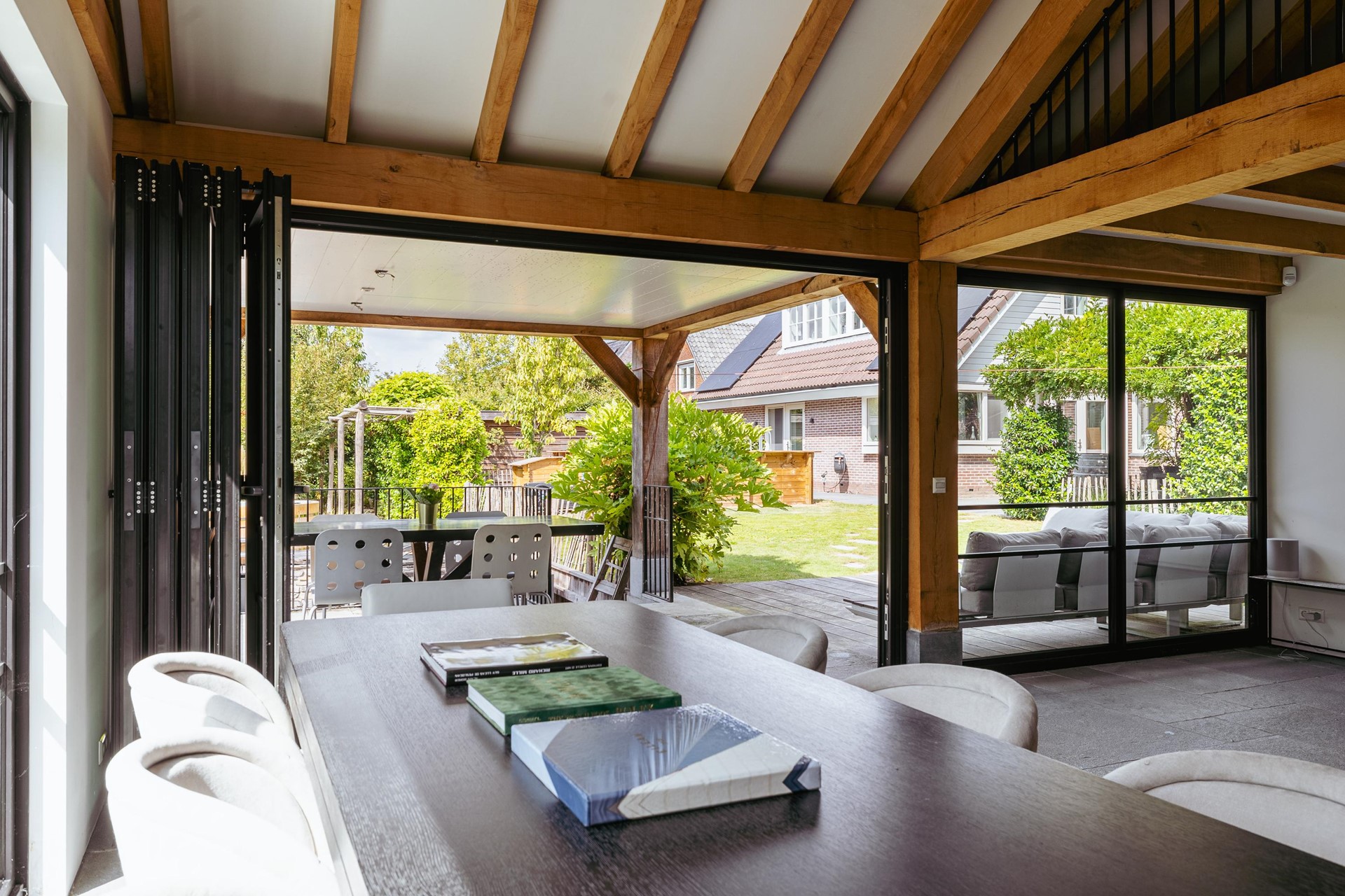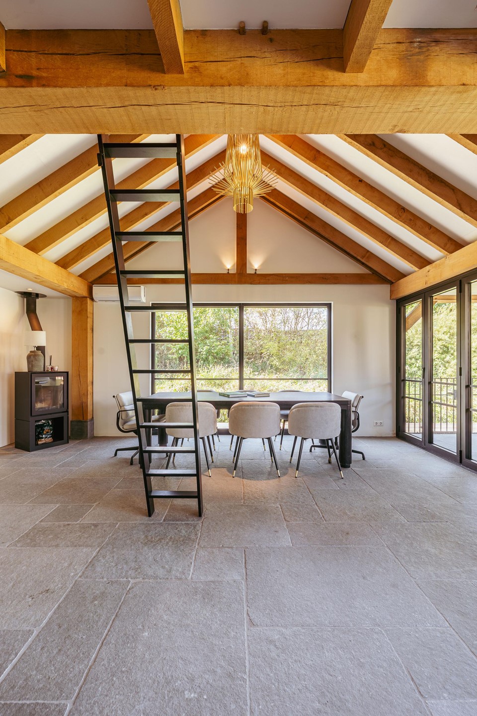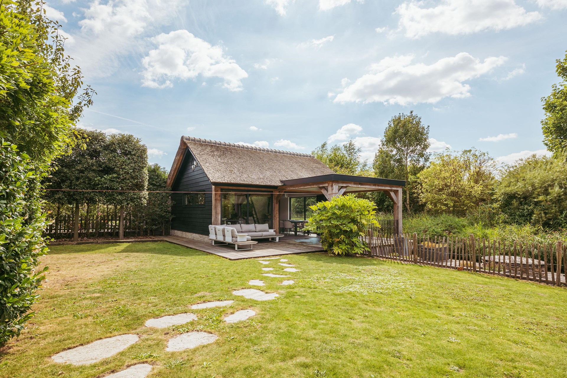 In the backyard stands a detached outbuilding of approximately 36 m², built in 2021 with natural materials such as French oak beams and a thatched roof. The space offers a living room with wood stove, open kitchen, sleeping loft and a covered terrace. Suitable as guest accommodation, studio or workspace.