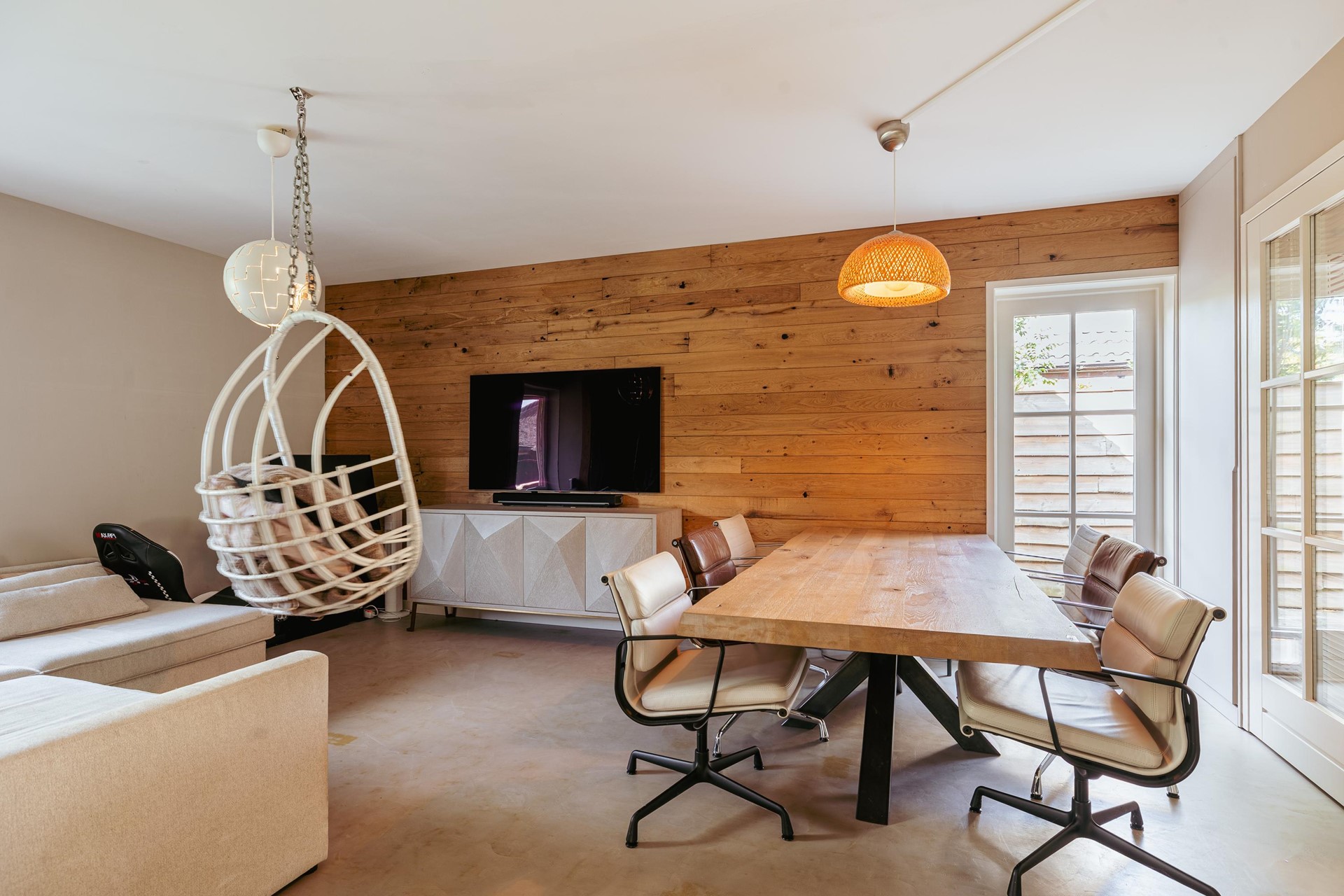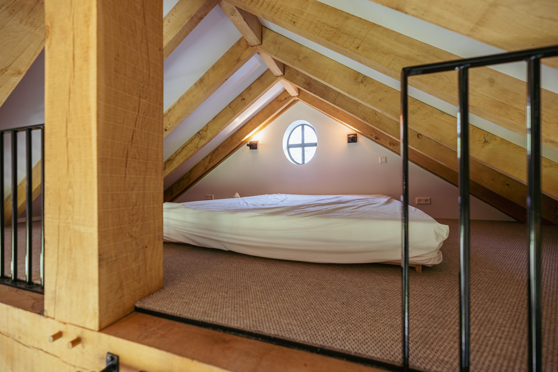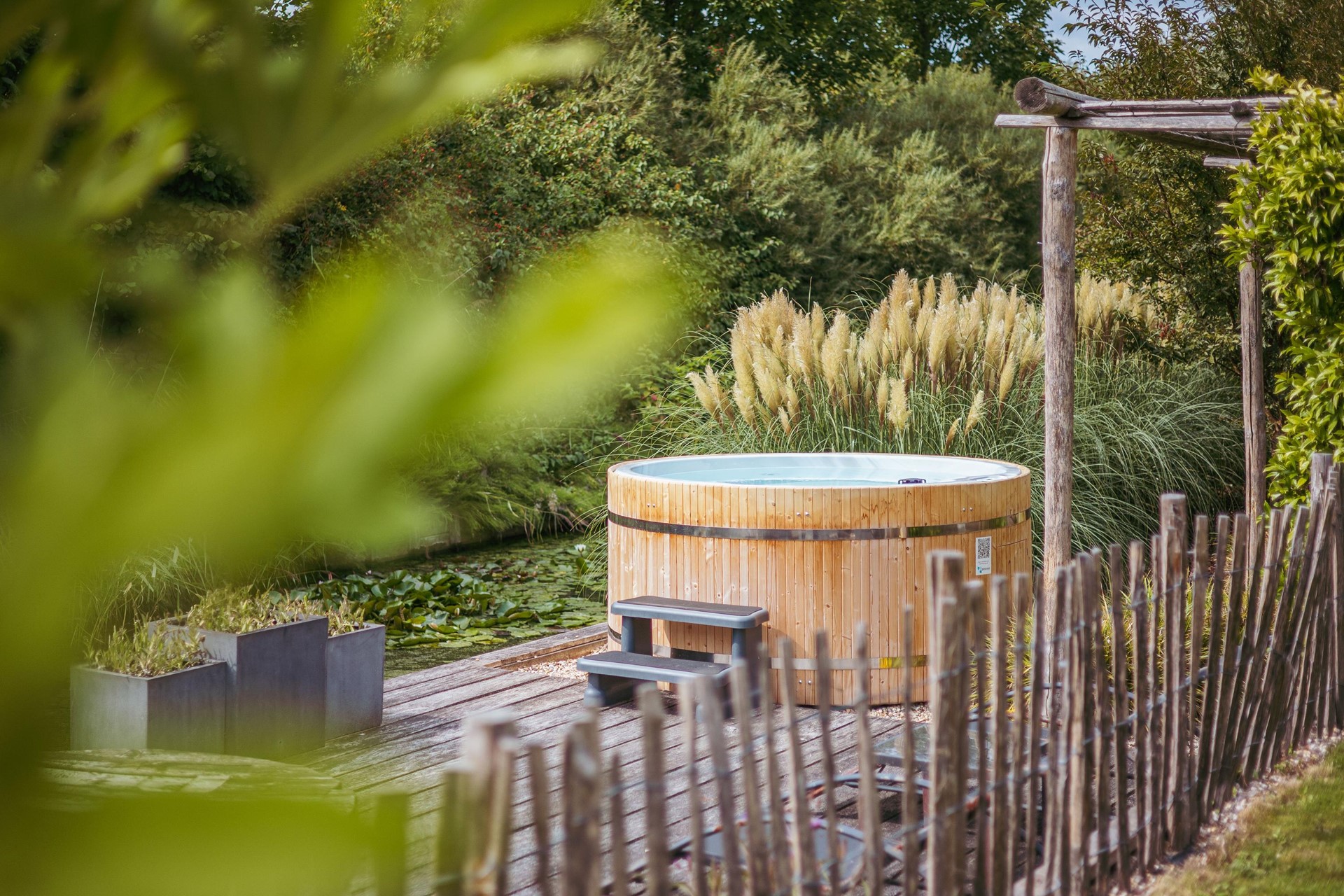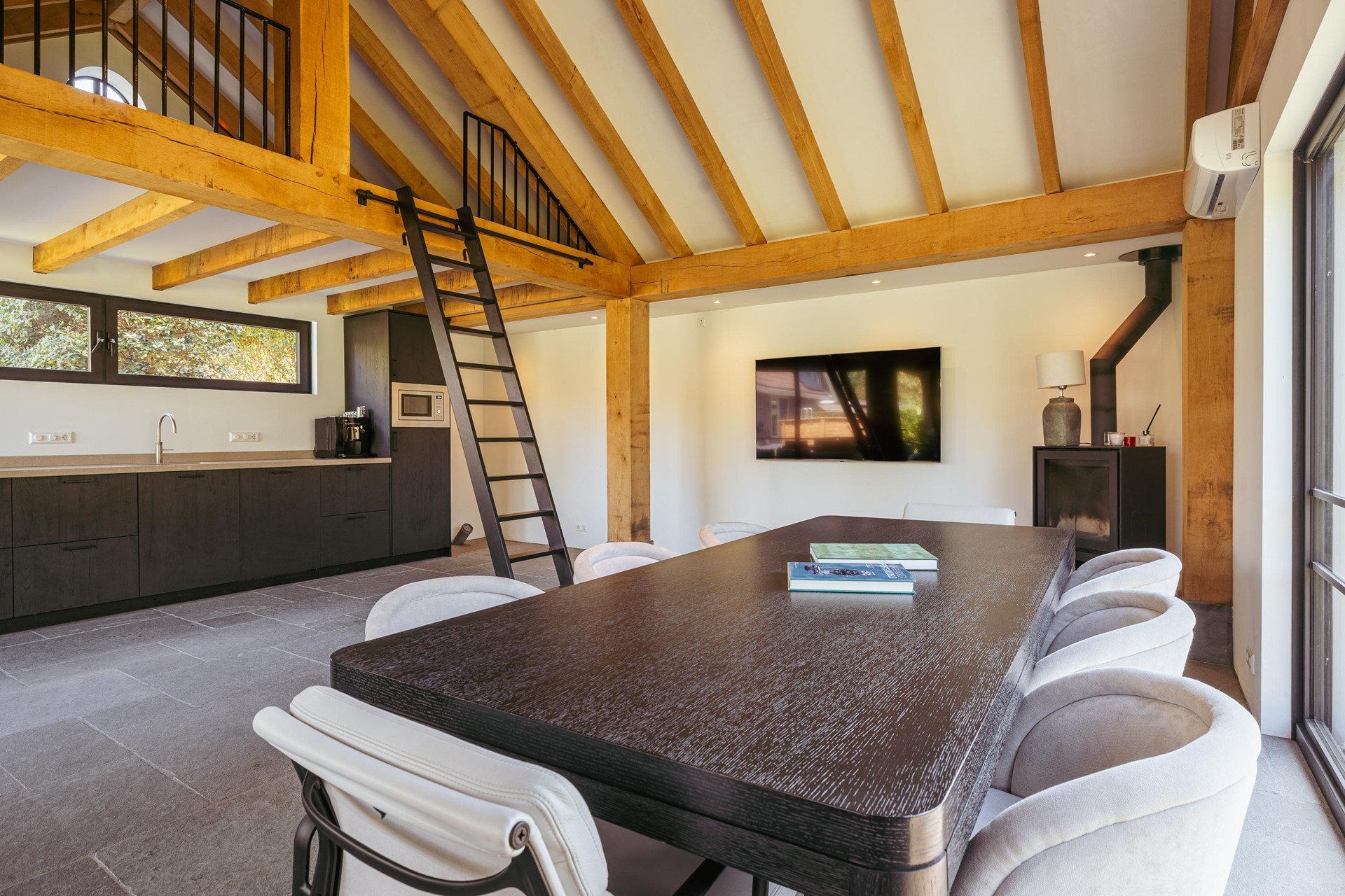 In the backyard stands a detached outbuilding of approximately 36 m², built in 2021 with natural materials such as French oak beams and a thatched roof. The space offers a living room with wood stove, open kitchen, sleeping loft and a covered terrace. Suitable as guest accommodation, studio or workspace.