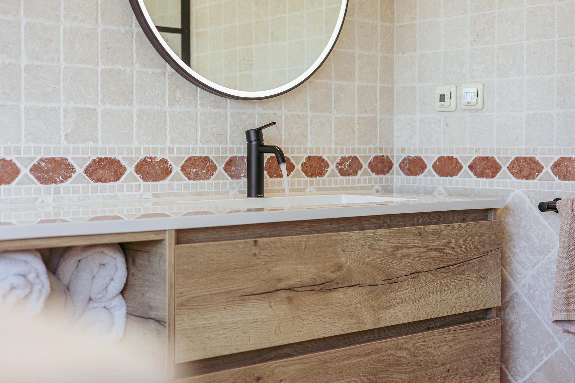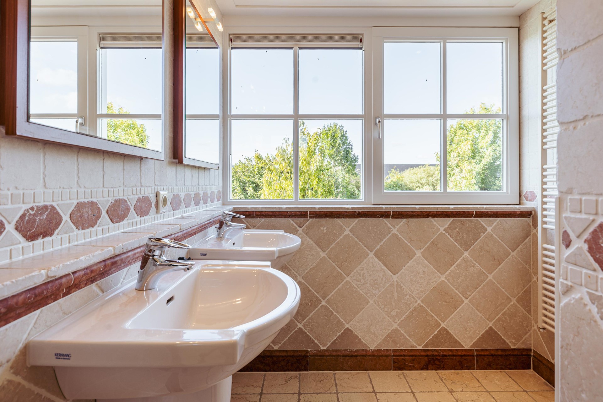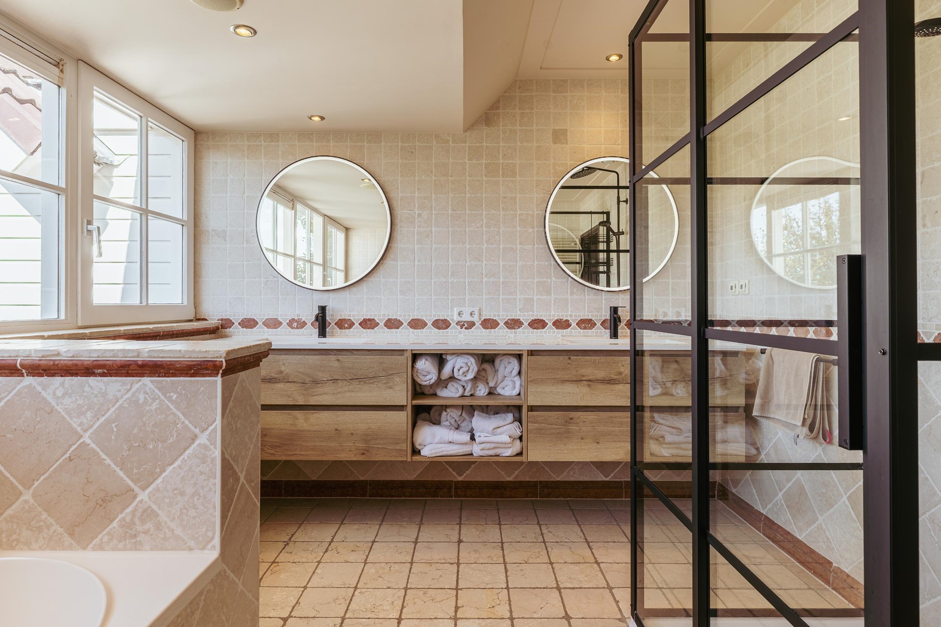 The master bedroom has a built-in wardrobe and a luxury ensuite bathroom with bathtub, walk-in shower, double sink and toilet. In addition, there are three well-sized bedrooms and a second bathroom with shower, double sink and separate toilet.