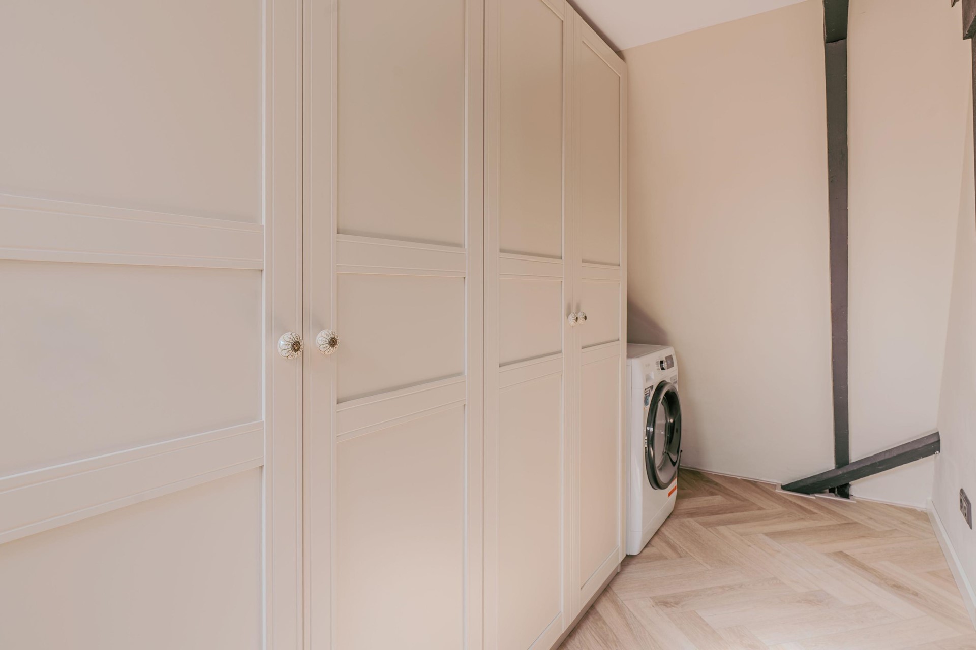 Met de trap bereik je de bovenverdieping. Via de ruime walk-in closet met wasfaciliteiten kom je in de slaapkamer. Dankzij de schuifdeur blijft deze altijd netjes en opgeruimd. De kamer straalt een echte hotelvibe uit, met een losstaand bad, inloopdouche en stijlvolle wastafel. Er is een bedframe gemaakt voor een tweepersoonsbed, dat perfect in de ruimte past. De combinatie van de hotelvibe en goed isolerende ramen maakt dit een heerlijke plek om helemaal tot rust te komen.