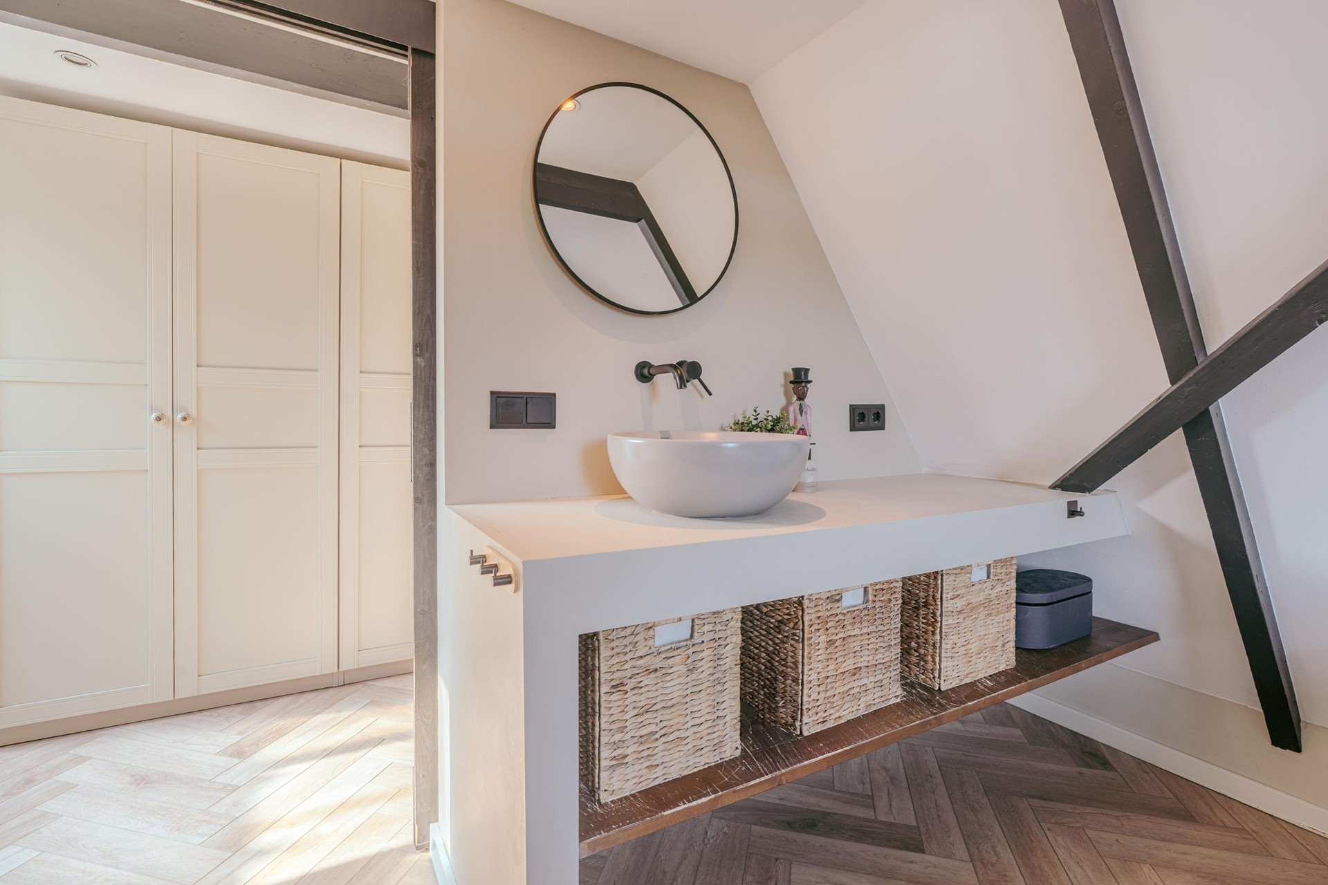 A staircase leads to the upper floor. Through the spacious walk-in closet with laundry facilities, you enter the bedroom. Thanks to the sliding door, this space always feels tidy and organised. The room exudes a true hotel vibe, with a freestanding bathtub, walk-in shower, and elegant washbasin. A custom-made bedframe for a double bed fits the space perfectly. The combination of the luxurious feel and well-insulated windows makes this a serene place to unwind completely.