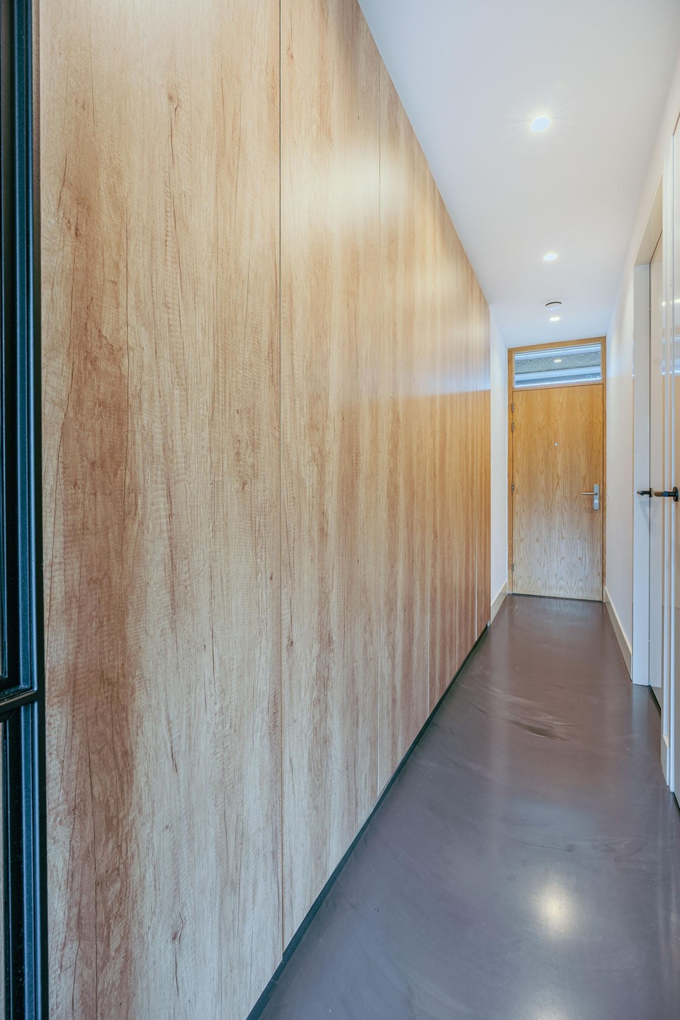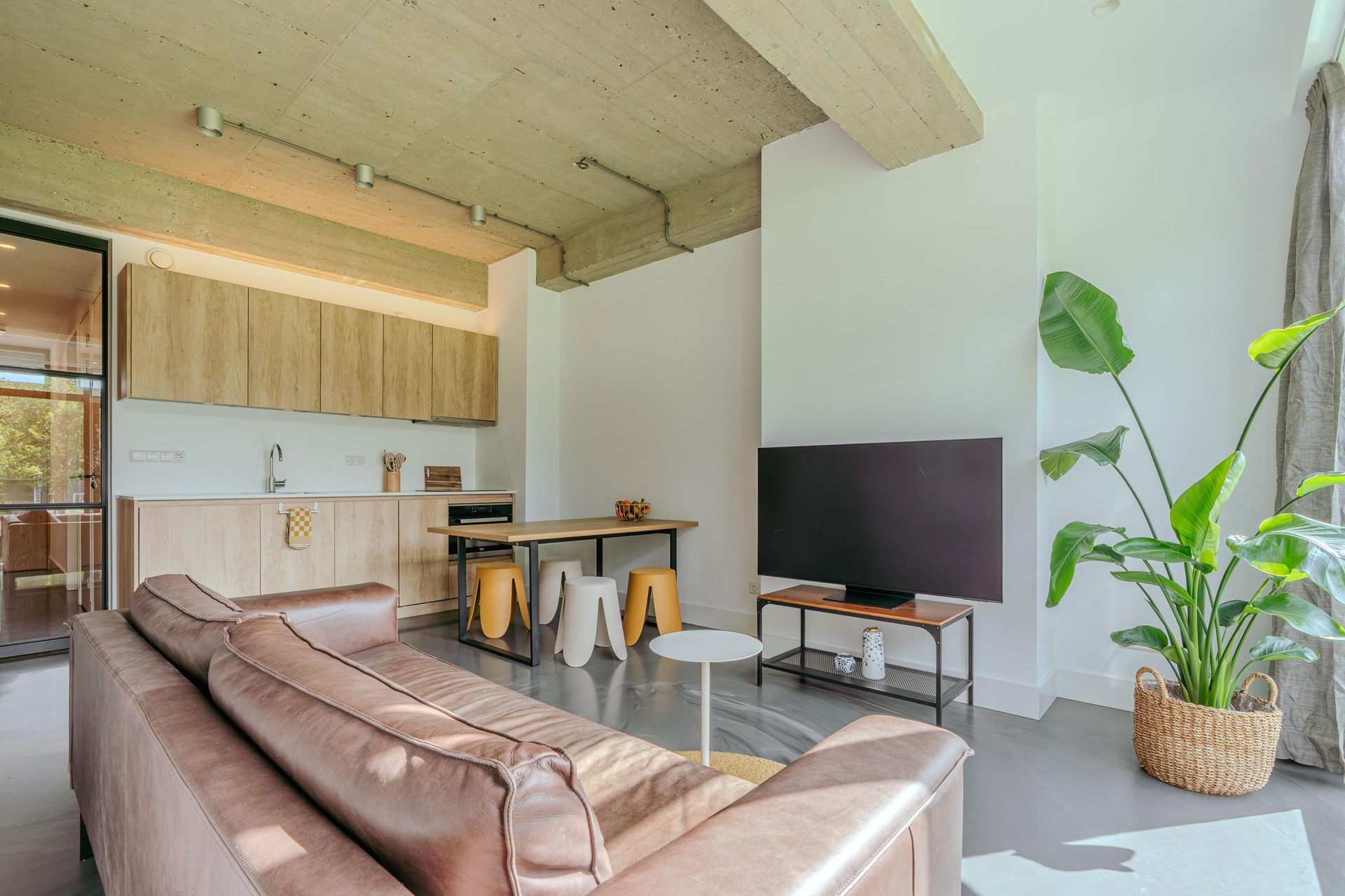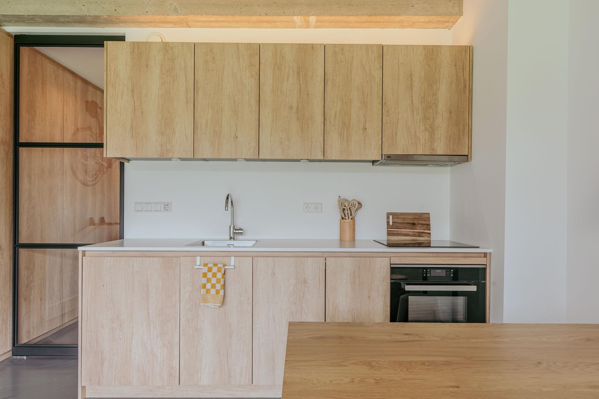 The open kitchen is modern and luxurious, equipped with all conveniences: a built-in refrigerator, combi-oven, induction cooktop, and dishwasher. The warm wood tones in both the kitchen and the wardrobe combine beautifully with the industrial design, giving the home a unique and inviting character.