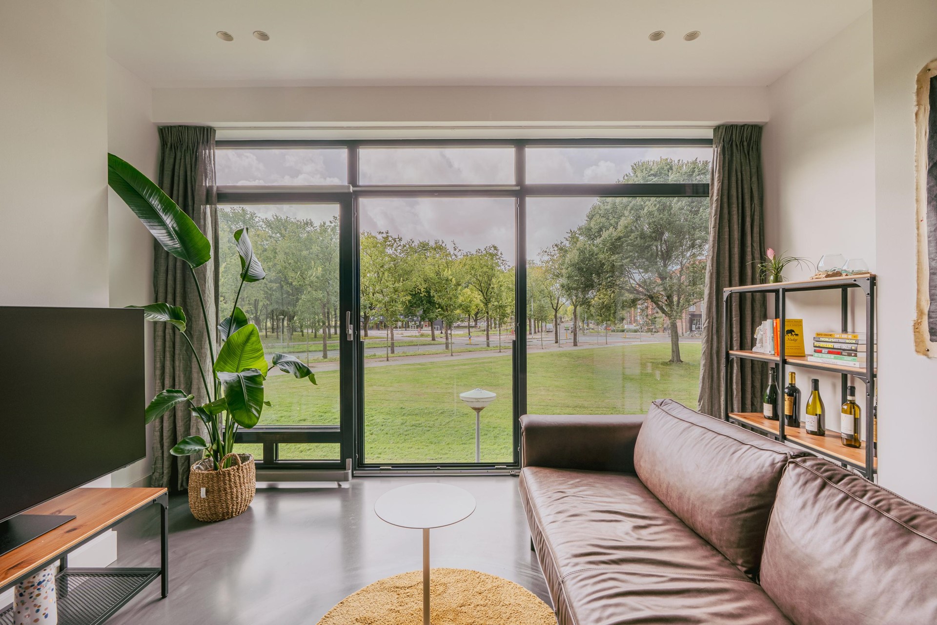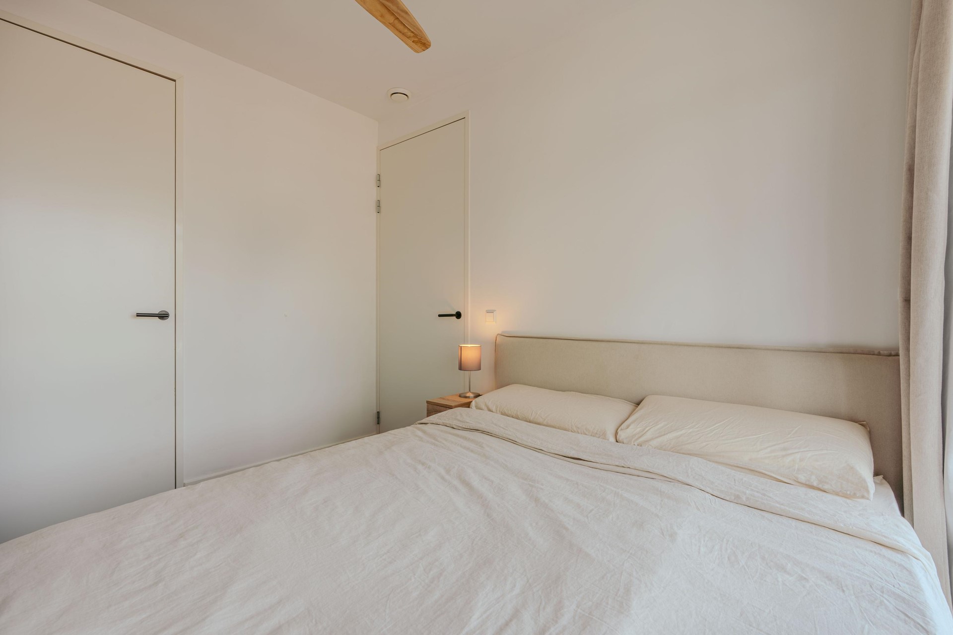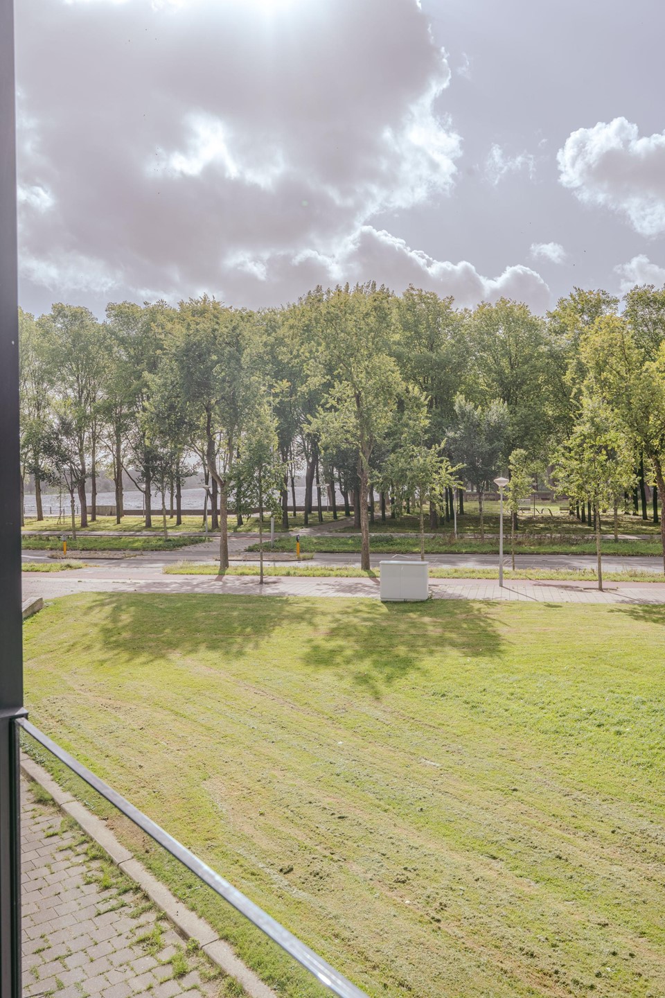 Bij binnenkomst valt direct de ruime hal op met een prachtige, lange ingebouwde kastenwand – ideaal om al je kleding en spullen netjes in op te bergen. Vanuit de hal bereik je het separate toilet en loop je door naar de woonkamer. De woonkamer is licht en ruimtelijk dankzij de grote raampartijen en door middel van een schuifdeur open je de deuren en je geniet van het uitzicht op groen en water. De gehele woning is voorzien van een strakke gietvloer, wat zorgt voor een moderne en onderhoudsvriendelijke basis. De open keuken is modern en luxe uitgevoerd met alle gemakken: een inbouwkoelkast, combi-oven, inductiekookplaat en vaatwasser. De combinatie van warme houttinten in de keuken en de kastenwand geeft het appartement een stijlvol geheel met een industriële maar warme uitstraling. Aan de achterzijde van de woning bevindt zich de ruime slaapkamer. Hier is voldoende plek voor een tweepersoonsbed en een royale kastenwand, zodat ook deze ruimte praktisch én comfortabel kan worden ingericht. Dankzij de rustige ligging is het de ideale plek om je terug te trekken na een drukke dag. De slaapkamer grenst direct aan de badkamer, die modern is afgewerkt met een inloopdouche, grote verwarmde spiegel en een strak wastafelmeubel. Dankzij de doordachte indeling en hoogwaardige afwerking is de woning direct bewoonbaar, zonder dat er nog iets hoeft te gebeuren.