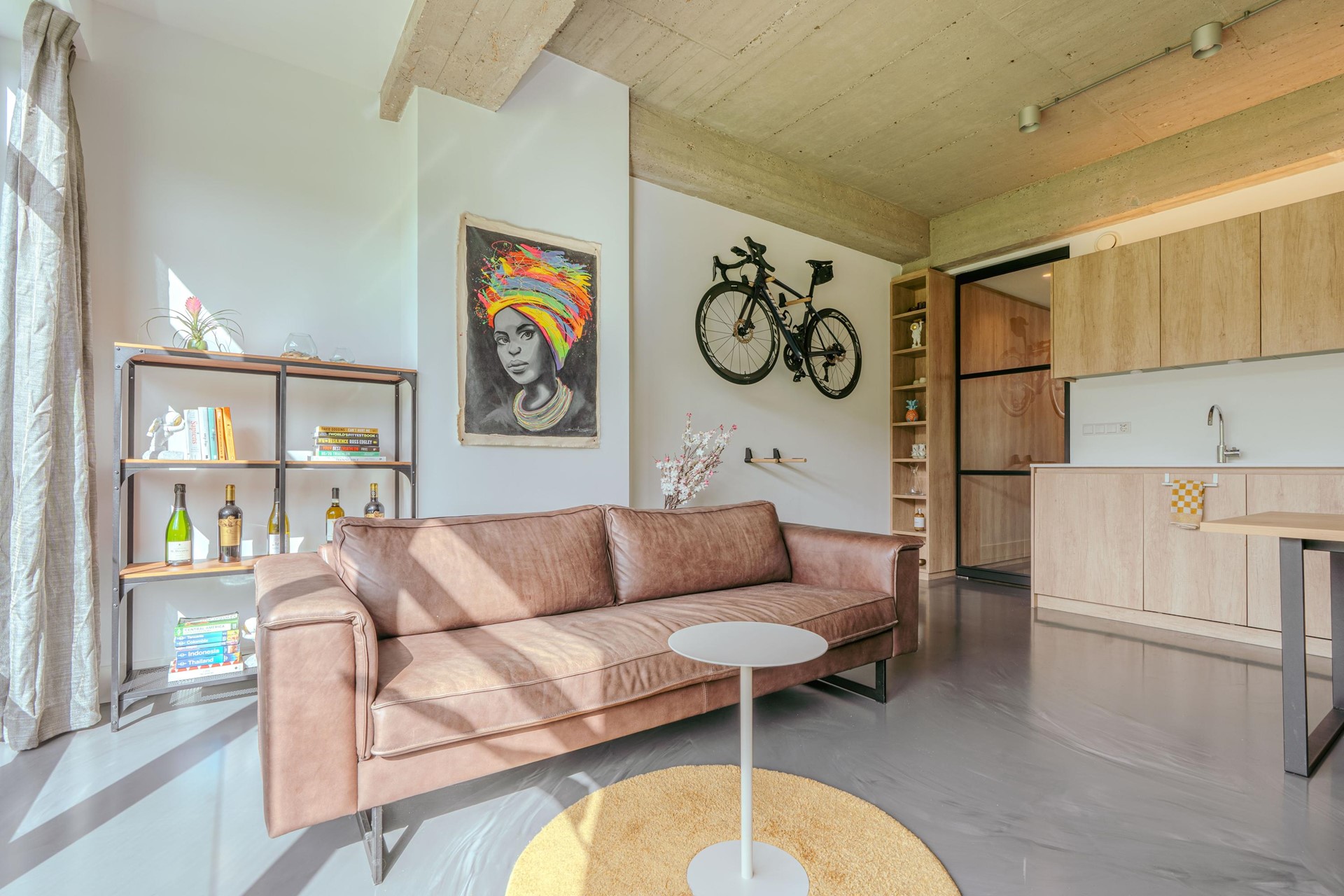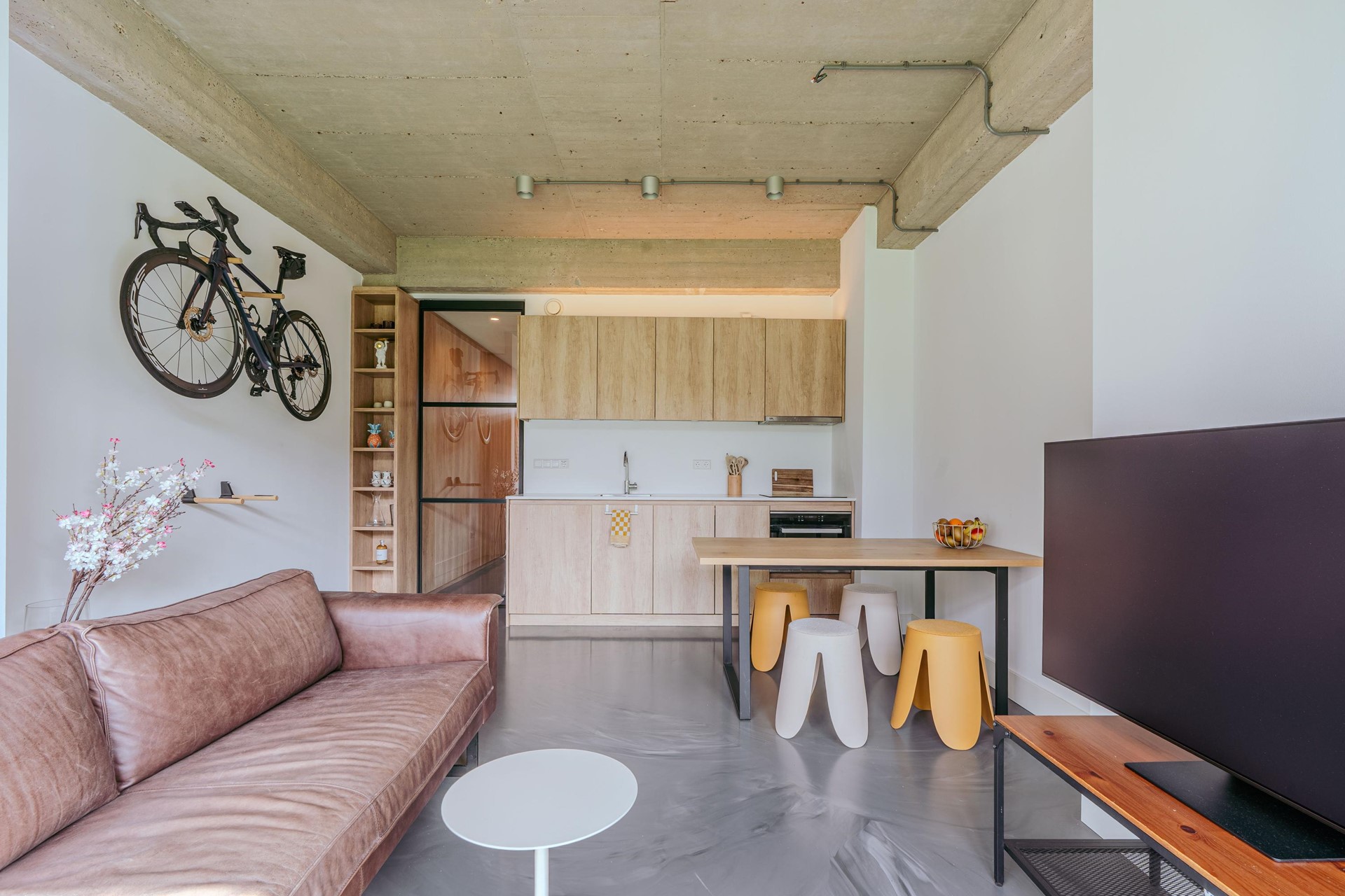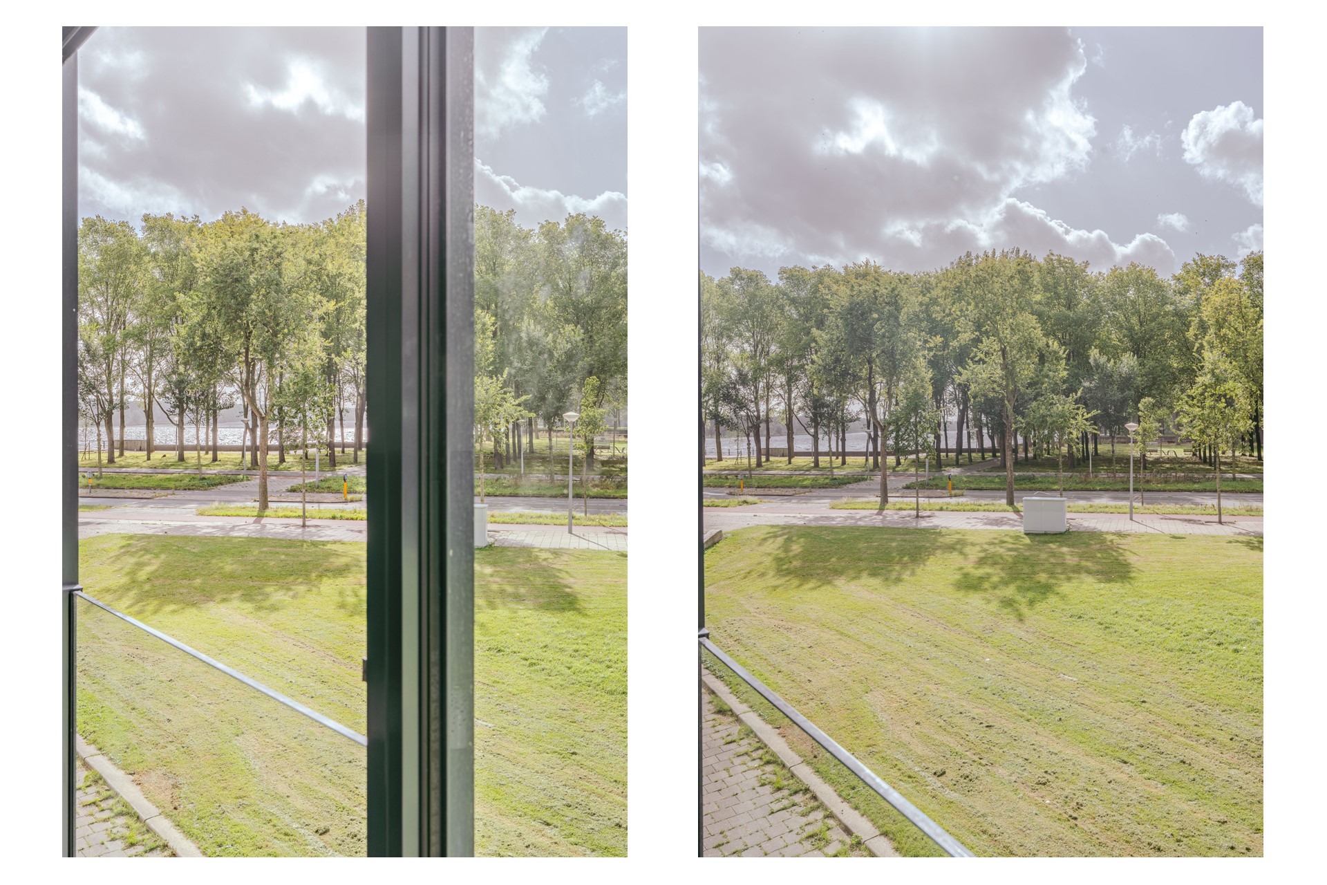 The living room is bright and airy thanks to the large windows, and with sliding doors you open up to a French balcony, where you can enjoy the greenery and water views. The entire apartment is fitted with a sleek poured floor, creating a modern and low-maintenance base.