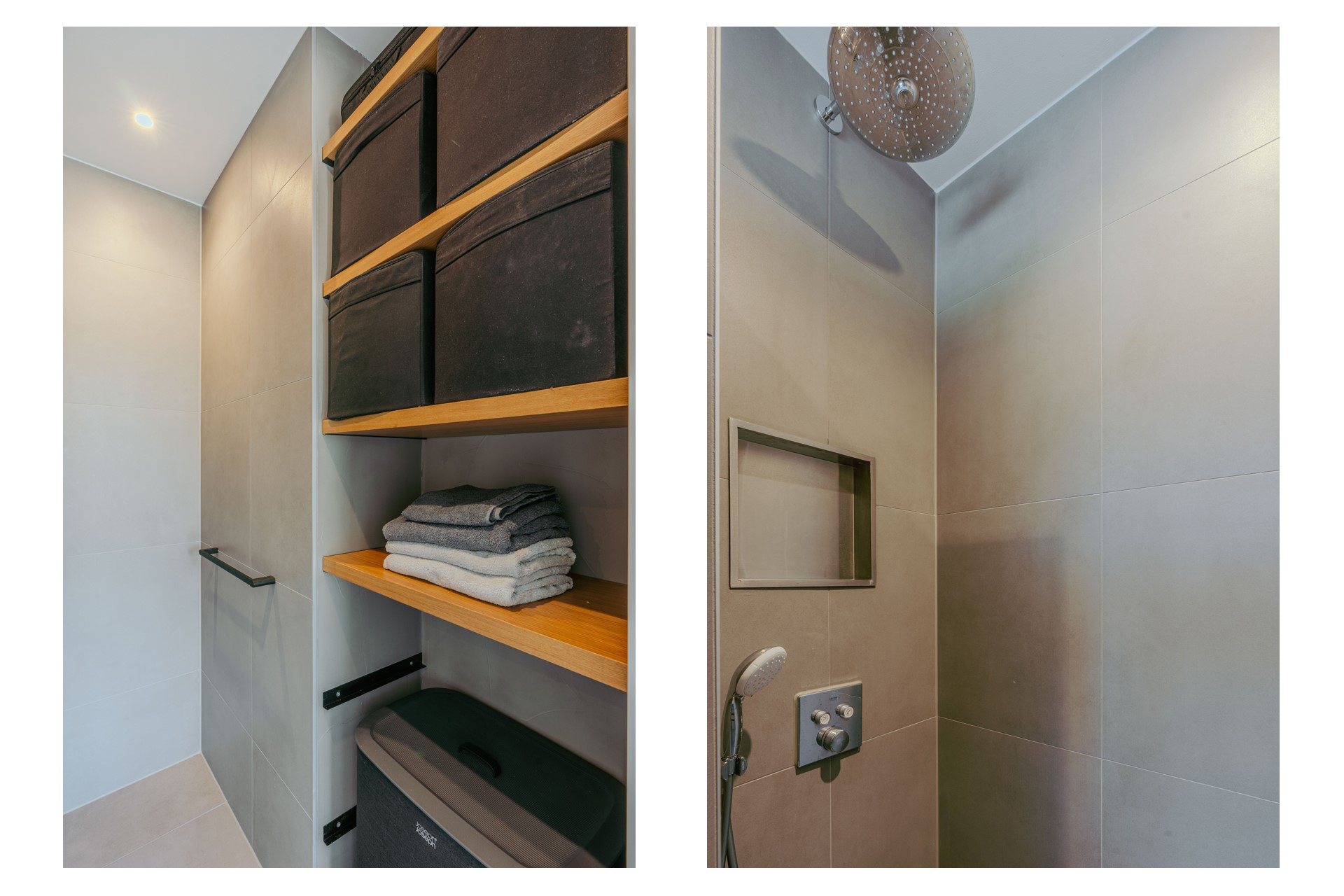 At the rear of the apartment, you’ll find the spacious bedroom, large enough for a double bed and a generous wardrobe. Thanks to its quiet location, it’s the ideal space to retreat after a busy day. The bedroom has direct access to the modern bathroom, finished with a walk-in shower, a large heated mirror, and a sleek vanity. With its thoughtful layout and high-quality finishes, this apartment is ready to move into immediately, without any work required.