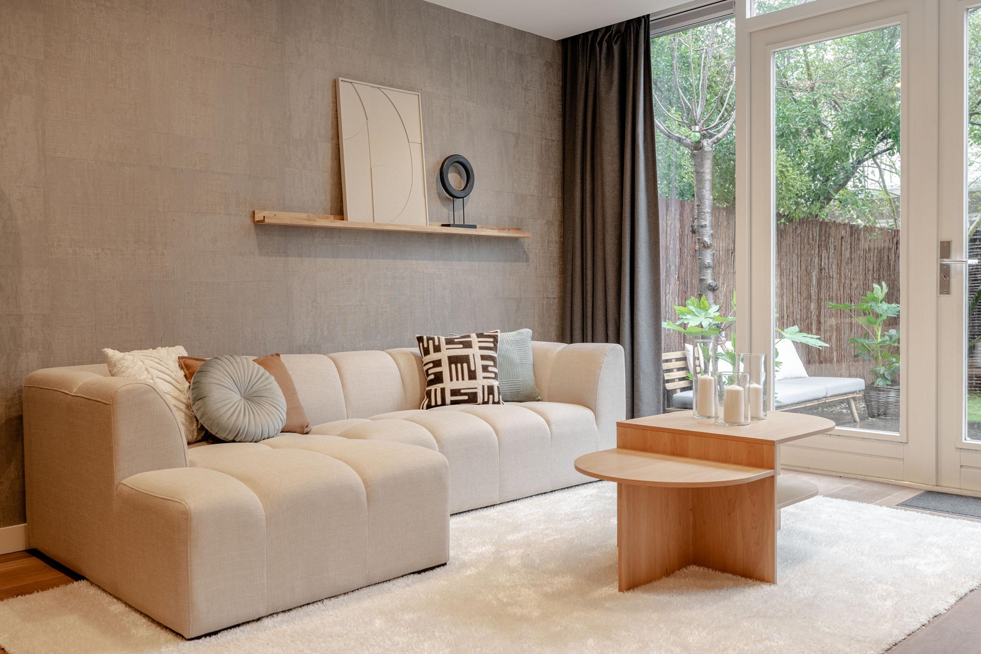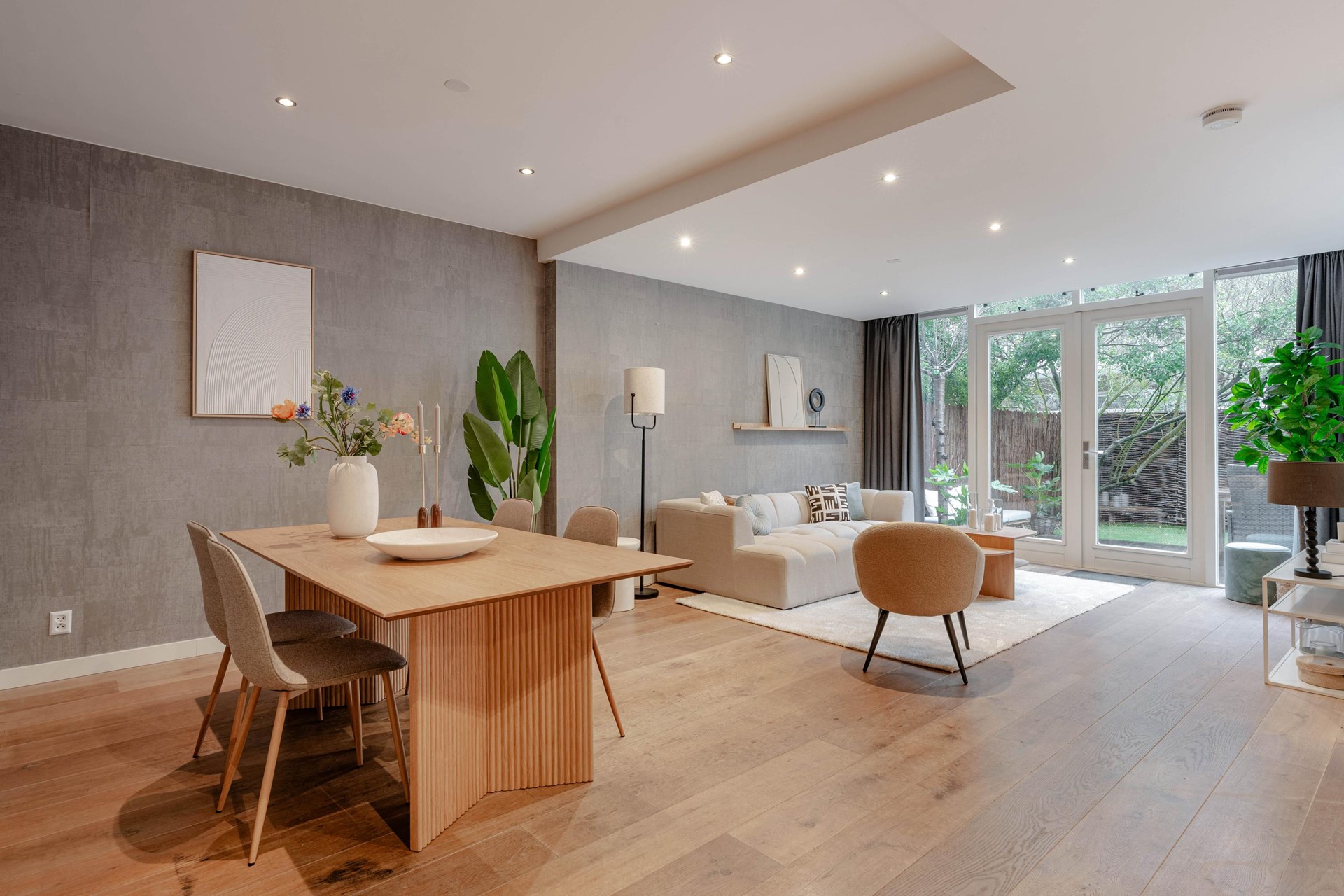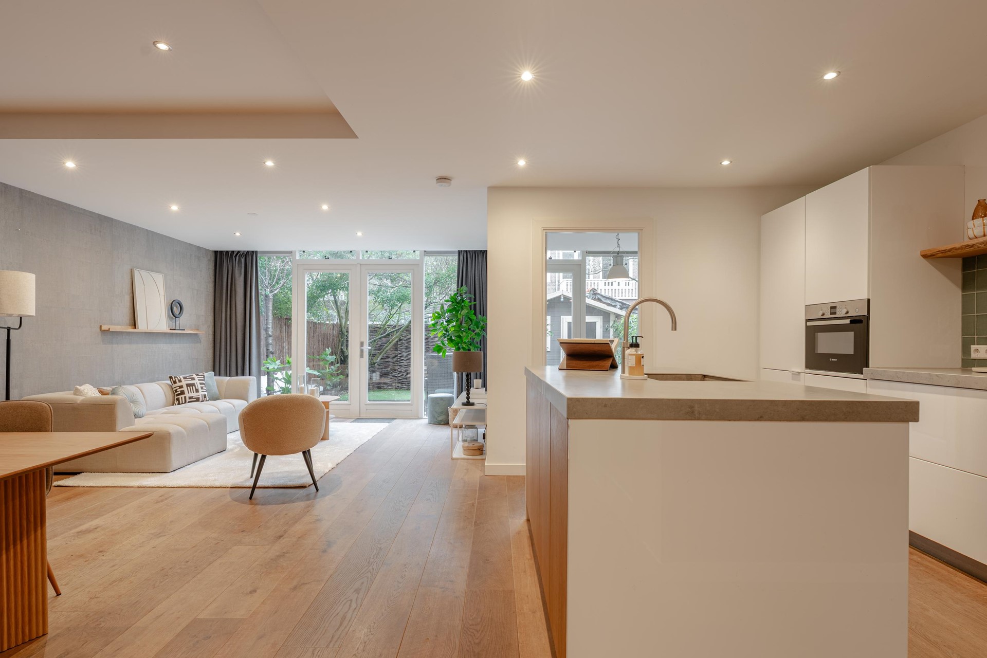 De royale woonkamer vormt zonder twijfel het hart van de woning. Door de brede raampartijen en de openslaande deuren naar de tuin geniet deze ruimte van een overvloed aan natuurlijk licht en een mooie verbinding met buiten. De woonkamer biedt meer dan voldoende plaats voor zowel een comfortabele zithoek als een ruime eethoek, waardoor het een ideale plek is om te ontspannen, gasten te ontvangen of gezellig samen te komen.