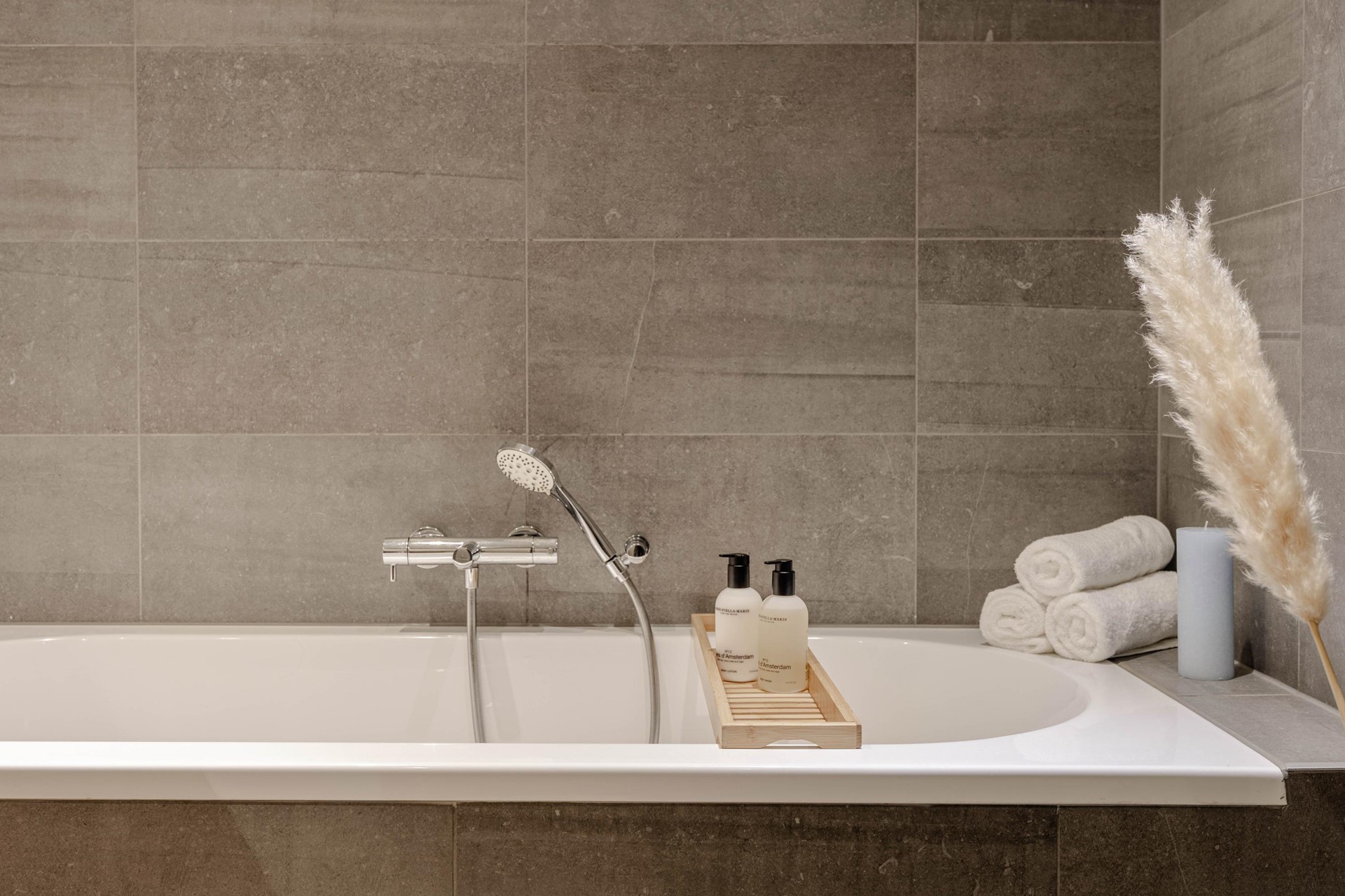 De badkamer is uitgevoerd in tijdloze tinten. Deze is voorzien van een ligbad, een moderne douche en een fraai wastafelmeubel met voldoende bergruimte. Het toilet is separaat gesitueerd, wat extra comfort en gebruiksgemak biedt. Direct naast het toilet bevindt zich een inpandige berging met aansluiting voor wasmachine en droger, evenals extra opbergruimte.
