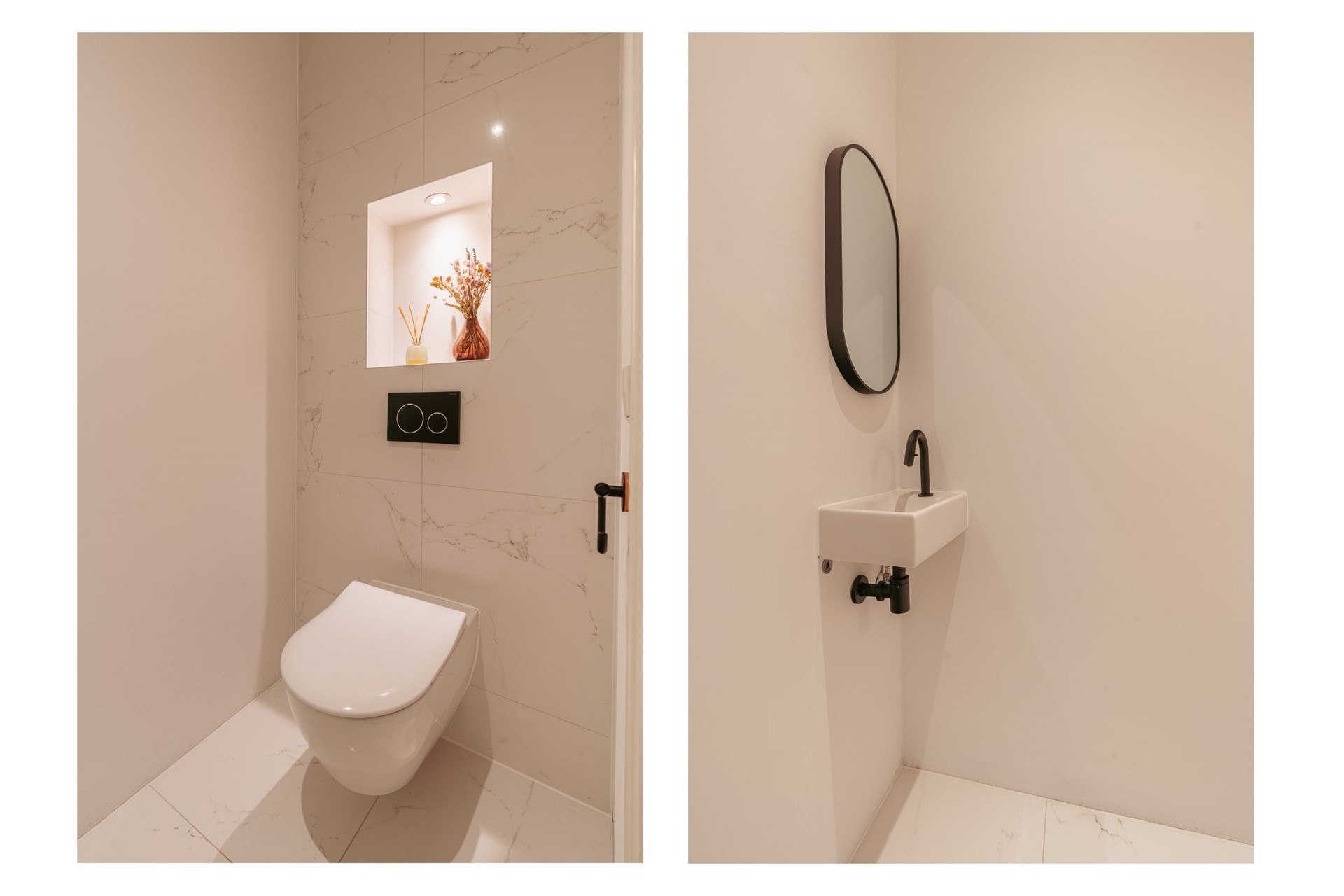 From the central hall you reach the bedrooms, bathroom and separate toilet. Both bedrooms are generously sized and offer French doors to the garden. The bathroom is finished to a high standard and includes a freestanding bathtub, double washbasin with cabinet and a walk-in shower. There is also a practical storage space with connections for a washing machine and dryer.
