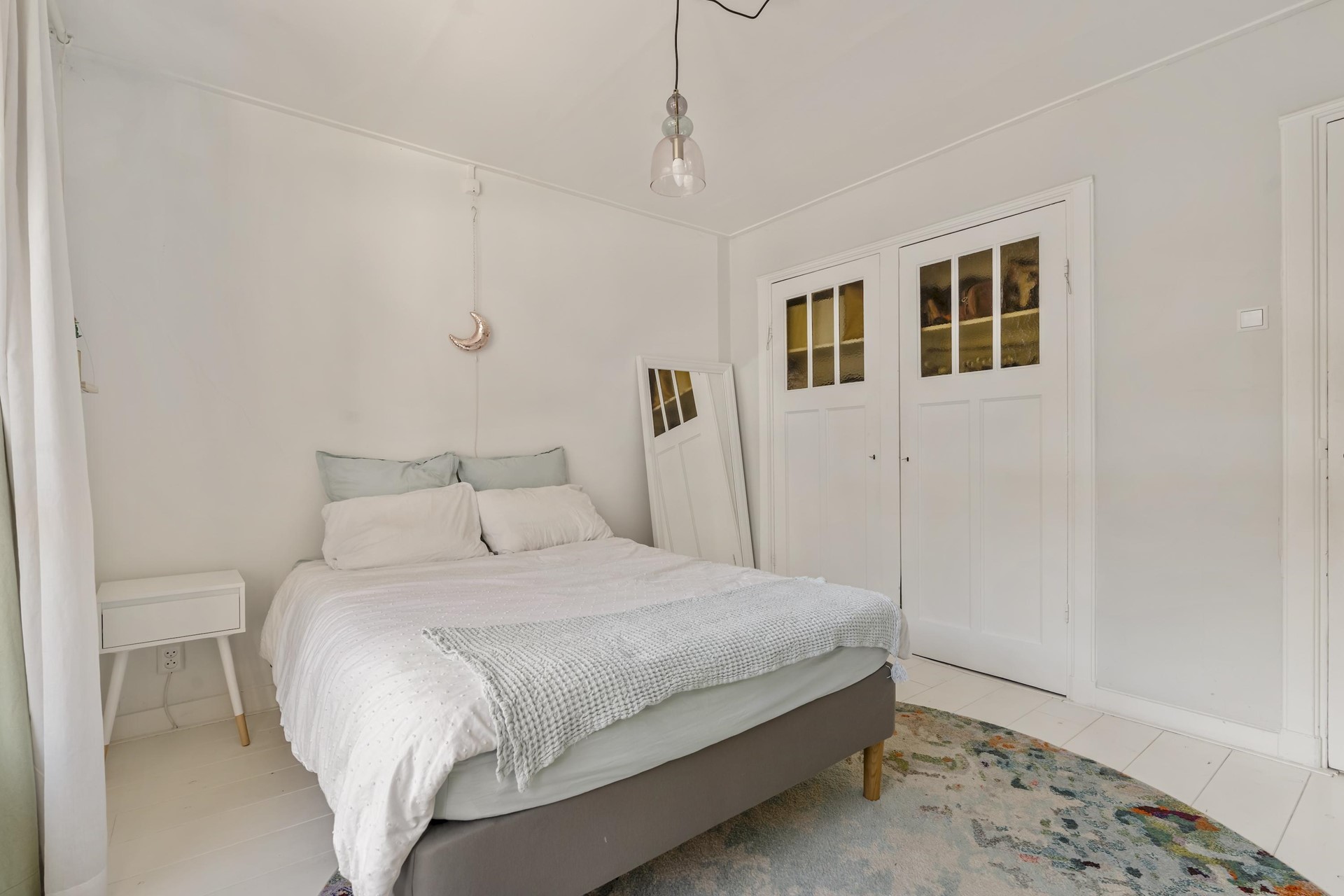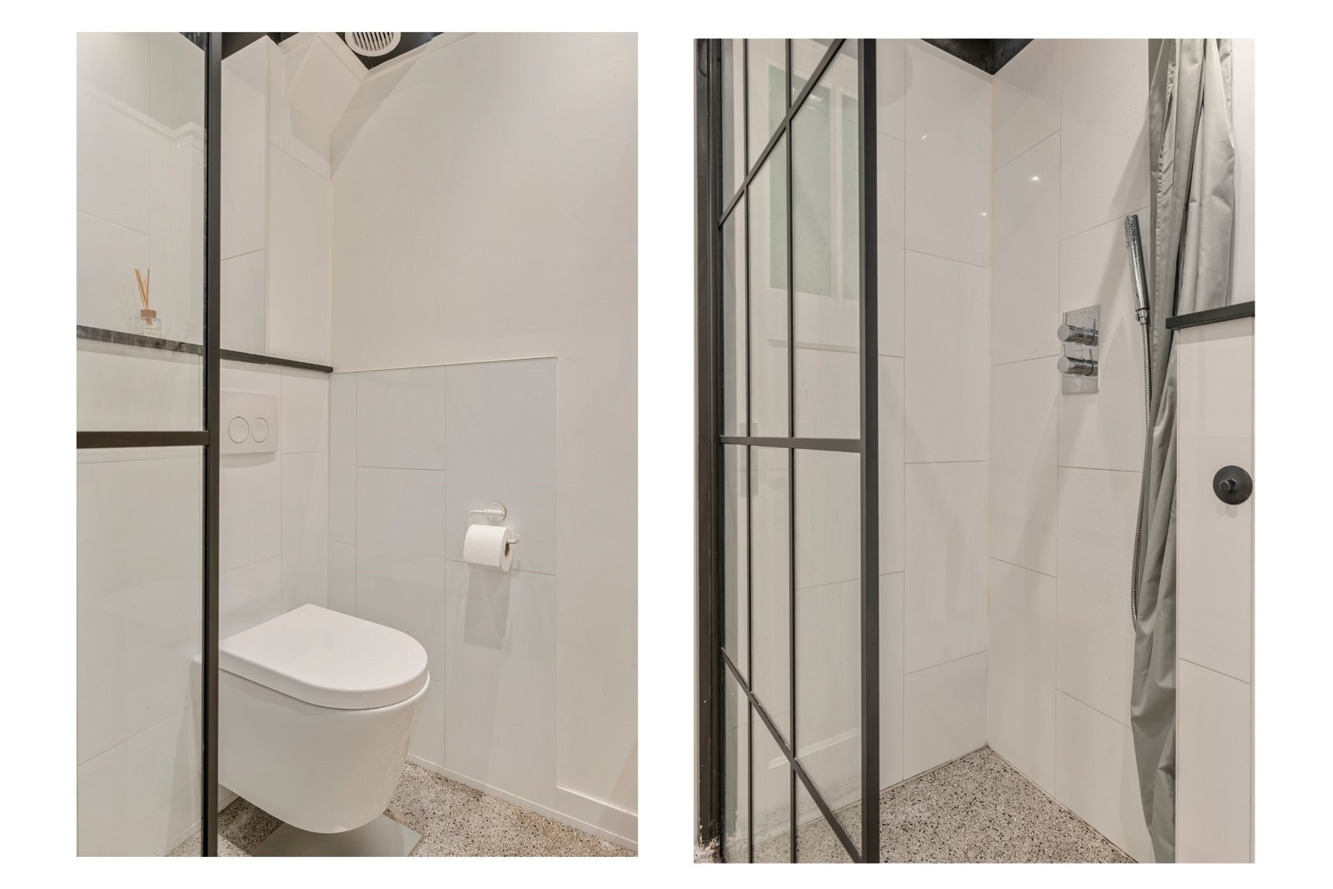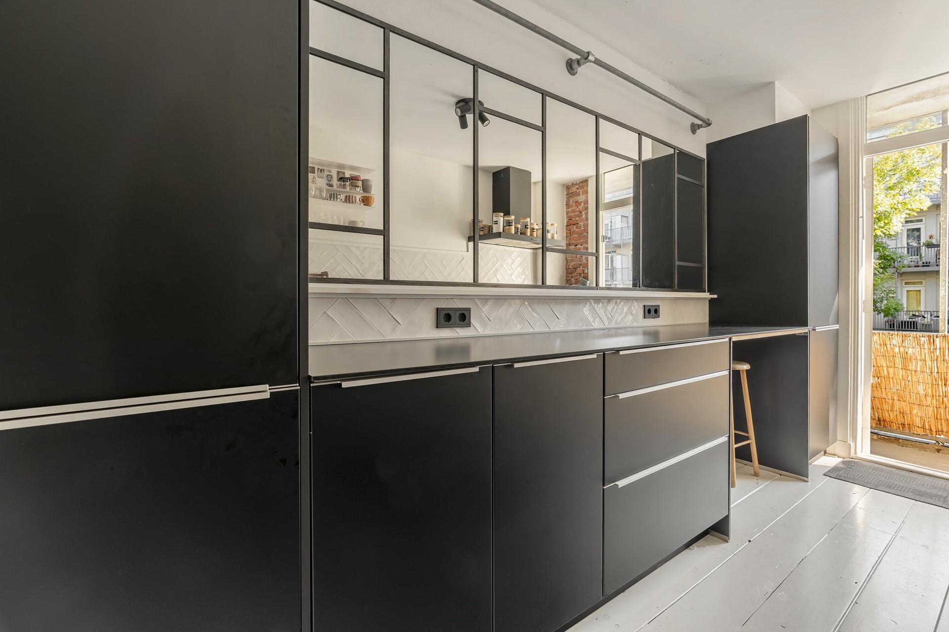 Op de eerste verdieping van een karakteristiek jaren ’20-blok ligt dit lichte en smaakvol afgewerkte appartement van circa 57 m² met energielabel C. De witte, massief houten vloeren, hoge plafonds en grote raampartijen geven de woonkamer een prettige uitstraling. De moderne, matzwarte keuken met robuust werkblad en riante 5-pitskookplaat ligt aan de tuinzijde en geeft via een deur toegang tot het brede balkon op het oosten—ideaal voor de ochtendzon en een vroege lunch. De slaapkamer aan de achterzijde is royaal bemeten en beschikt over vaste kasten; de badkamer is hedendaags uitgevoerd met inloopdouche, glazen wand en hangend sanitair. Boven in het gebouw hoort een grote zolderberging bij de woning. Daarnaast is het appartement voorzien van glasvezel voor razendsnel internet.