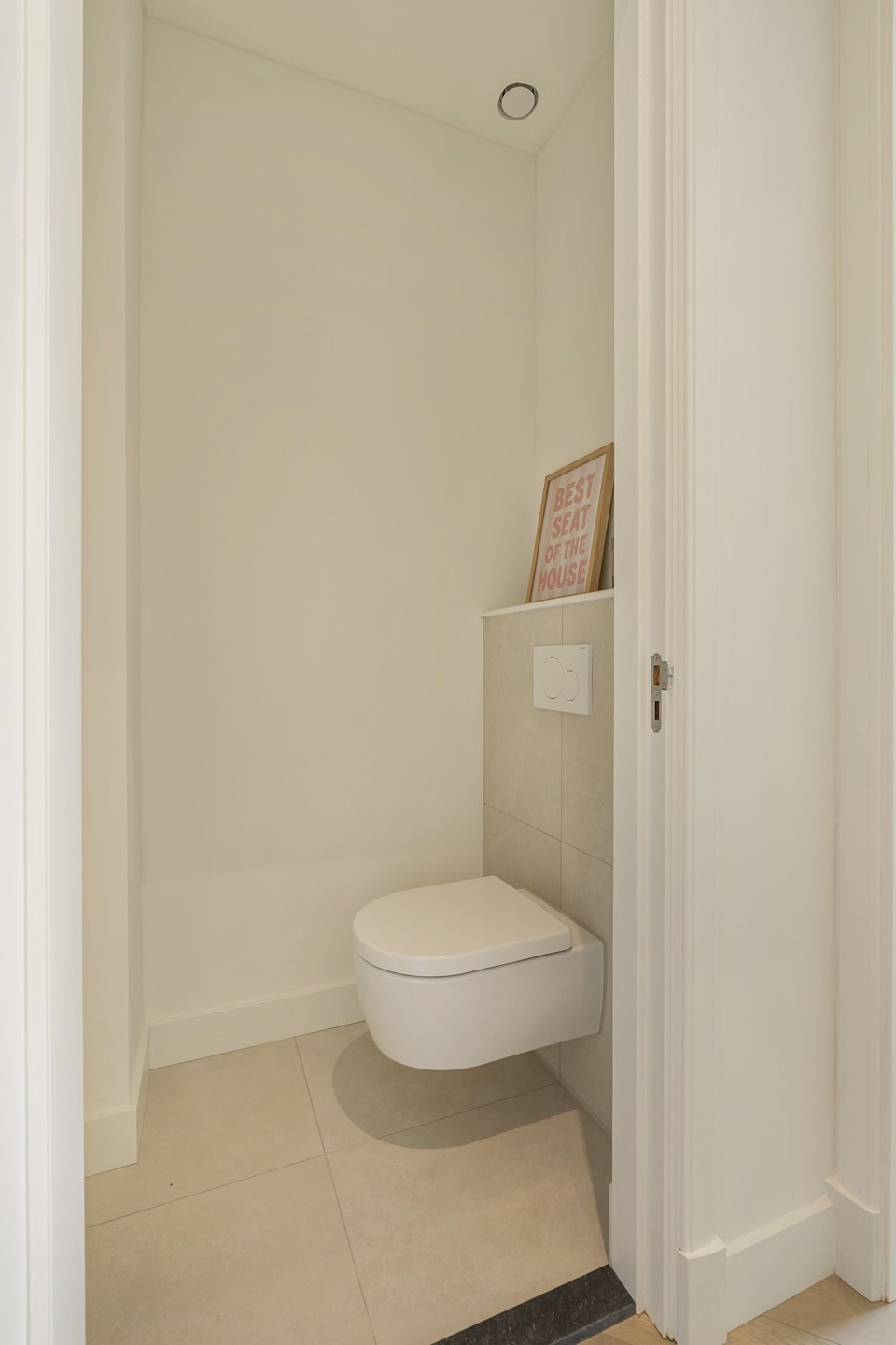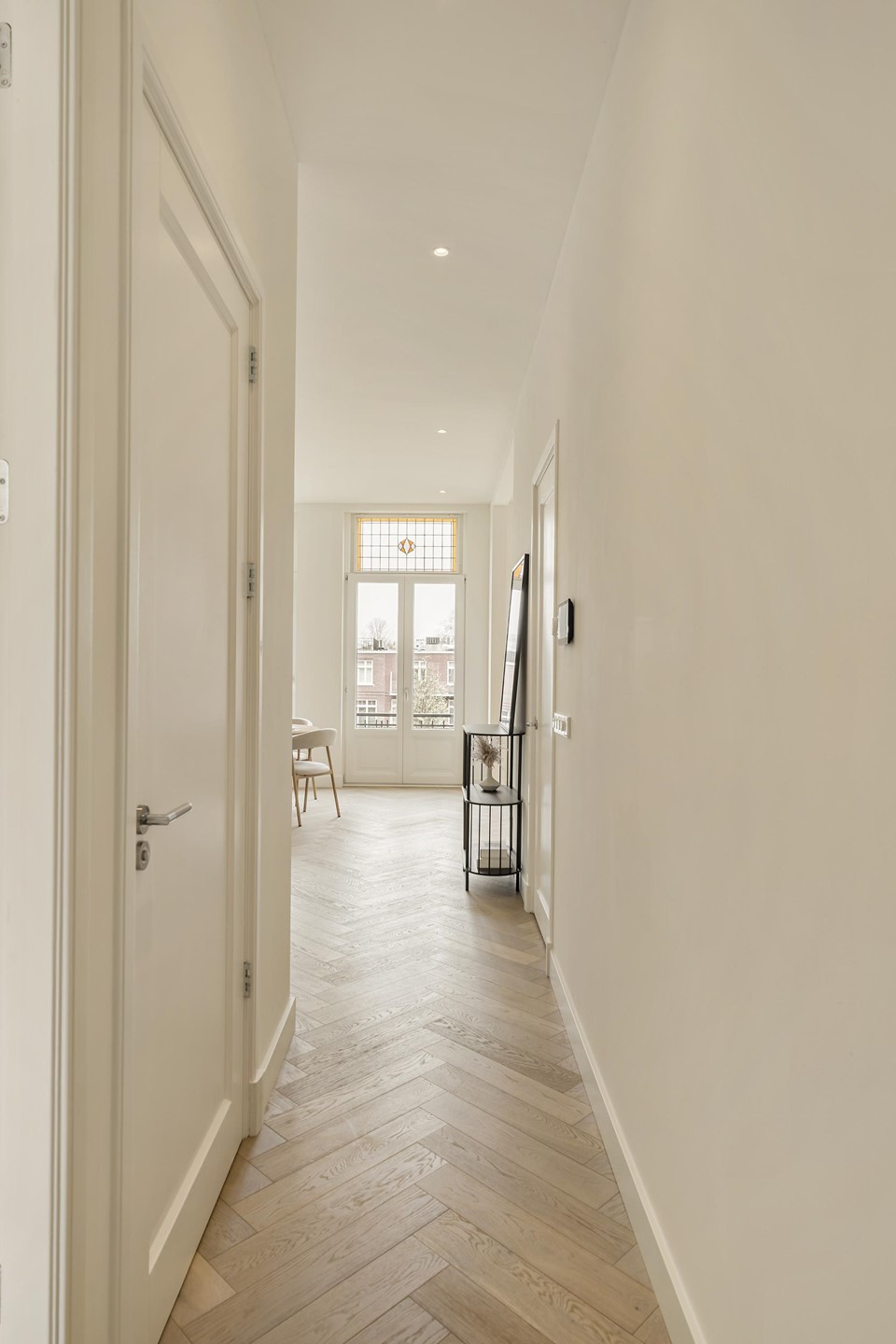 Via the communal staircase you reach the apartment on the second floor. In the hallway, there is a modern intercom system with camera, which can also be operated via your phone. Upon entering, the high-quality finish and sense of space and light immediately stand out.
