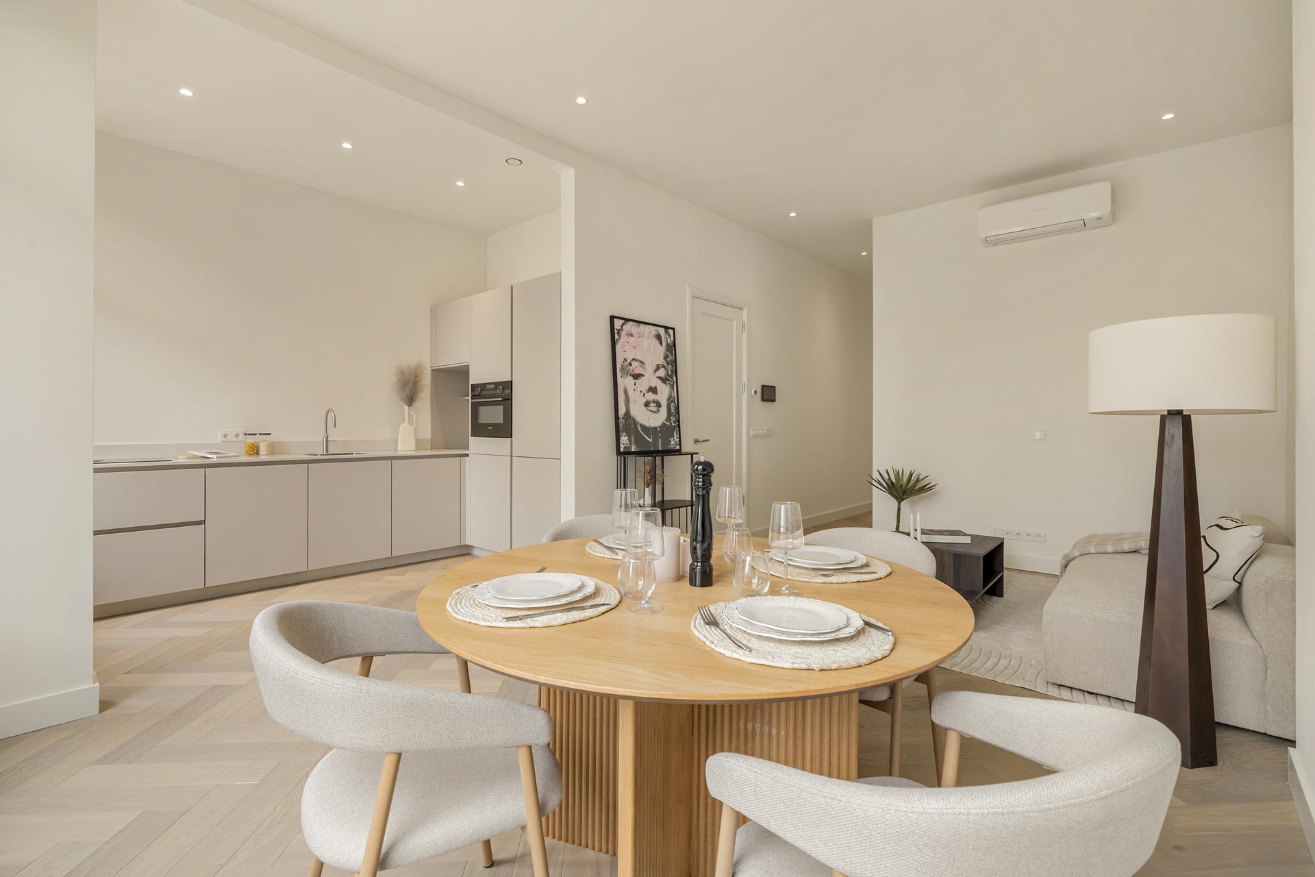 The spacious living room is located at the front and features large windows and a charming French balcony, allowing for beautiful natural light and an enhanced feeling of openness. The open-plan living area offers plenty of space for a comfortable seating area and a generous dining area. The living room is also equipped with air conditioning that can both cool and heat, providing year-round comfort.