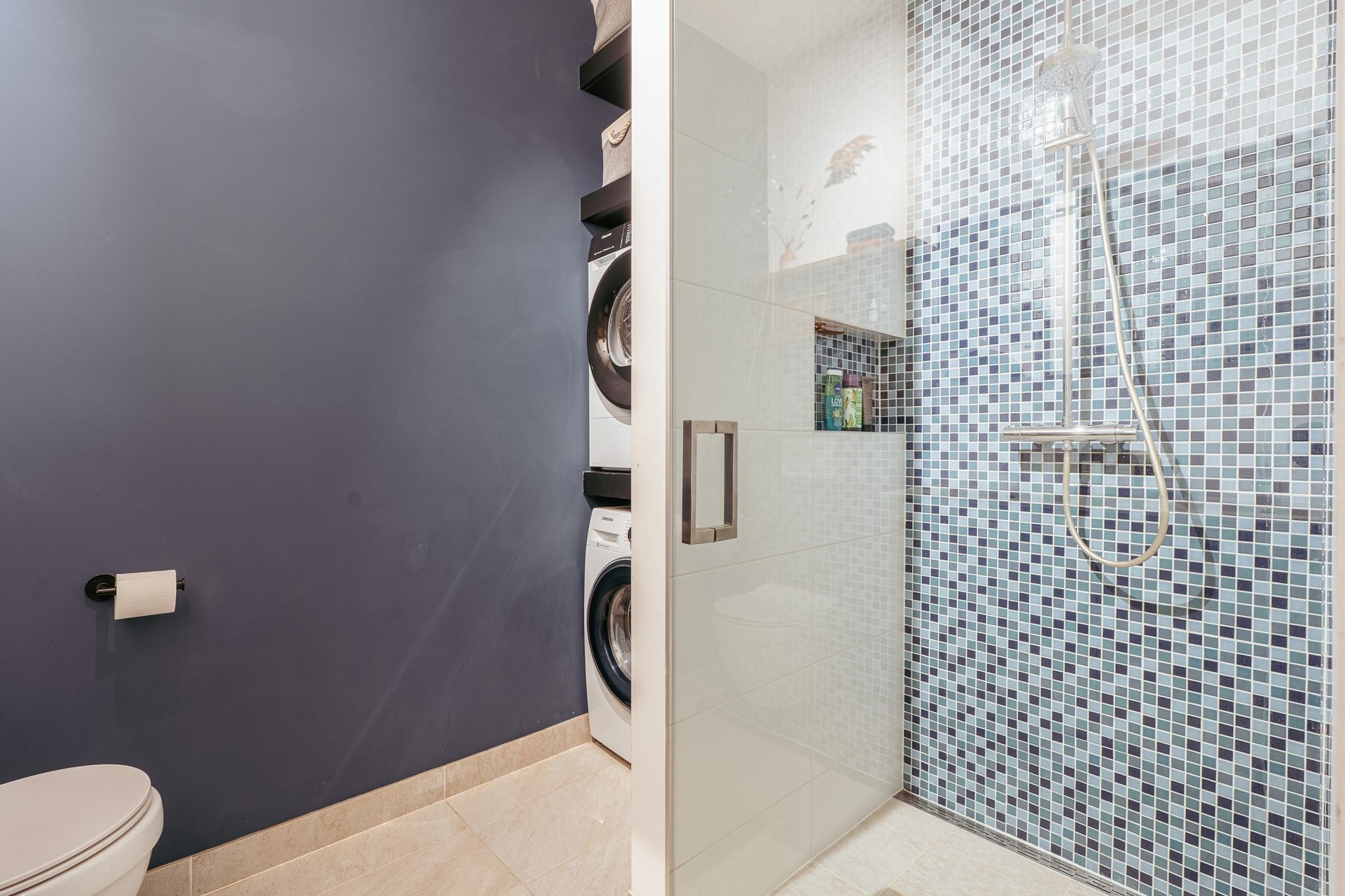 De badkamer is in 2019 volledig vernieuwd en is praktisch en stijlvol ingericht met een ruime inloopdouche met glazen deur, een dubbel wastafelmeubel en toilet. Slim ontworpen zwevende wandplanken bieden ruimte voor wasmachine en droger, zodat alles netjes is weggewerkt.