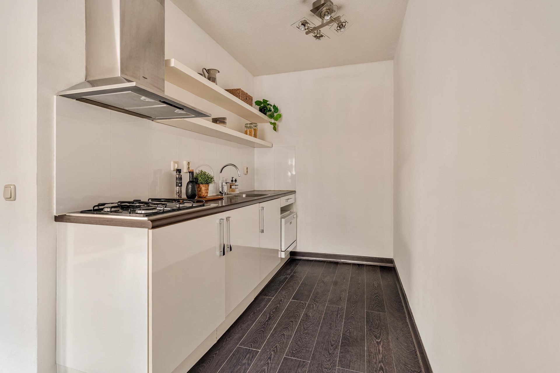 Via de centrale entree met lift en trappenhuis bereik je de woning op de tweede verdieping. De hal geeft toegang tot alle vertrekken. Aan de voorzijde ligt de lichte woonkamer, met grote raampartijen en een Frans balkon dat zorgt voor veel natuurlijke lichtinval. De open keuken is modern uitgevoerd en voorzien van diverse inbouwapparatuur, waaronder een vaatwasser, koelkast en gaskookplaat met afzuigkap.