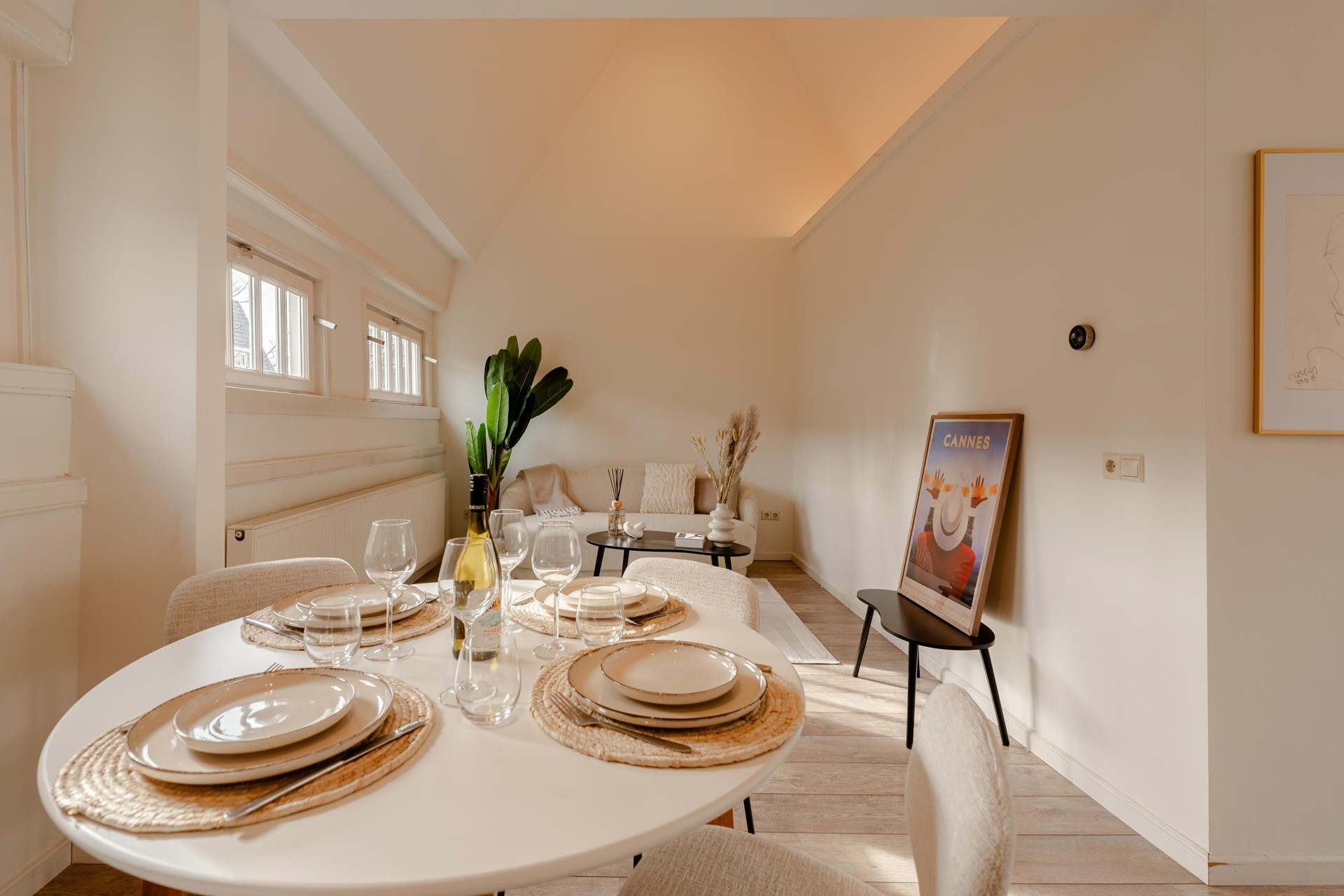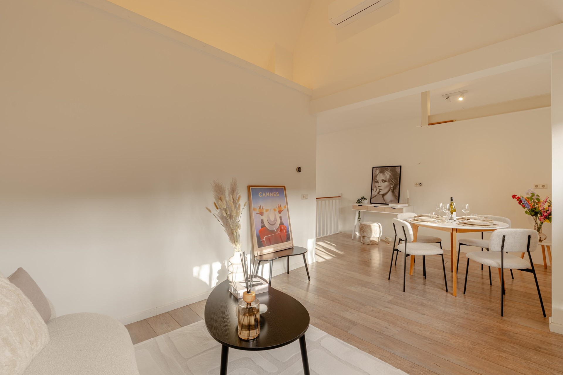 The living room is situated at the front and is particularly attractive thanks to its high ceiling up to the ridge, creating an impressive sense of space and light. This area is perfectly suited for a comfortable living and dining setup. Although the apartment currently does not have a kitchen, the wall next to the staircase offers an excellent opportunity for installing a modern wall-mounted kitchen. An alternative floor plan and artist’s impression have been prepared for this purpose; no rights can be derived from these.