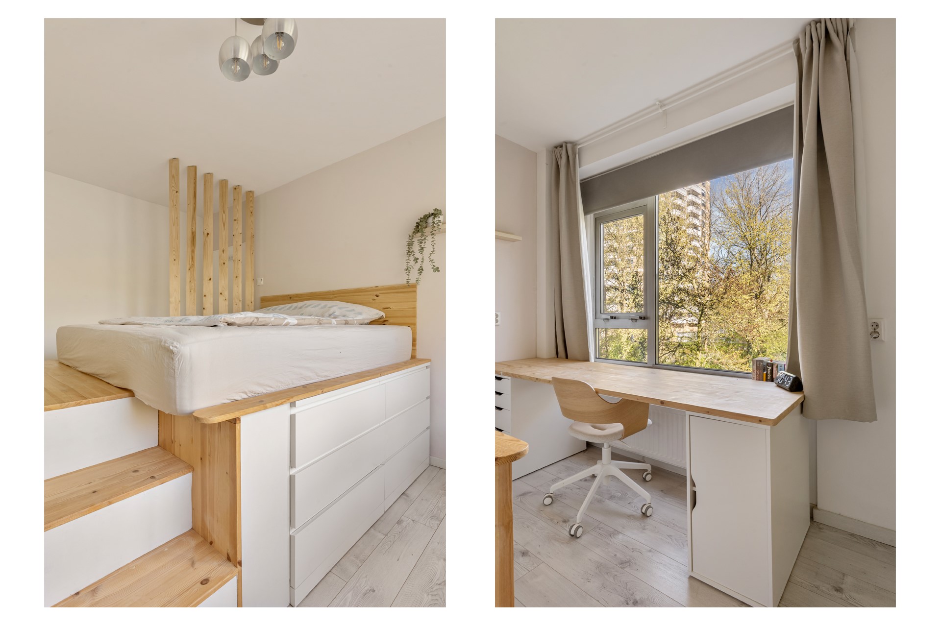 Het balkon ligt aan de rustige parkzijde en biedt een fijne plek om te ontspannen na een drukke werkdag, met uitzicht op het groen en volop privacy.