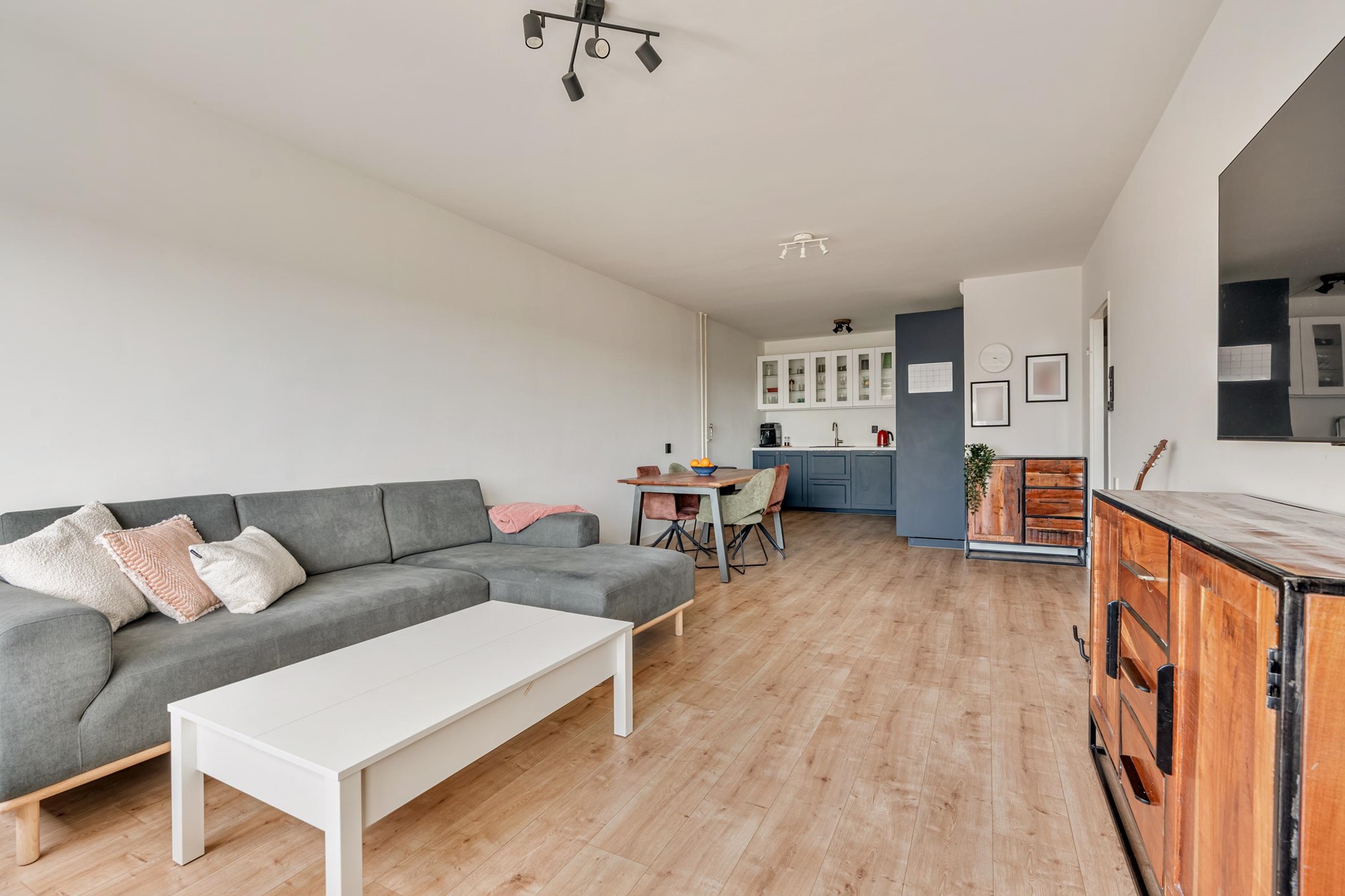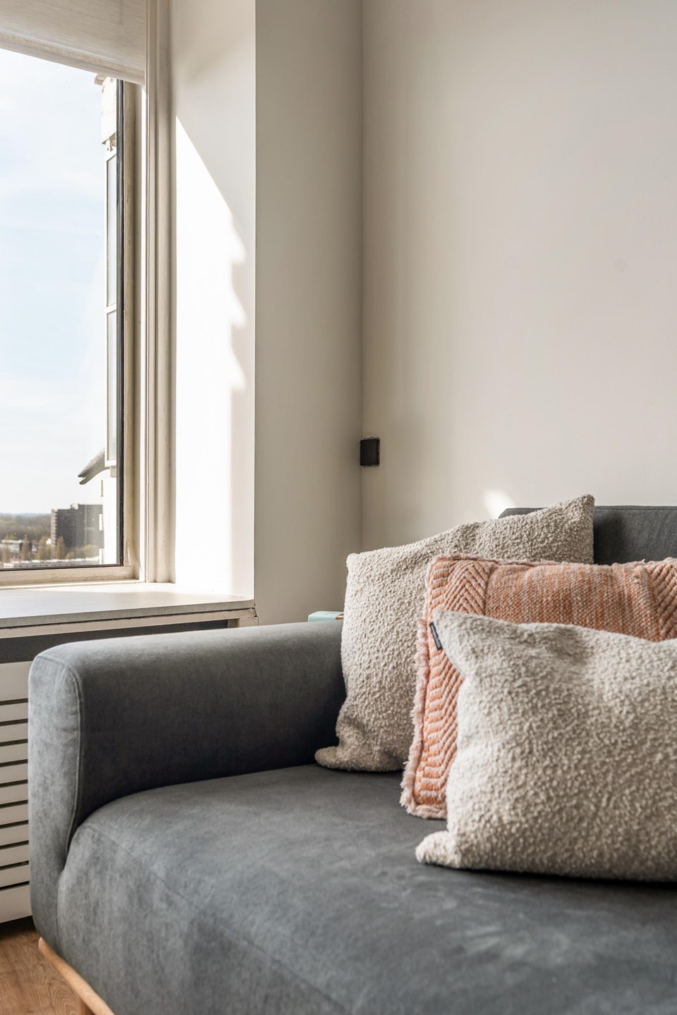 De ruime woonkamer is heerlijk licht dankzij de grote raampartijen en biedt een prachtig, vrij uitzicht over Amsterdam. Vanuit hier stap je zo het zonnige balkon op het westen op—ideaal om te genieten van de middag- en avondzon.