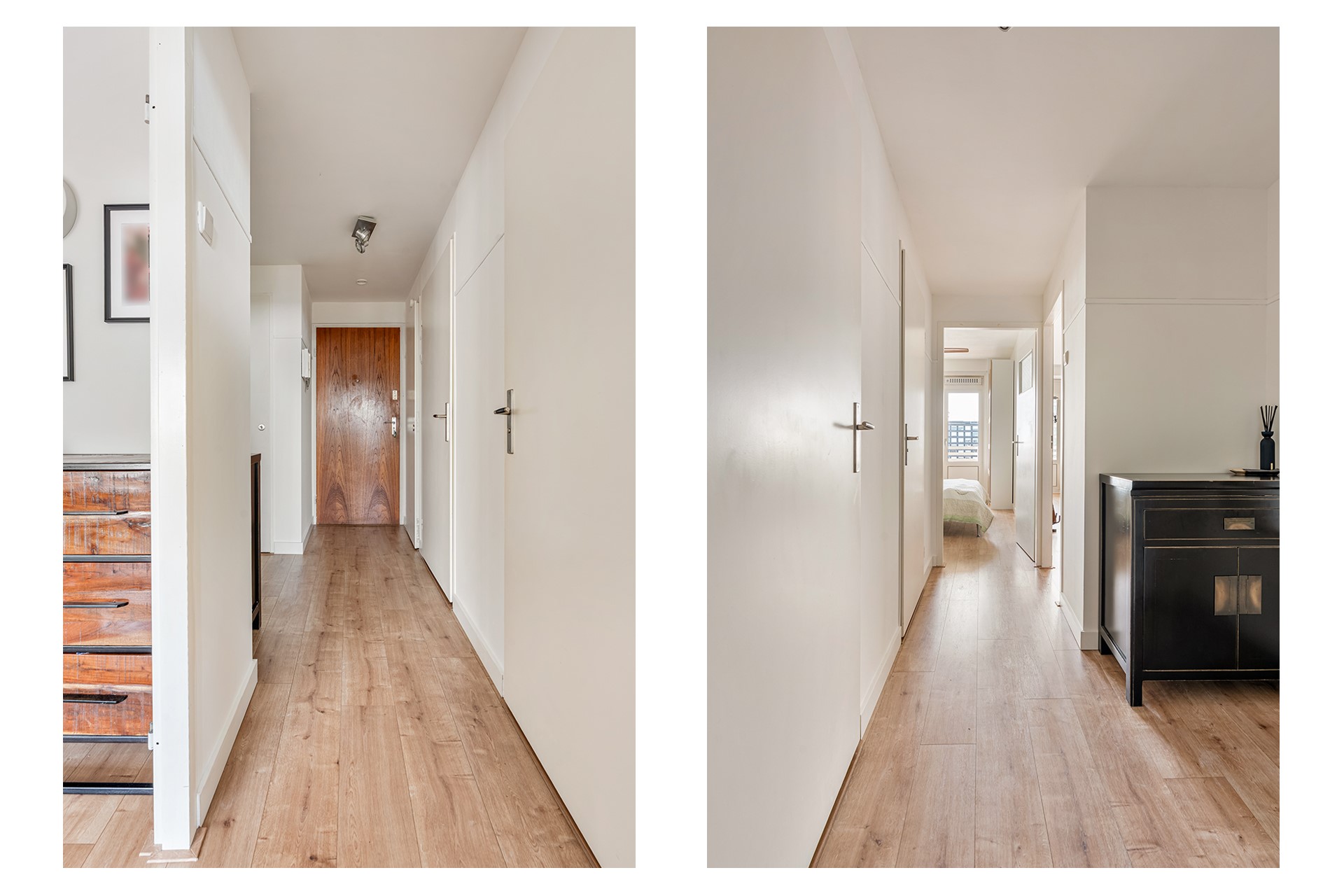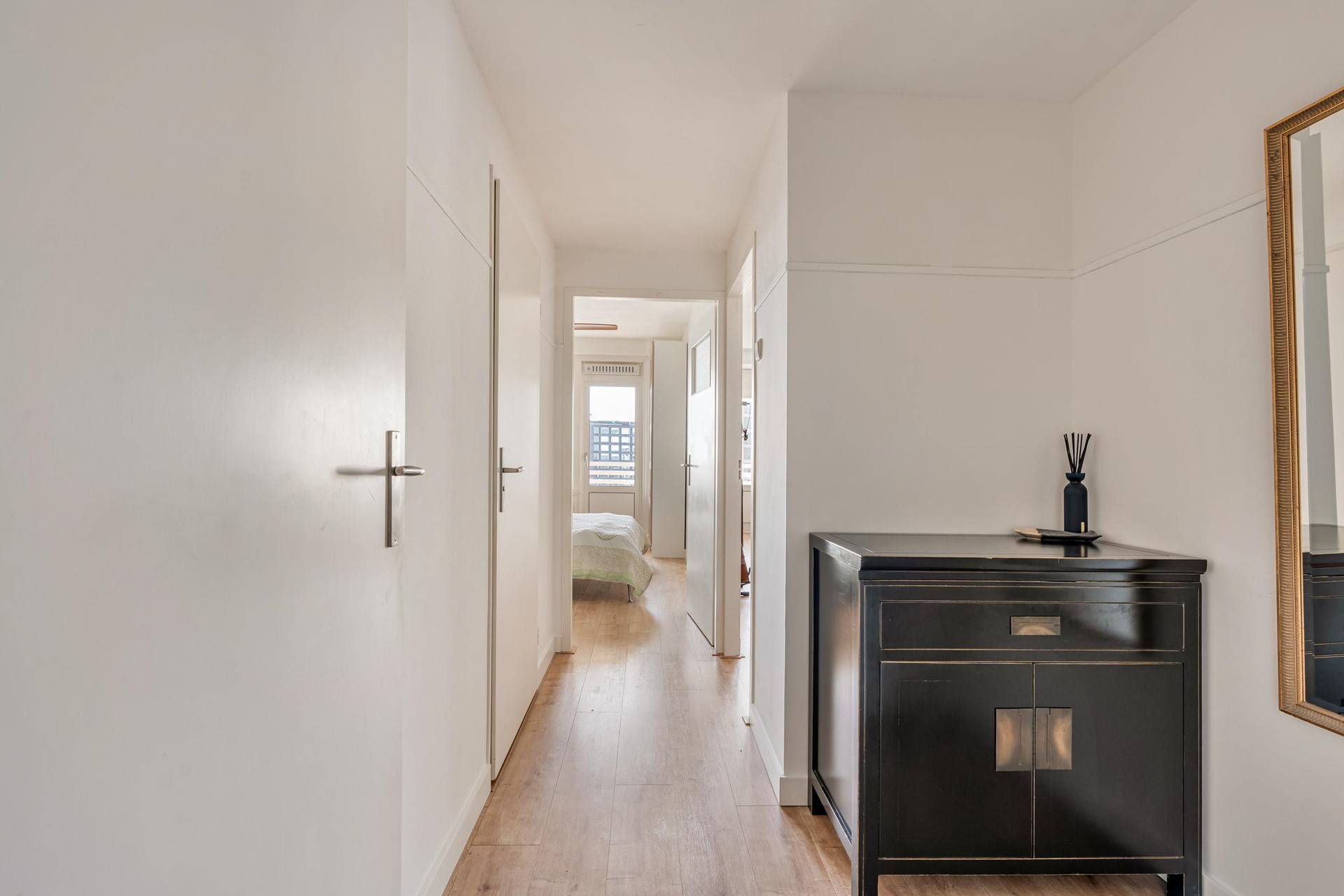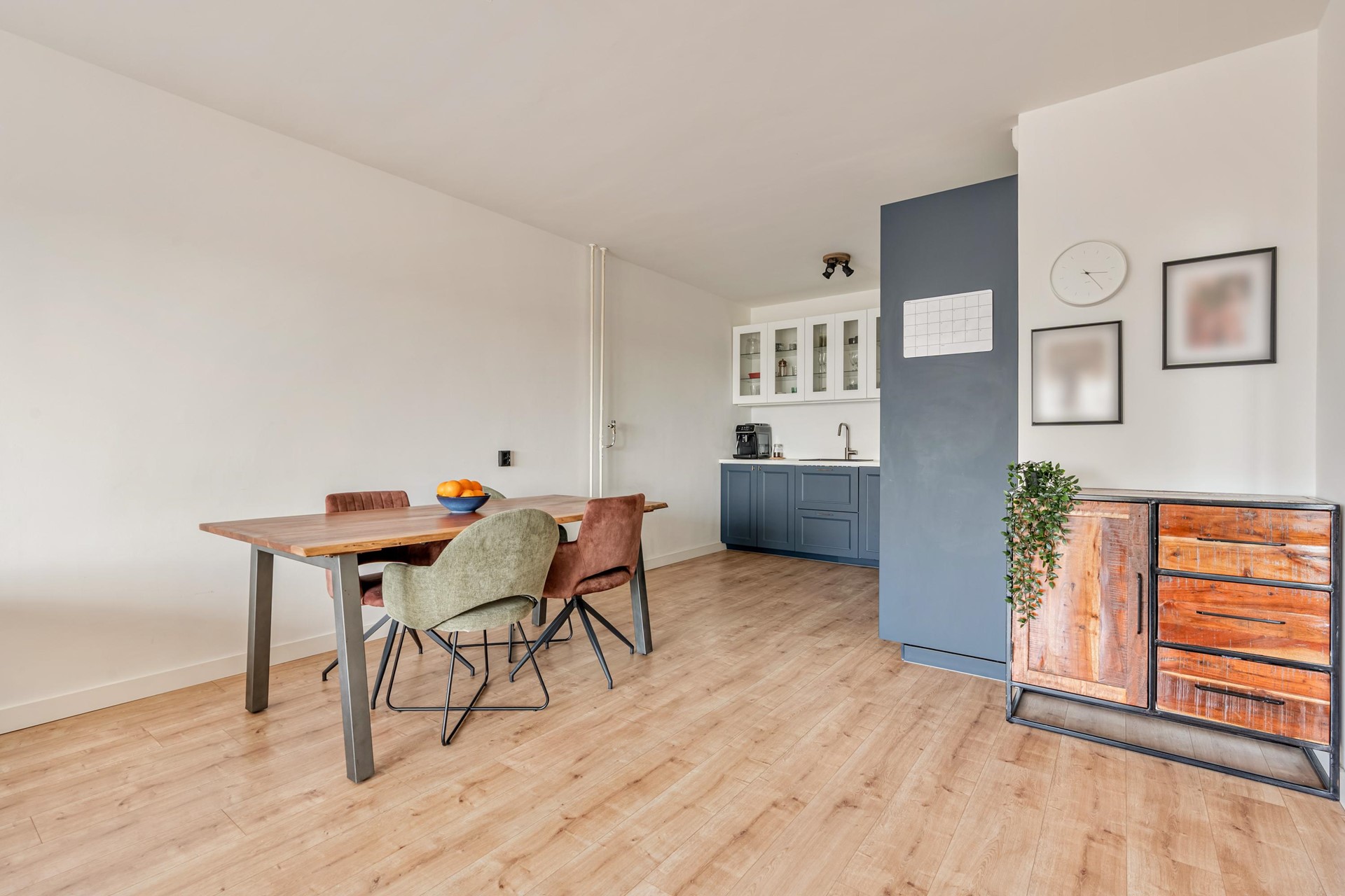 The spacious living room is filled with natural light thanks to large windows and offers beautiful, unobstructed views over Amsterdam. From here, you step onto the sunny west-facing balcony—ideal for enjoying afternoon and evening sun.