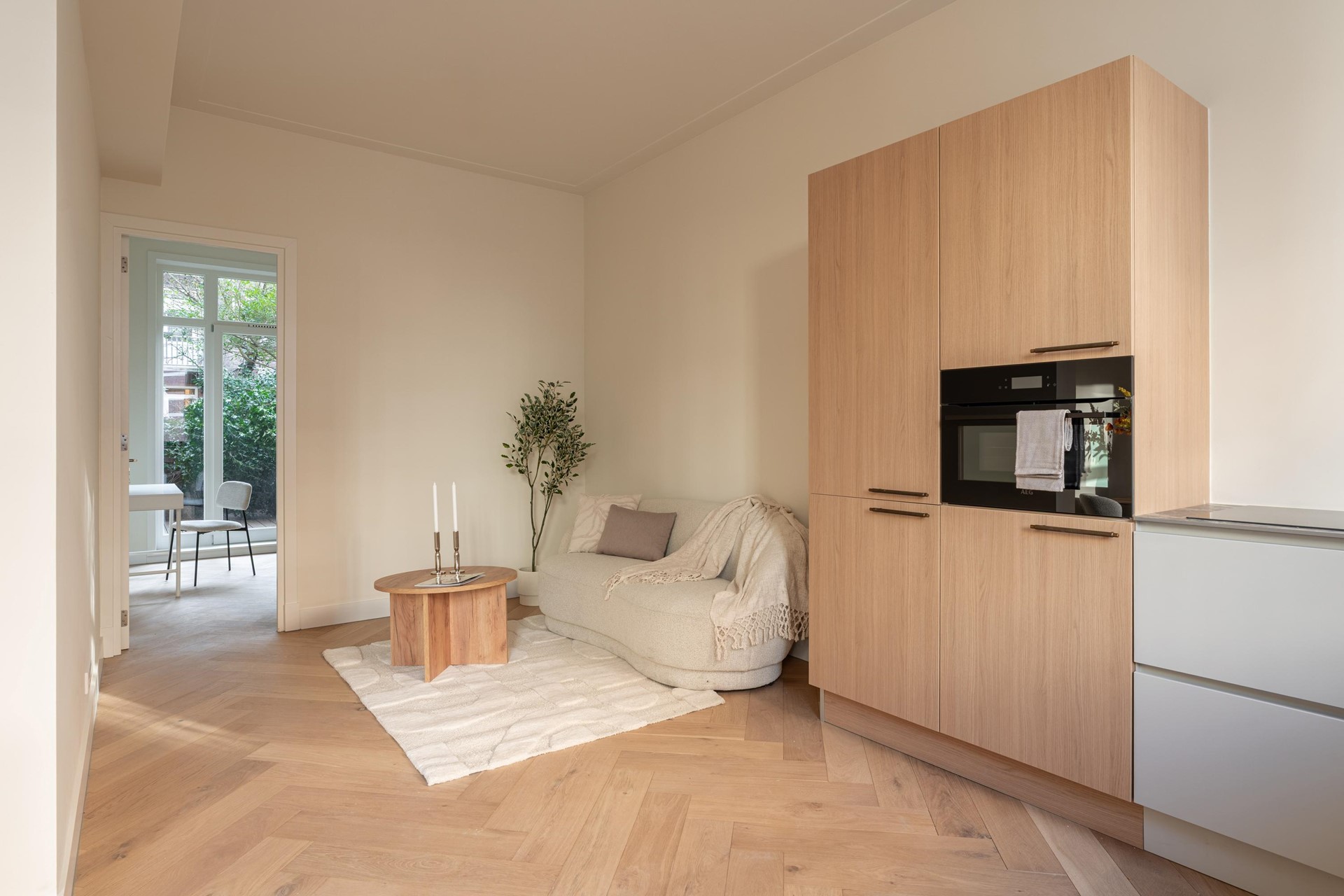 The apartment features two comfortable bedrooms, both located at the quiet rear side. From the bedrooms there is direct access to the generous private garden. This uniquely shaped garden offers plenty of privacy and space for multiple seating areas, making it an ideal place to relax, garden or enjoy long summer evenings.