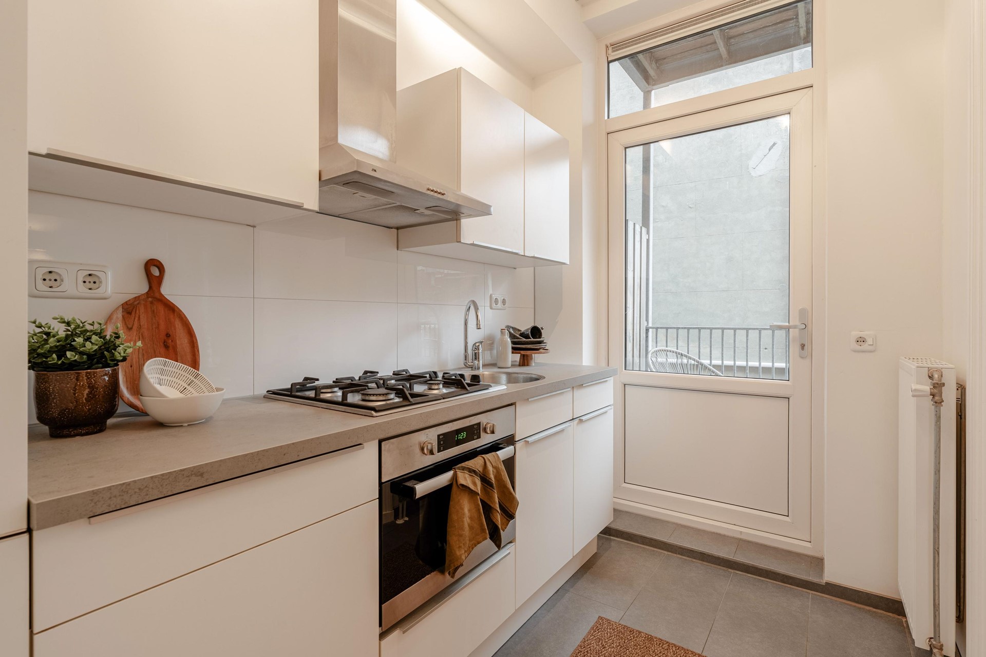De moderne keuken is praktisch ingedeeld en biedt toegang tot het verbrede balkon (ca. 9,7 m²) dat uitkijkt over de rustige binnentuinen.