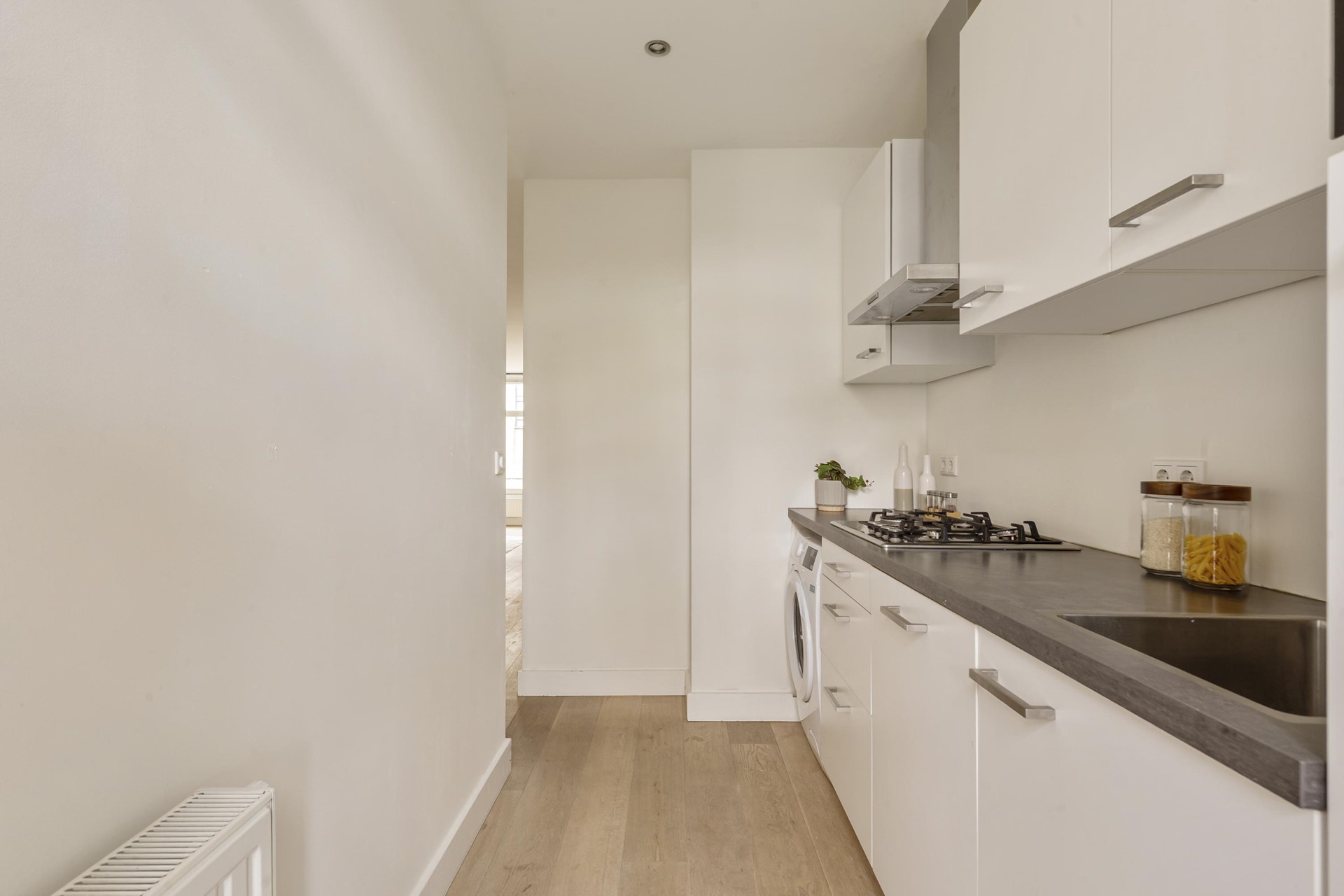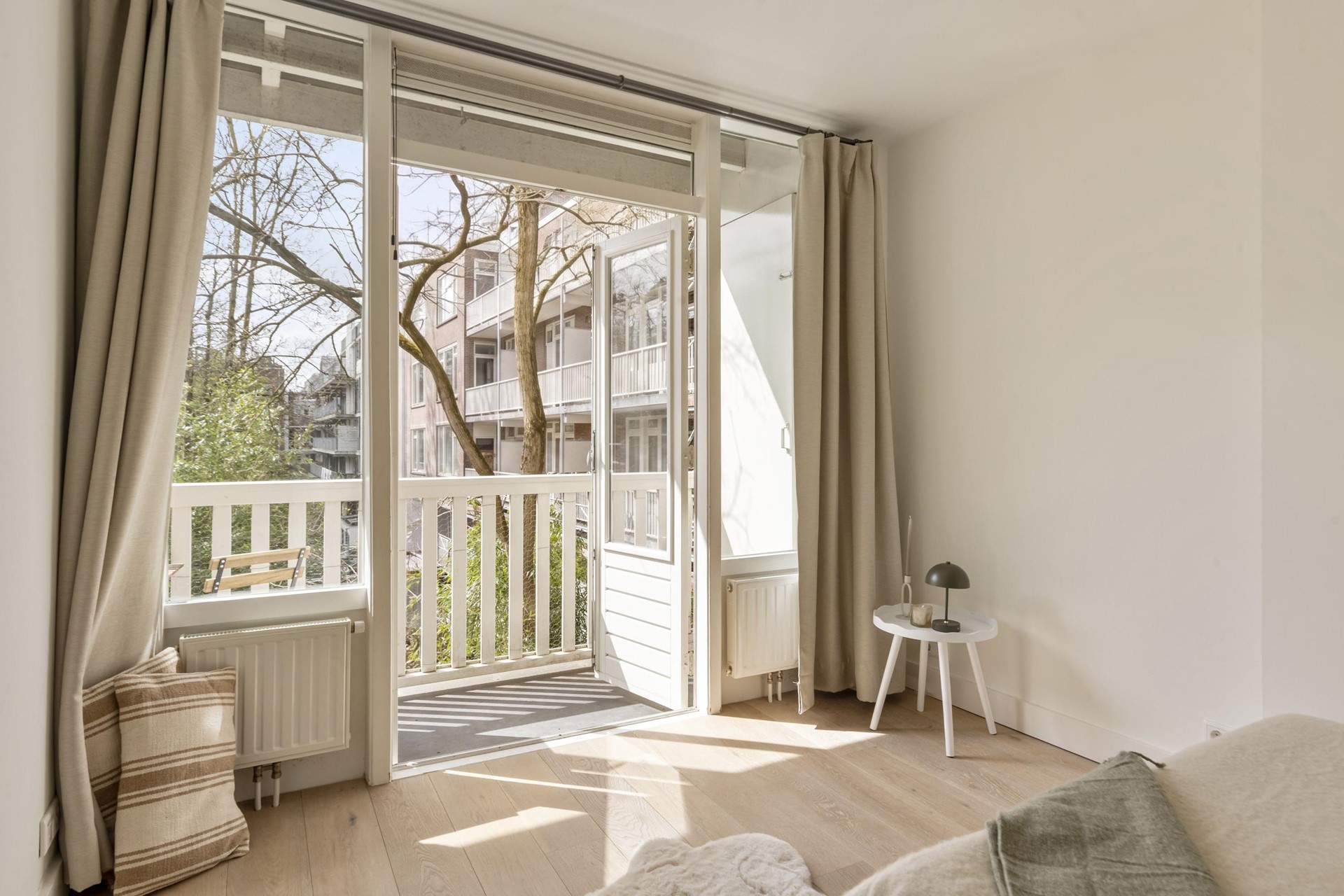 Aan de rustige achterzijde bevindt zich de slaapkamer. Deze kamer biedt een comfortabele plek om tot rust te komen en heeft directe toegang tot het balkon. Het balkon vormt een verlengstuk van de woning en biedt een fijne, beschutte buitenruimte.