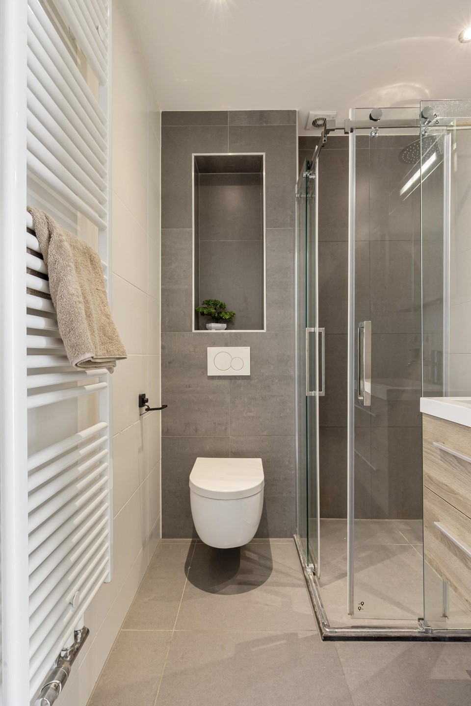Aan de voorzijde bevindt zich de lichte en uitnodigende woonkamer. De grote raampartijen zorgen voor een prettige lichtinval en geven de ruimte een open en aangename sfeer. Hier is voldoende plek voor een stijlvolle zithoek en een gezellige eettafel, ideaal voor zowel ontspannen avonden als het ontvangen van gasten. Aangrenzend ligt een separate kamer die zich perfect leent als werkkamer, logeerkamer of tweede slaapkamer.