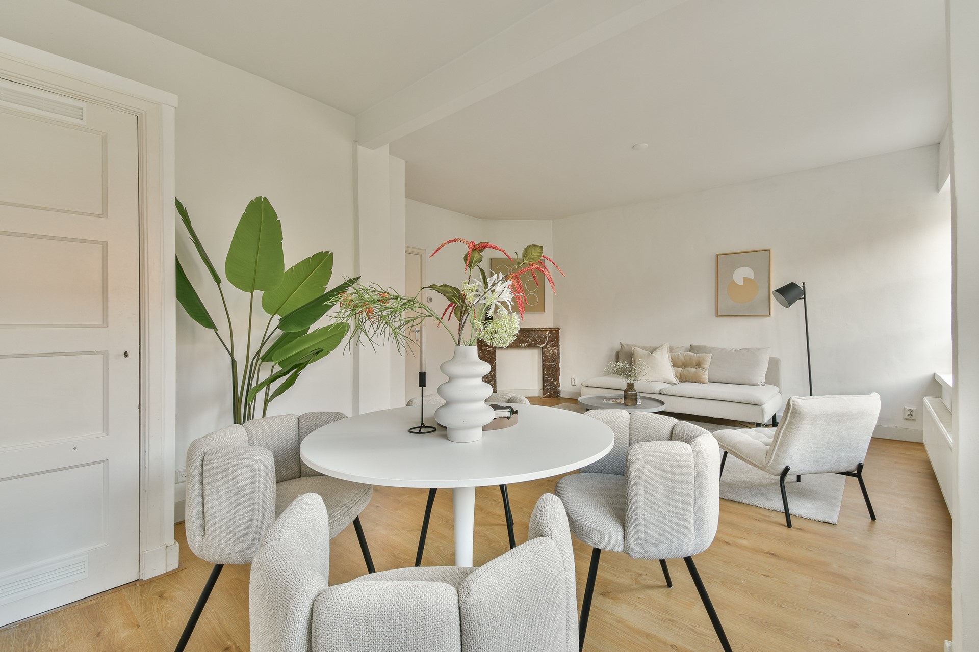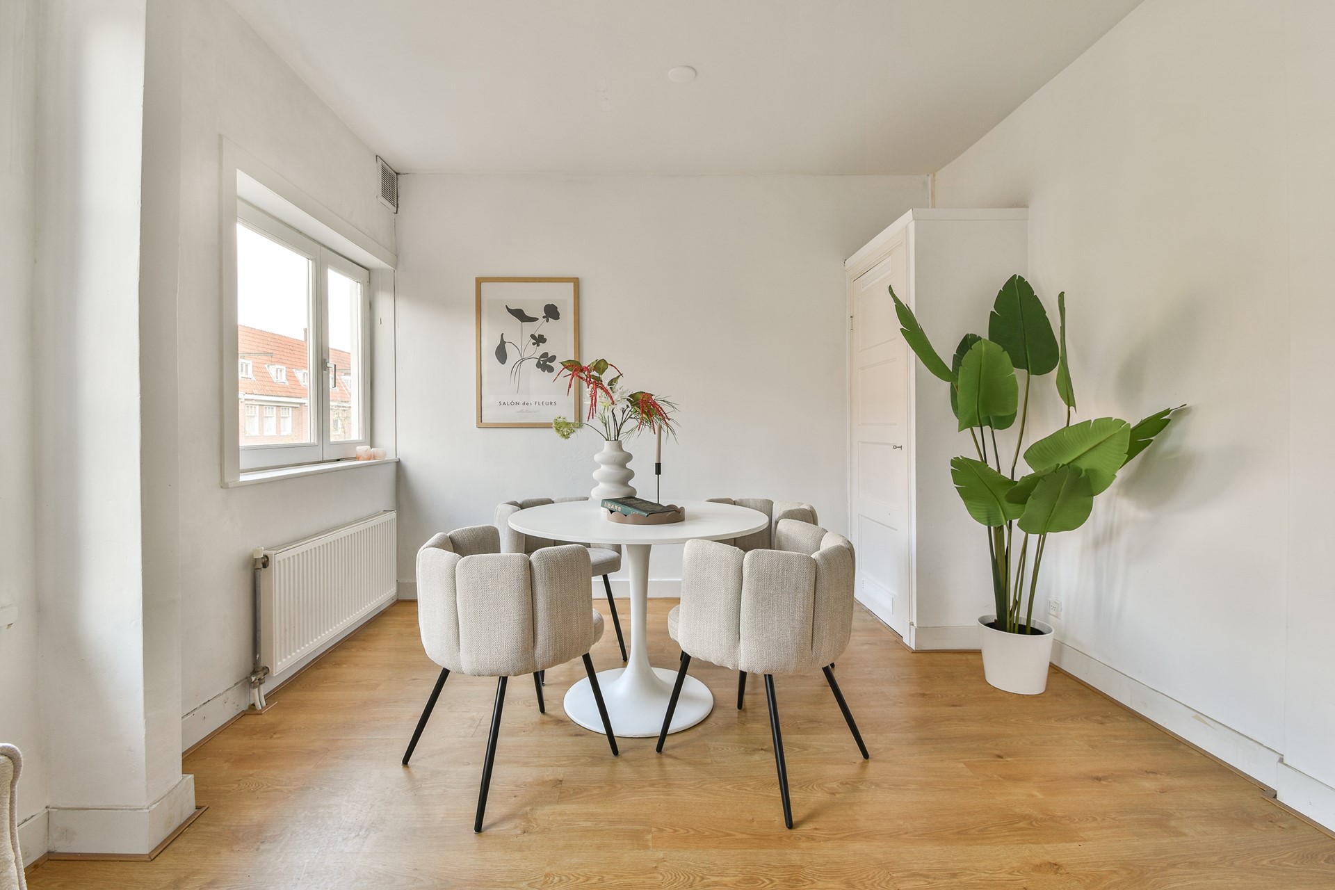 Aan de voorzijde van de woning bevindt zich de royale woonkamer met aangrenzende eetkamer. Dankzij de brede raampartijen valt hier de hele dag door veel natuurlijk licht naar binnen, wat zorgt voor een warme en uitnodigende sfeer. De eetkamer vormt een knusse plek voor lange diners en loopt soepel over in de woonkamer — ideaal voor wie graag ruim en flexibel wil inrichten. De hoogte van het plafond (2,66 m) draagt bij aan het gevoel van ruimte.