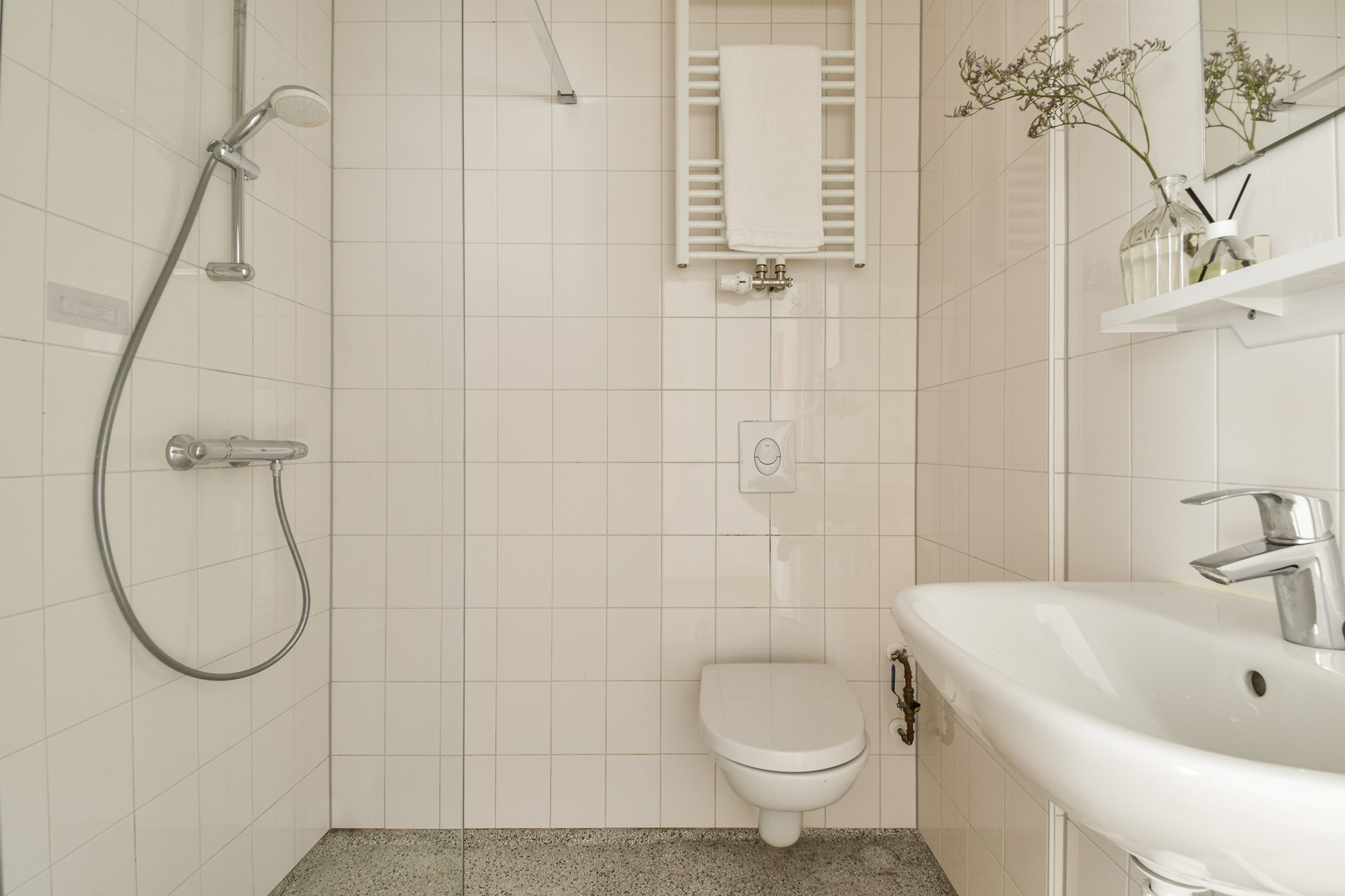 Aan de achterzijde van het appartement liggen twee slaapkamers, beide van goed formaat. De grootste slaapkamer kijkt uit op het balkon en opent via dubbele deuren naar buiten – perfect voor warme dagen waarop je de kamer wilt doortrekken naar buiten. De tweede slaapkamer is eveneens licht en ideaal als hoofdslaapkamer, logeerkamer of werkruimte. De badkamer is netjes betegeld en voorzien van een douche, wastafel en toilet. Daarnaast vind je in de hal nog een handige bergkast voor extra opslagruimte.