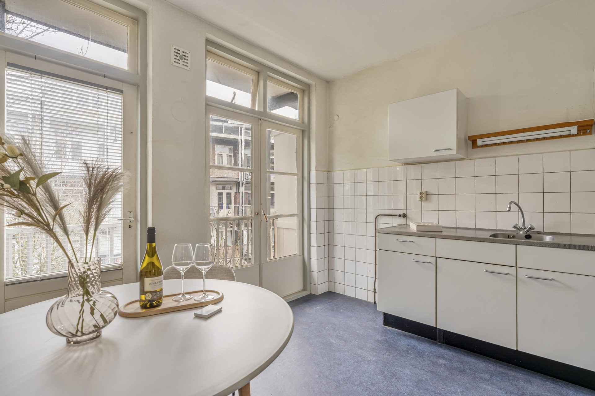 De keuken bevindt zich aan de achterzijde van de woning en biedt voldoende ruimte om een volwaardige woonkeuken te creëren. Er is plek voor een eettafel, waardoor dit een fijne ruimte wordt om te koken, eten en samen te komen. Vanuit de keuken is er directe toegang tot het balkon, wat deze ruimte extra aantrekkelijk maakt.
