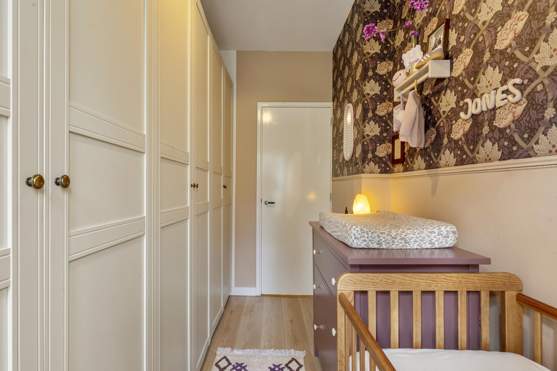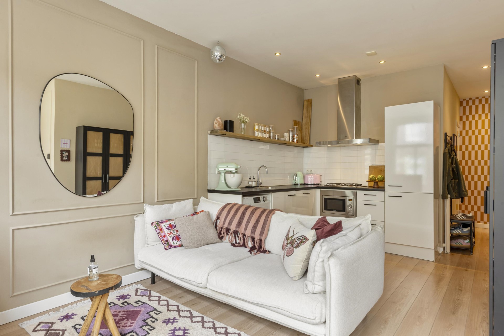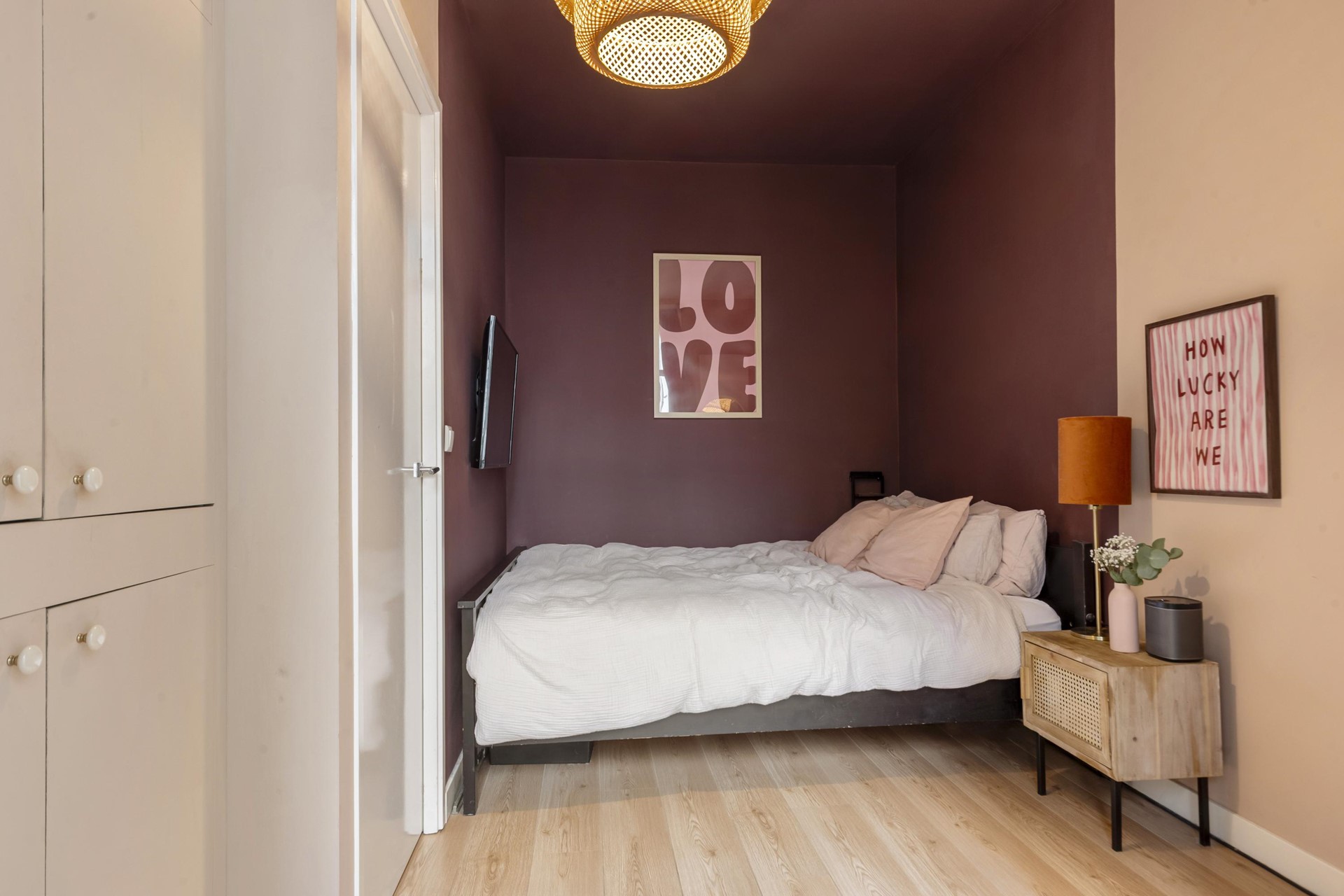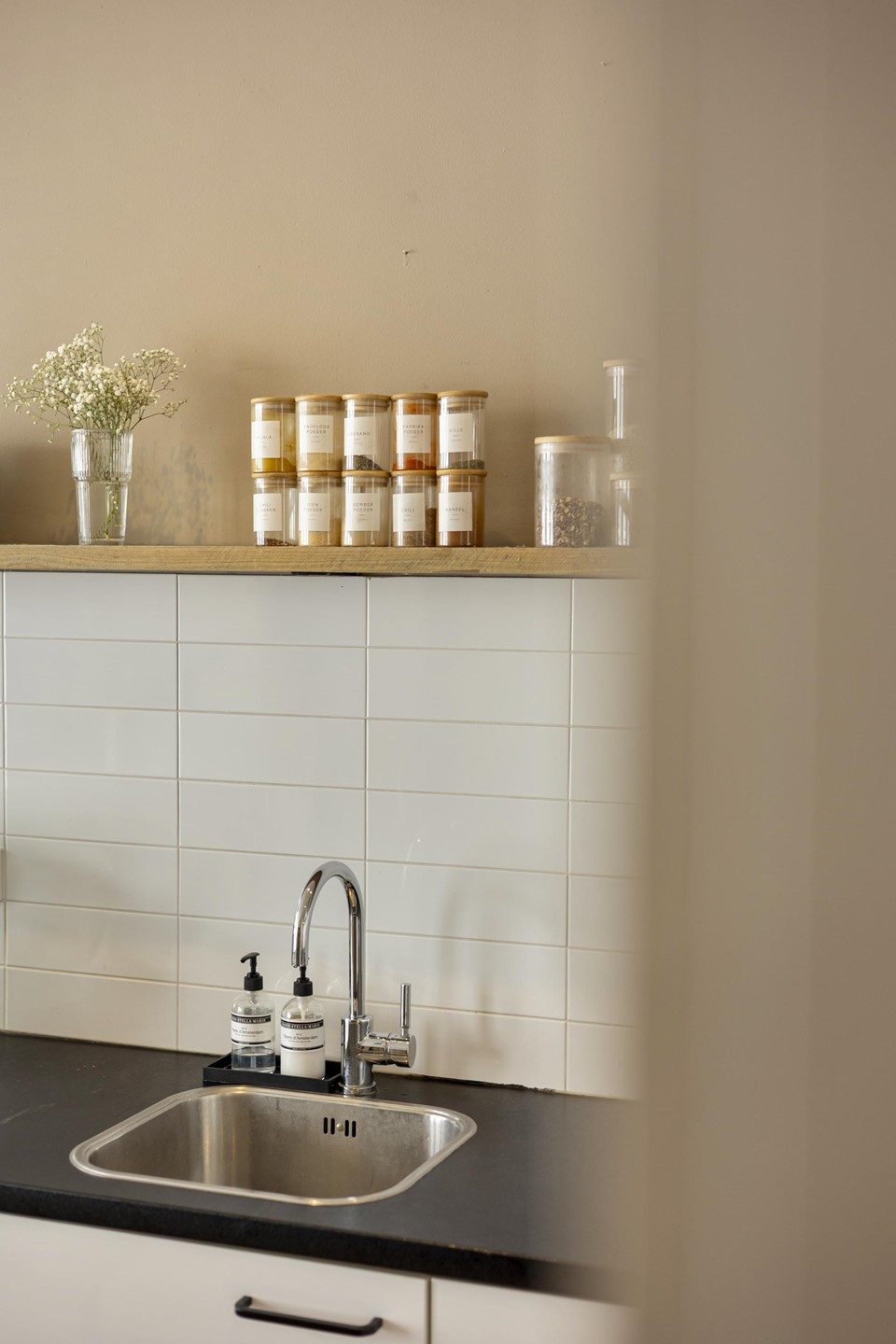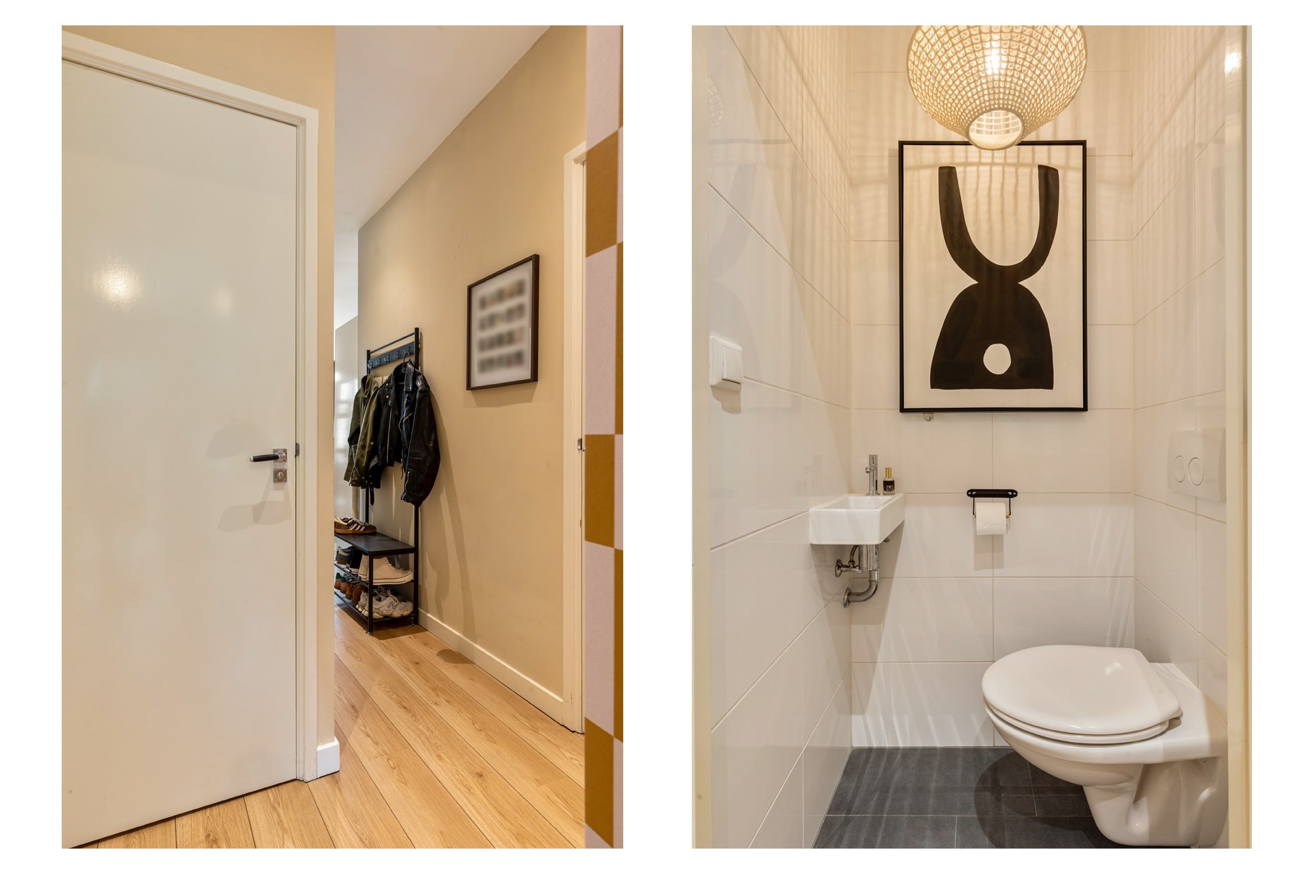 De woning maakt een verzorgde en eigentijdse indruk. Er is gekozen voor een rustige, warme kleurstelling met nette wandafwerking, sierlijsten/paneelaccenten in de woonkamer en een lichte vloerafwerking die het appartement een frisse en uitnodigende uitstraling geeft. De open keuken is strak uitgevoerd met witte fronten, een donker werkblad en ingebouwde apparatuur. Ook de badkamer oogt modern, met een glazen douchewand, grootformaat wandtegels en een wastafelmeubel in donkere tint. De slaapkamers zijn eveneens verzorgd afgewerkt en de tweede kamer beschikt over praktische kastruimte, waardoor de woning efficiënt en comfortabel in gebruik is.