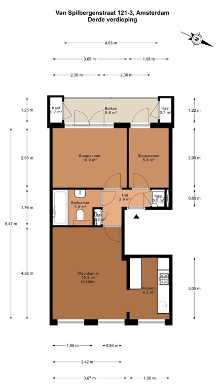 • Aantal kamers: 3 (waarvan 2 slaapkamers)