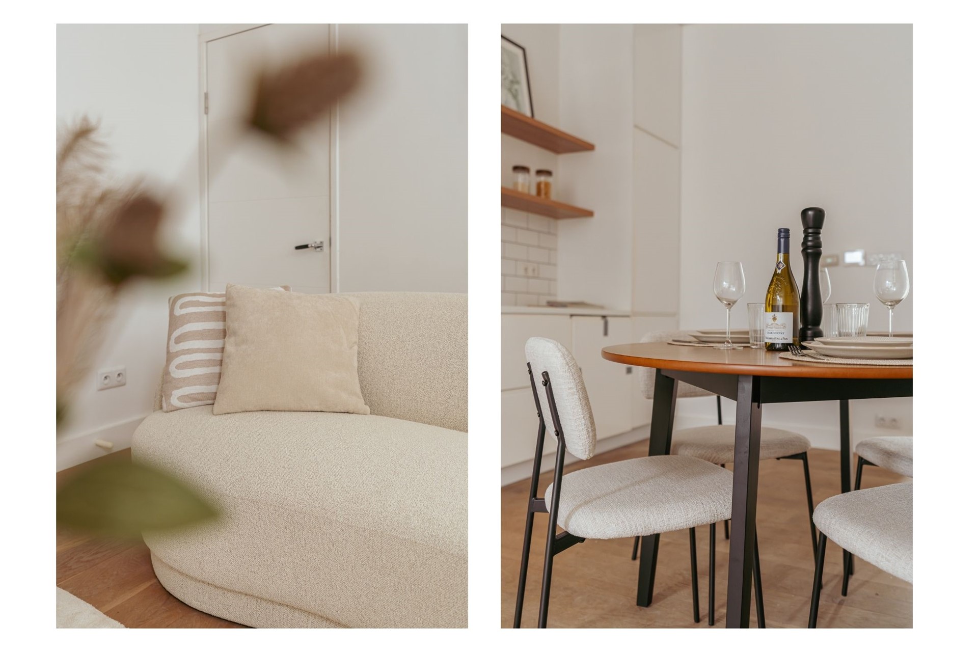 De keuken grenst direct aan de woonkamer en is slim ingedeeld, met moderne apparatuur en voldoende werkruimte. De lichte kleuren en open verbinding met de woonkamer maken dit een plek waar koken en samenzijn hand in hand gaan.