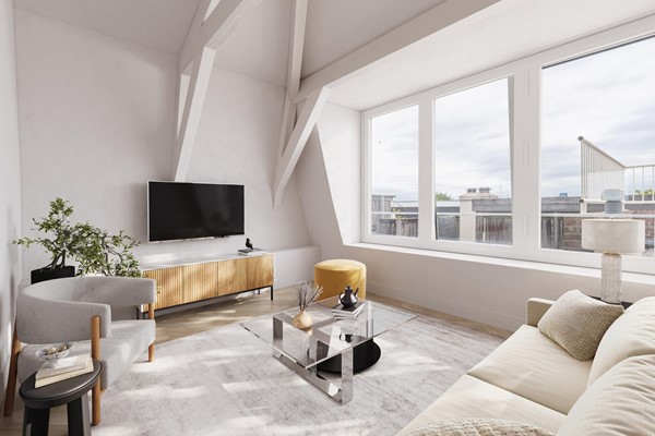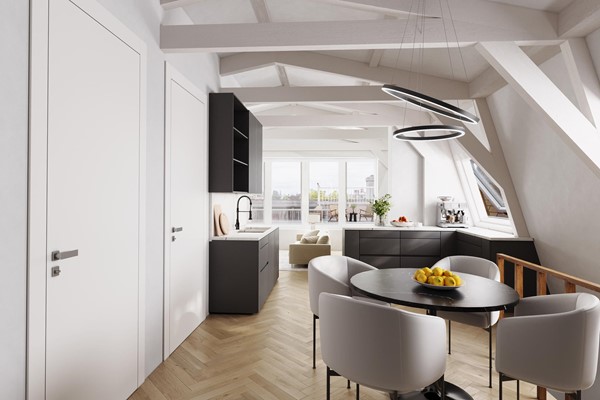Het driekamer appartement dat zich op de bovenste verdieping bevindt, is uniek van zichzelf. De installaties voor de keuken bevinden zich aan de achterzijde van de woning. Het appartement is speels ingedeeld waarbij veel licht de woning invalt. Vanuit deze plek bereik je ook het dakterras met uitzicht over het centrum van Amsterdam. Perfect op te dag door te brengen.