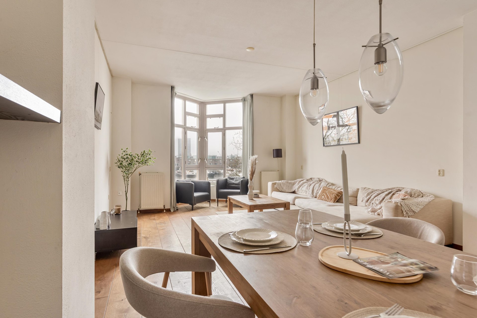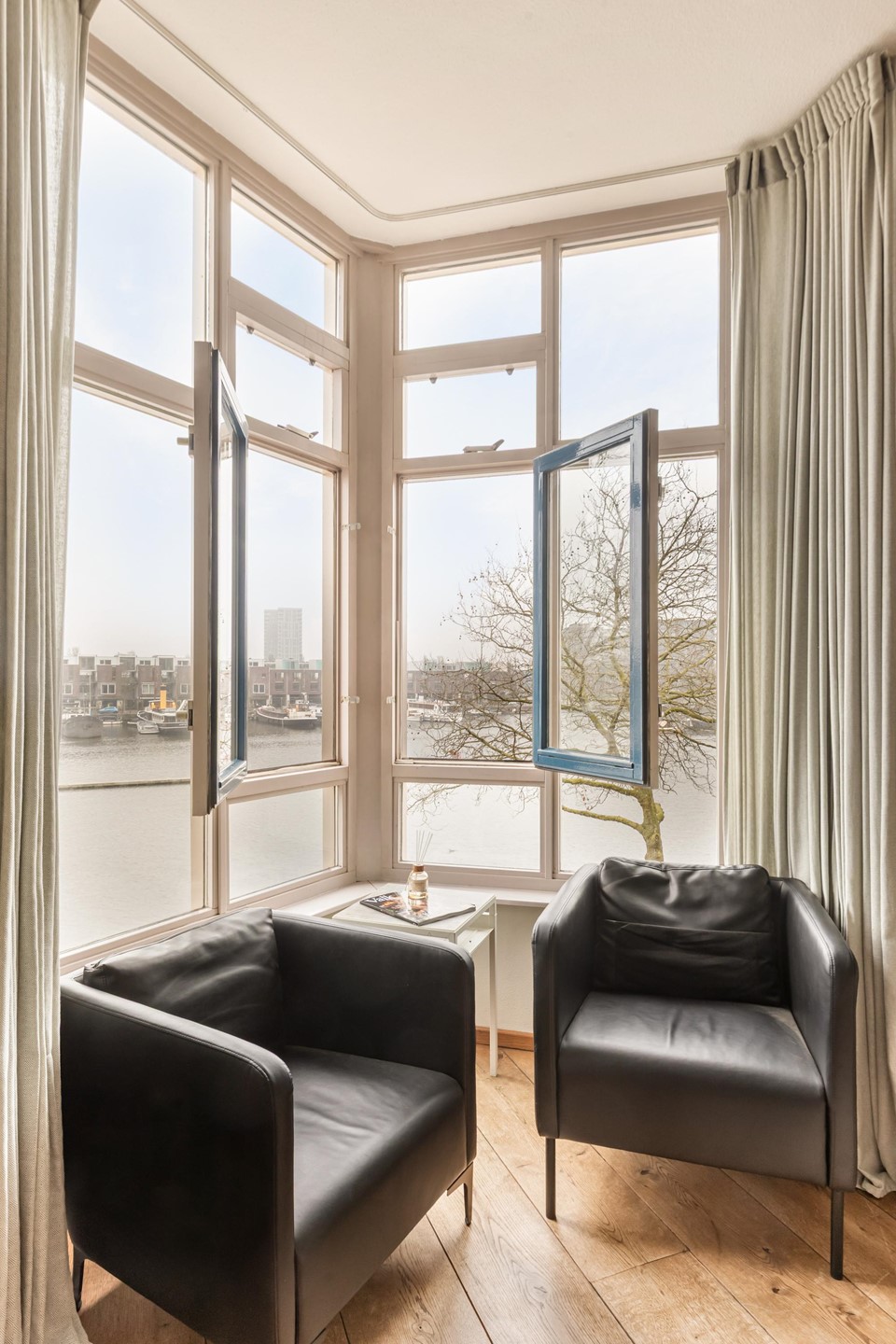 Characteristic and spacious double upper apartment with phenomenal views over the Entrepothaven, located in a former warehouse dating from approximately 1898 that was completely redeveloped around 1990 while retaining its monumental details. The combination of historical elements, ceilings up to approx. 3 meters high, large windows, and a striking bay window facing the water creates a unique living experience with abundant light and space. Includes a private parking space and external storage in the basement.