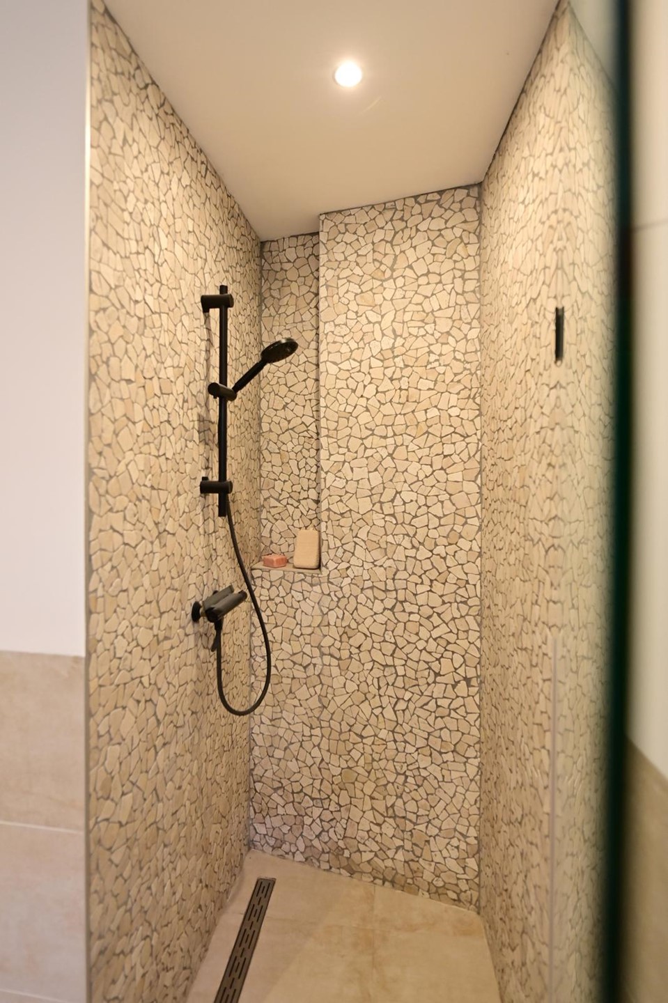 De moderne badkamer is voorzien van een inloopdouche, wastafelmeubel, vloerverwarming en aansluiting voor een wasmachine. Daarnaast is er een separaat toilet, wat extra comfort en privacy biedt.