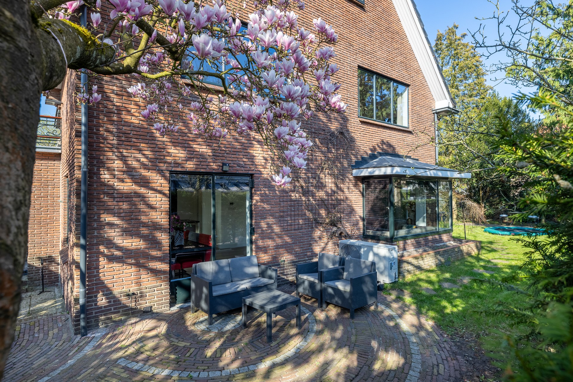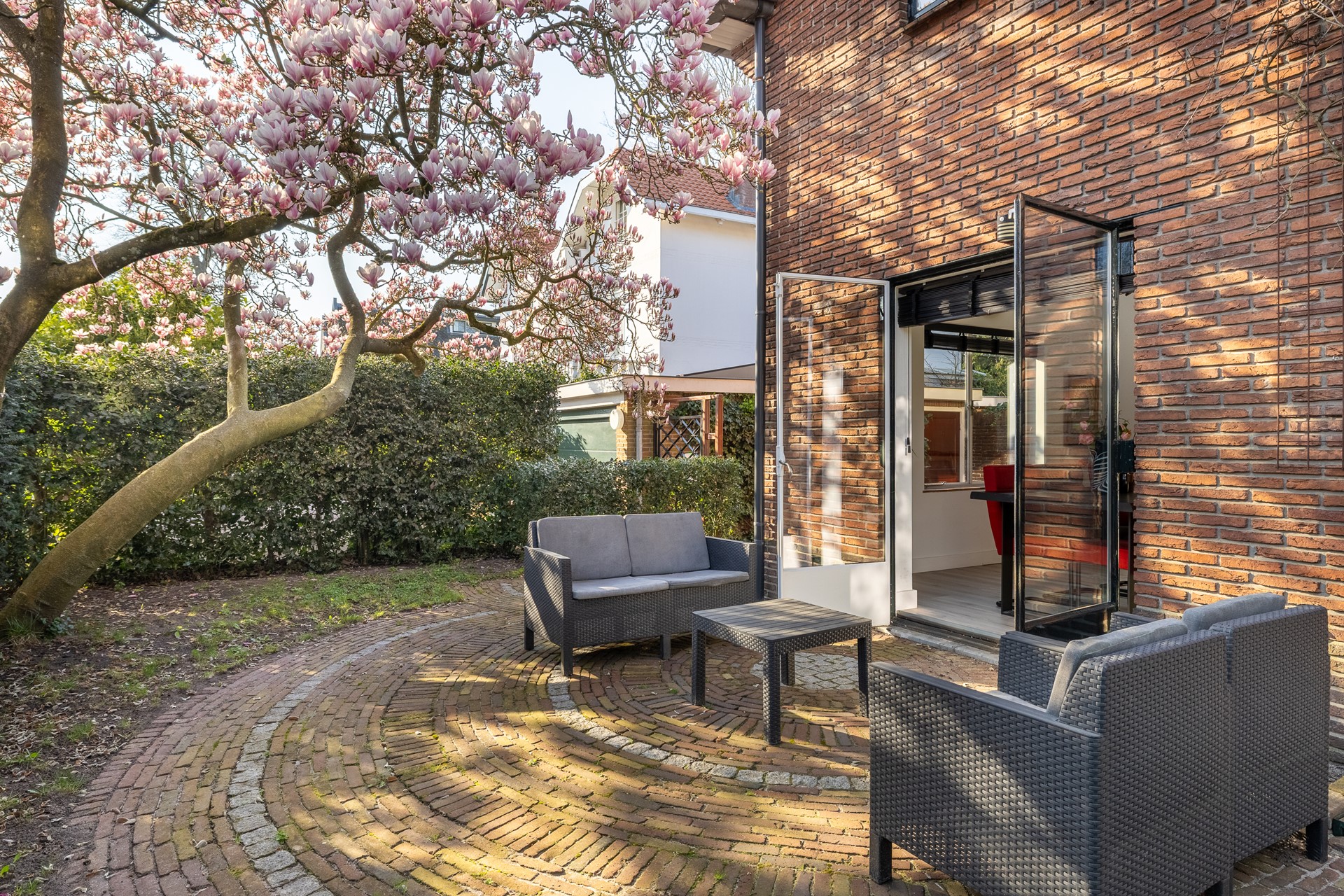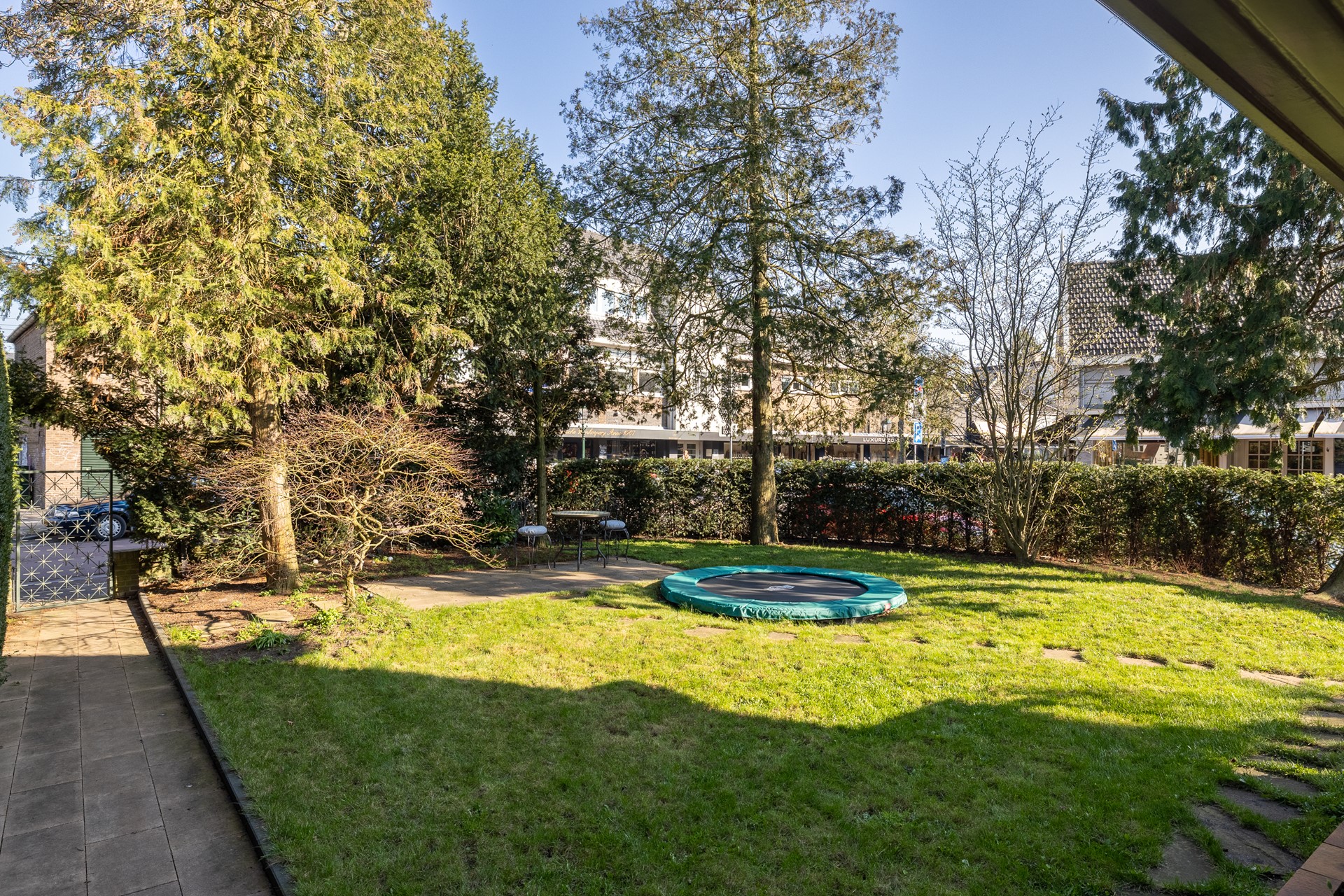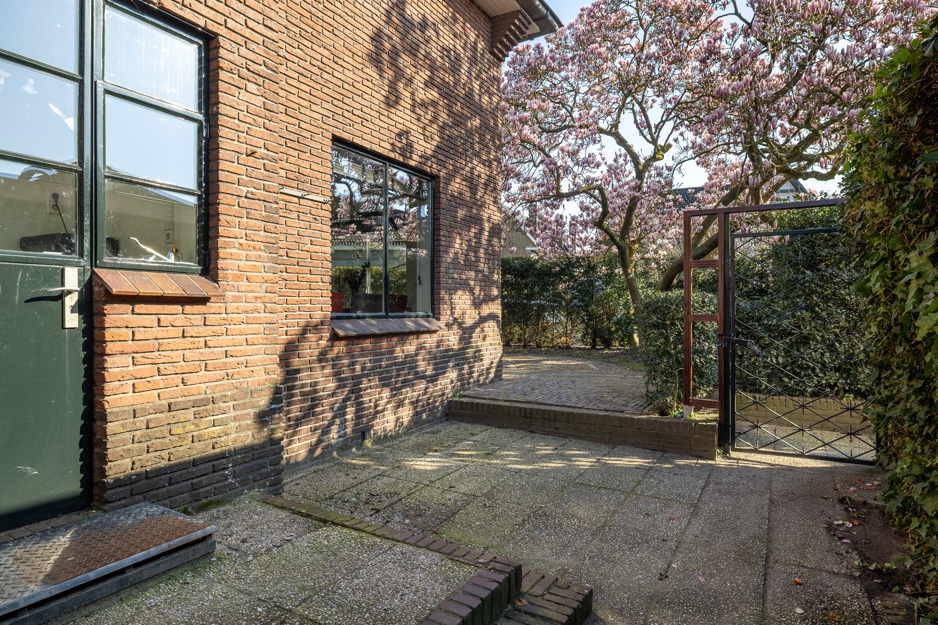 De tuin is een heerlijke ruime plek om te ontspannen. Met meerdere terrassen is er altijd wel een plekje in de zon of schaduw. Groen, beschut en ideaal voor lange zomeravonden of spelende kinderen. De zijgevel ligt zuid, de zon draait heerlijk de hele dag om het huis.