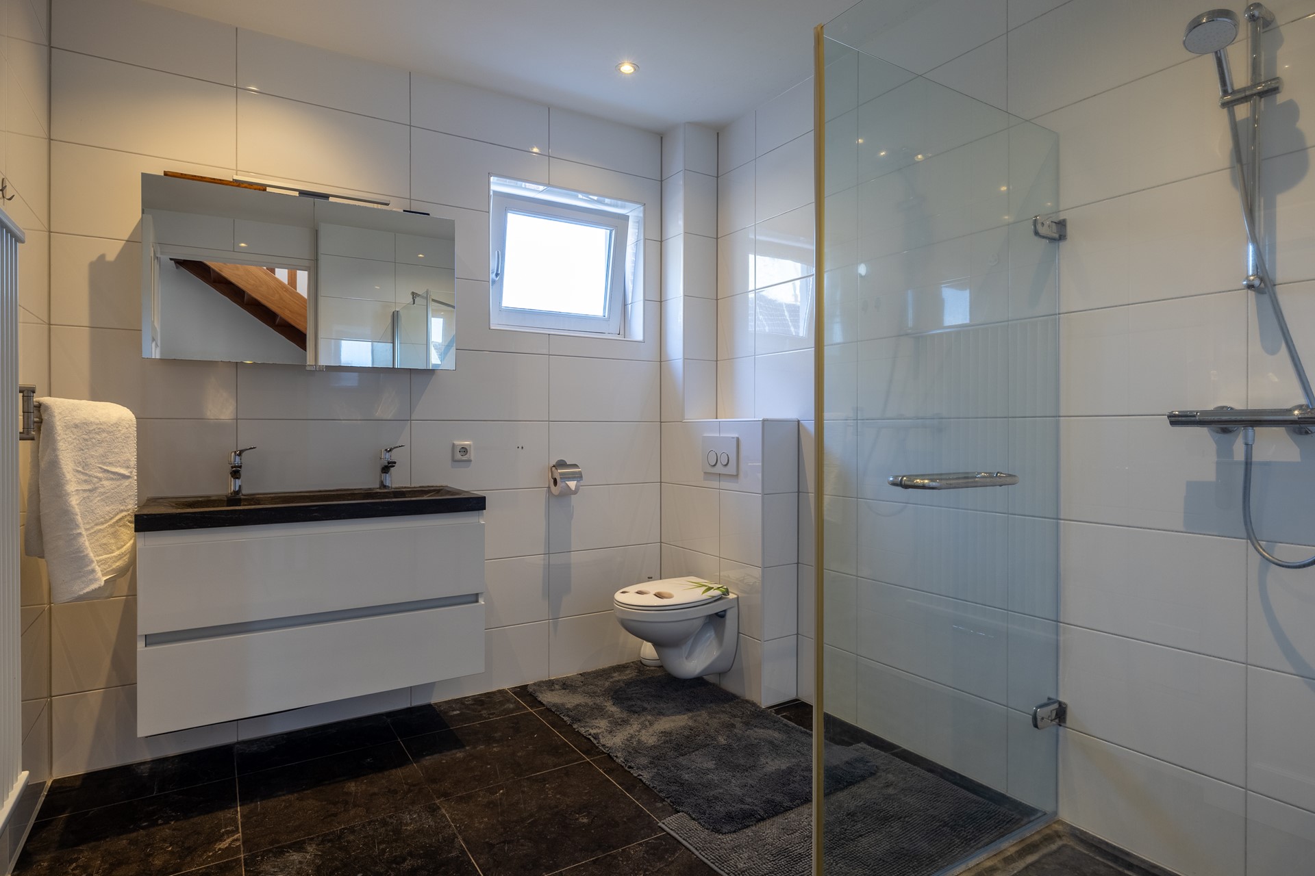 Overloop met toegang tot 1 royale slaapkamer en een 2e slaap/werk kamer. Badkamer voorzien van inloopdouche, wastafelmeubel en toilet. Aparte berging met wasmachine aansluiting en CV-ketel.