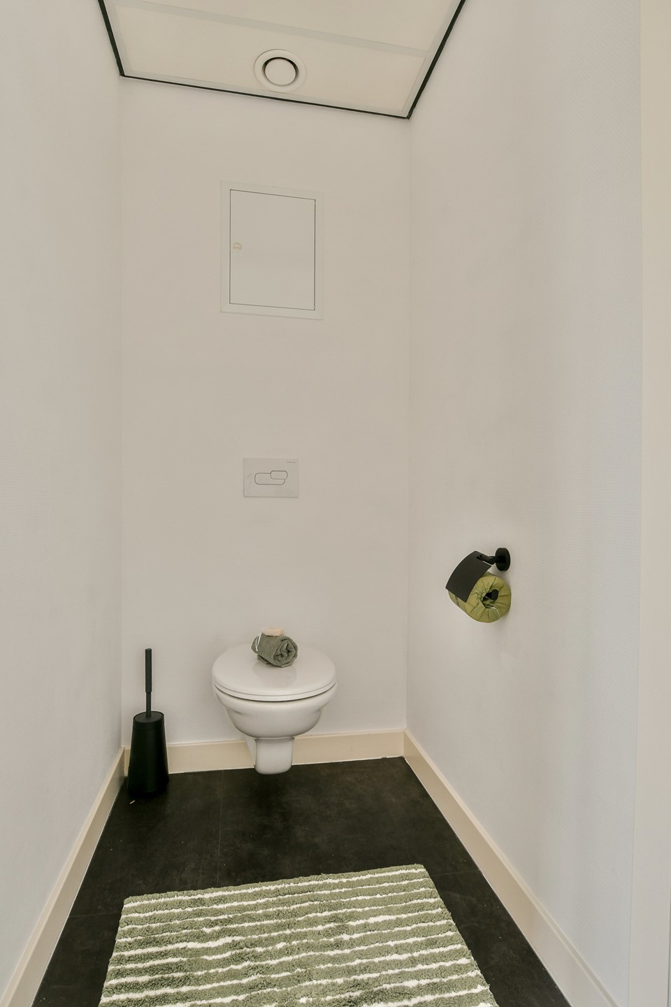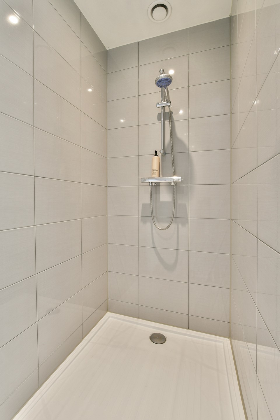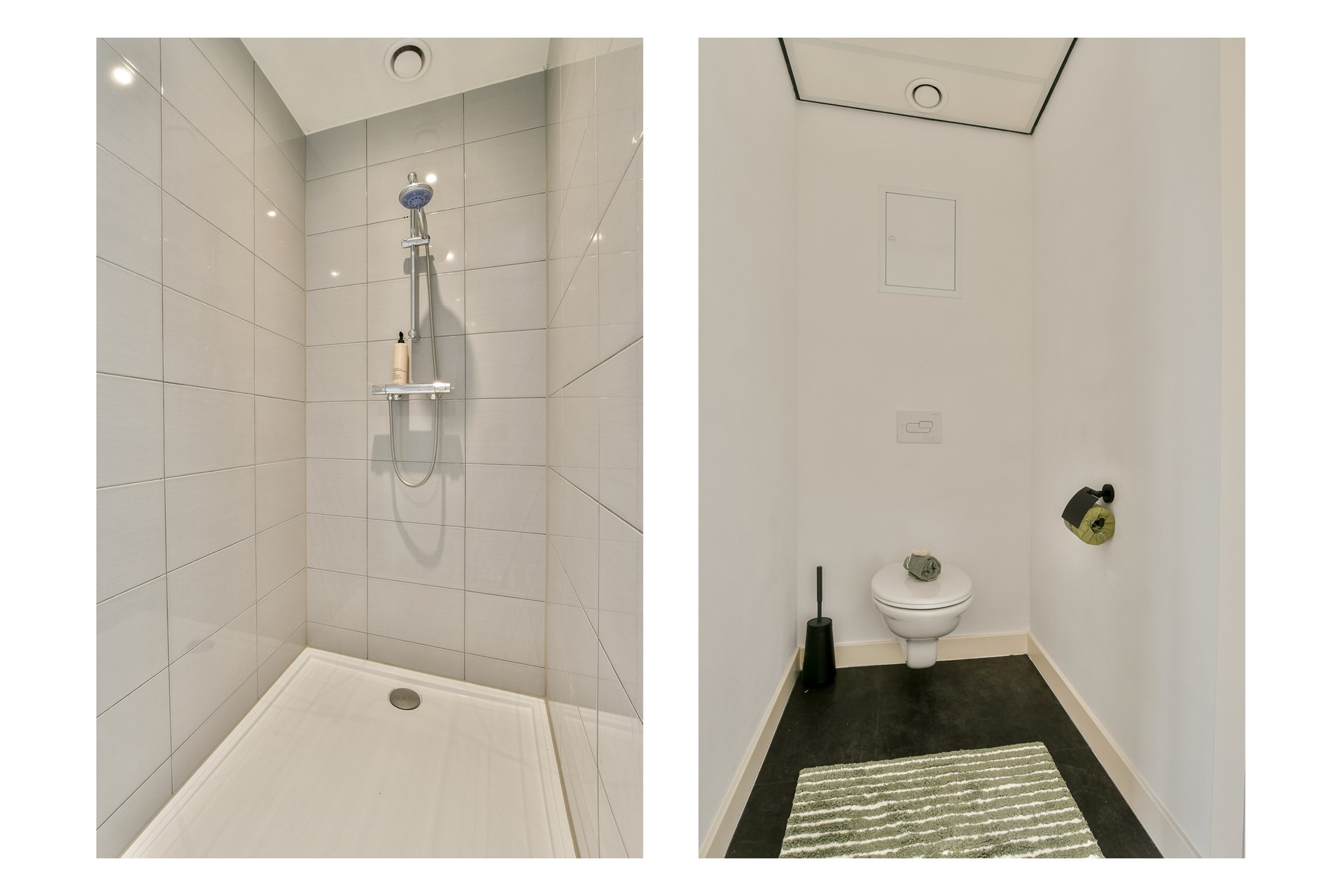 Aan de rustige achterzijde bevindt zich de slaapkamer, die dankzij de ligging en de frisse afwerking een heerlijke plek is om tot rust te komen en voorzien van een wastafel. Aansluitend vind je de badkamer, voorzien van een douche en heb je een separaat toilet, allemaal uitgevoerd in frisse, moderne tinten.